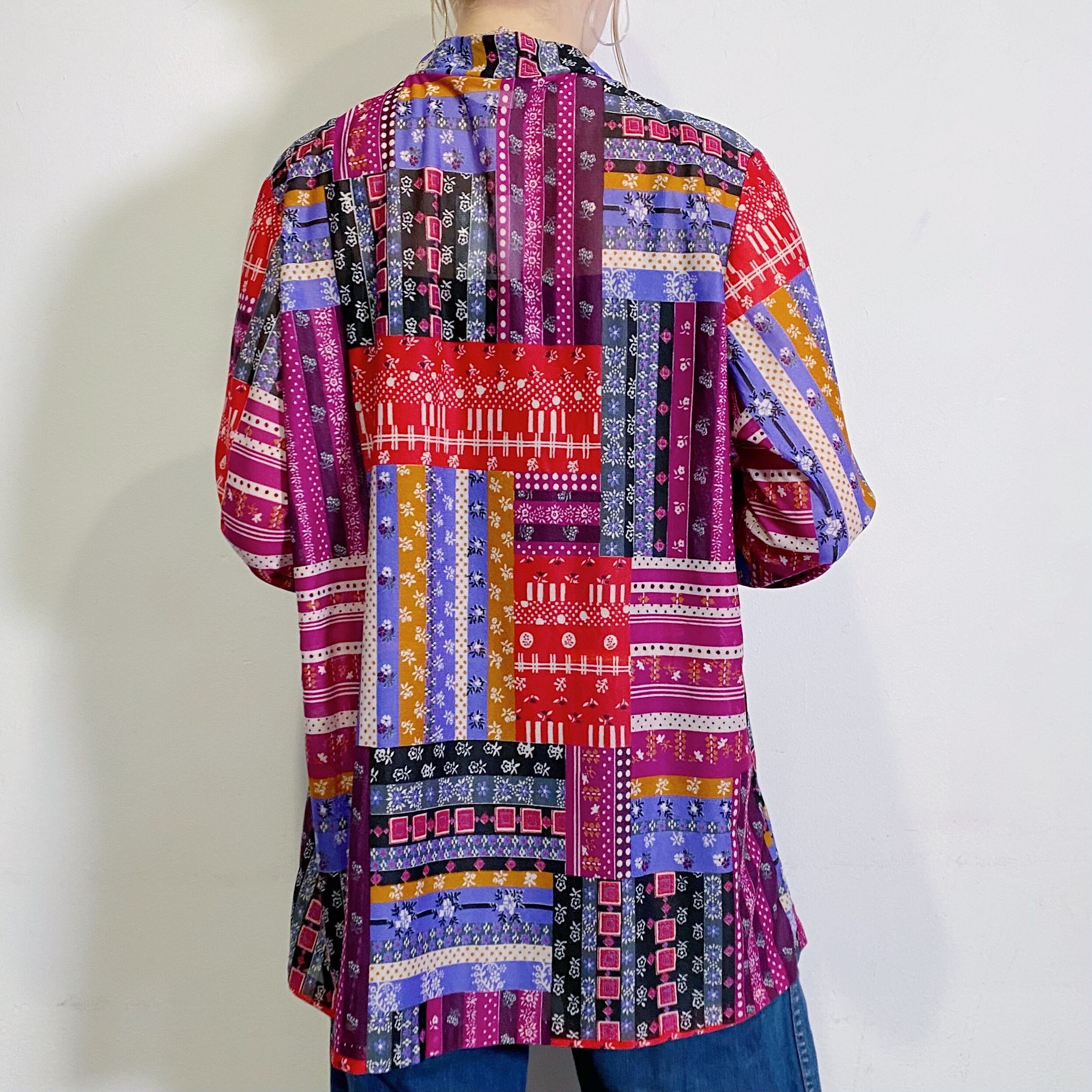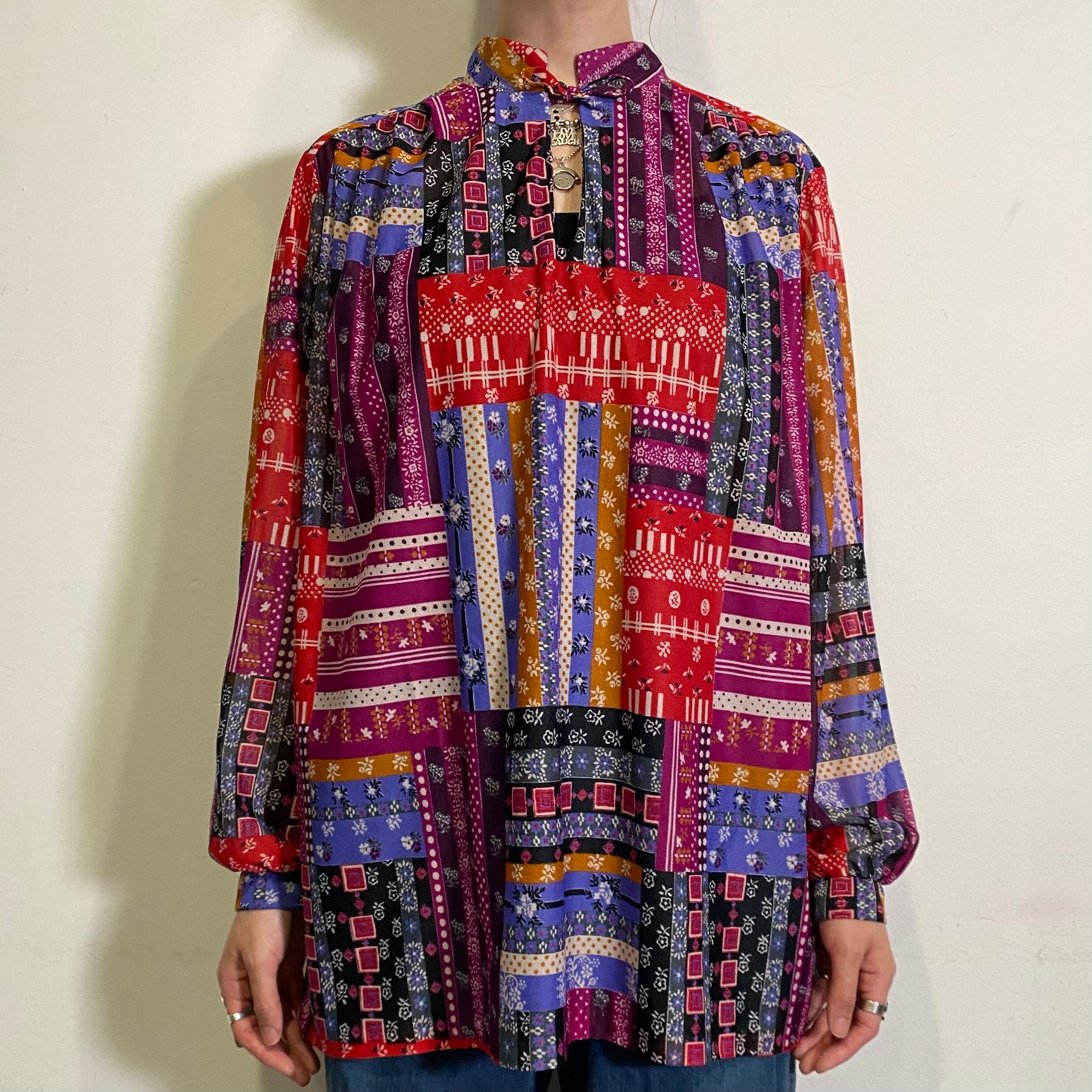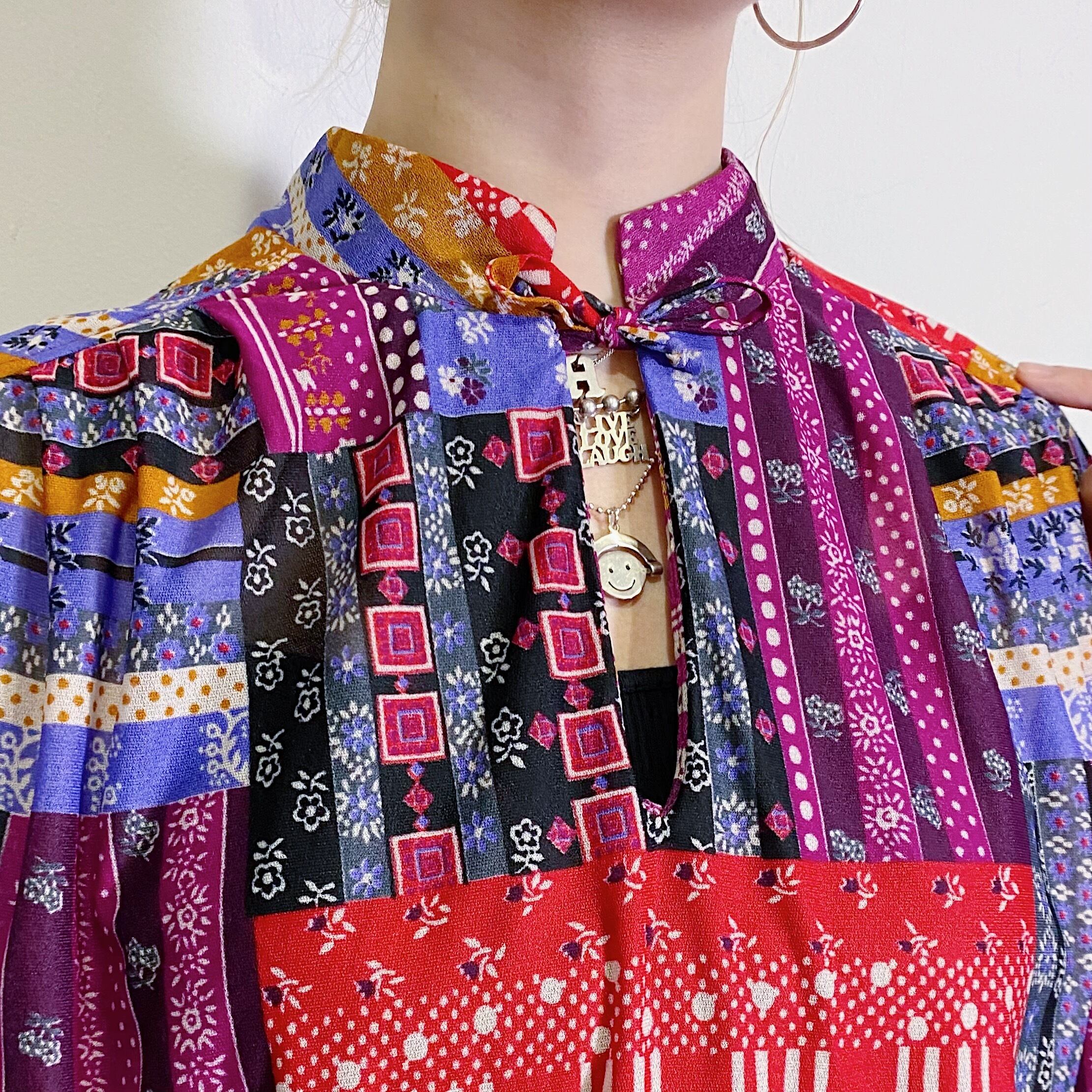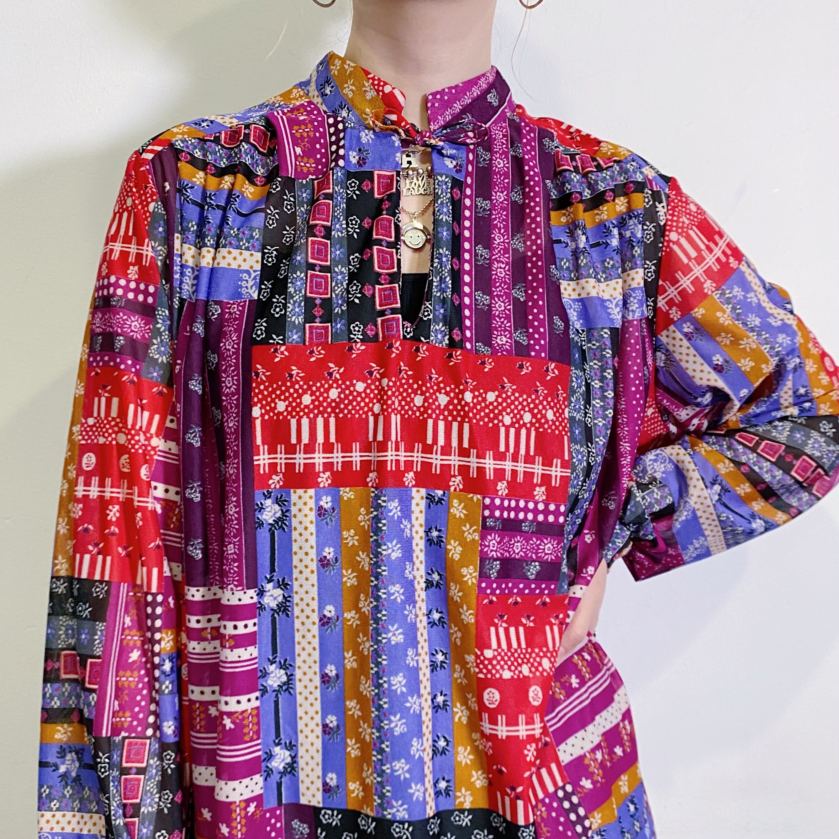 赤や紫などのカラフルなパッチワーク柄が可愛い、70年代の長袖チュニックです。