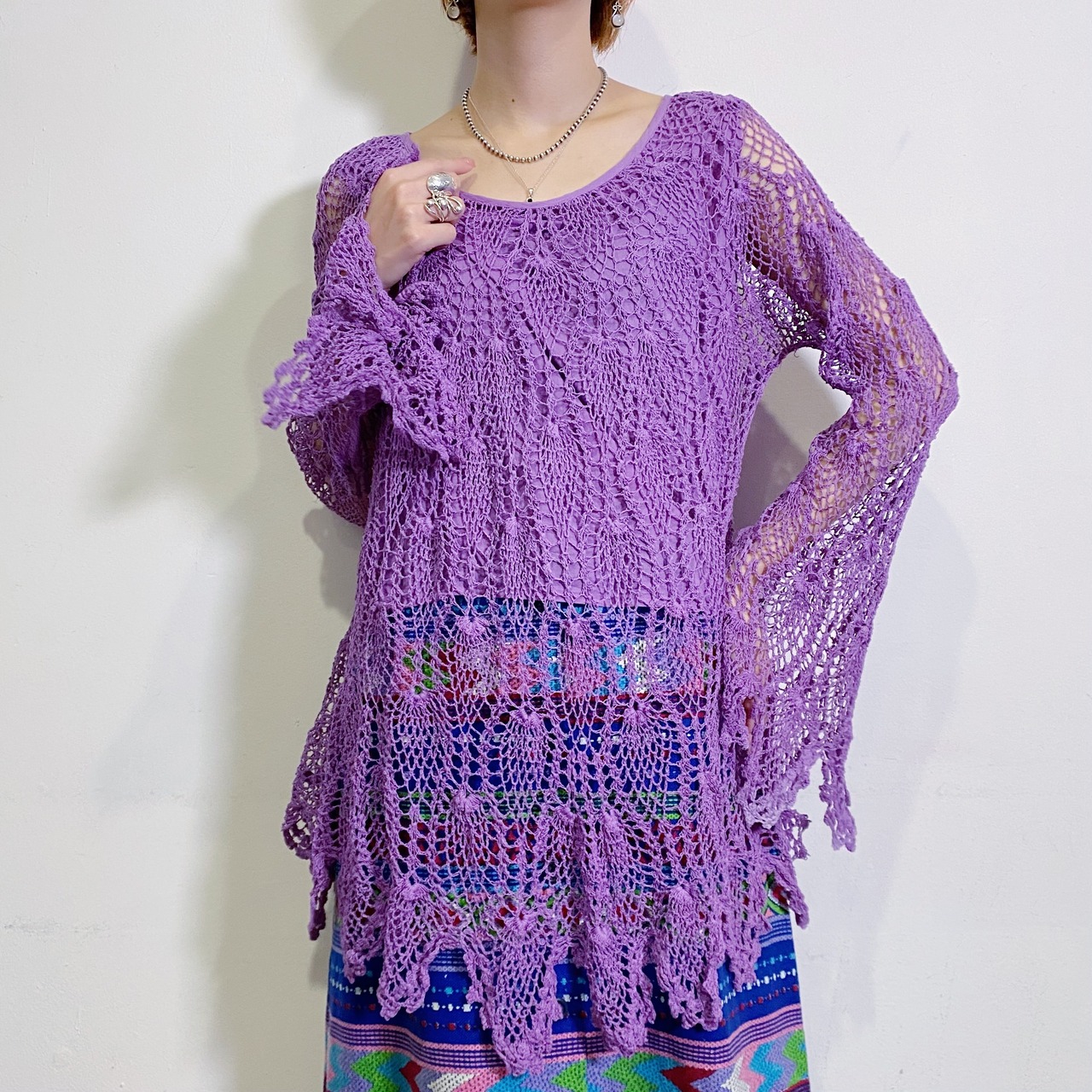 ジグザグとしたスカラップ調の裾や袖口がとても可愛い、クロシェニットトップスです。