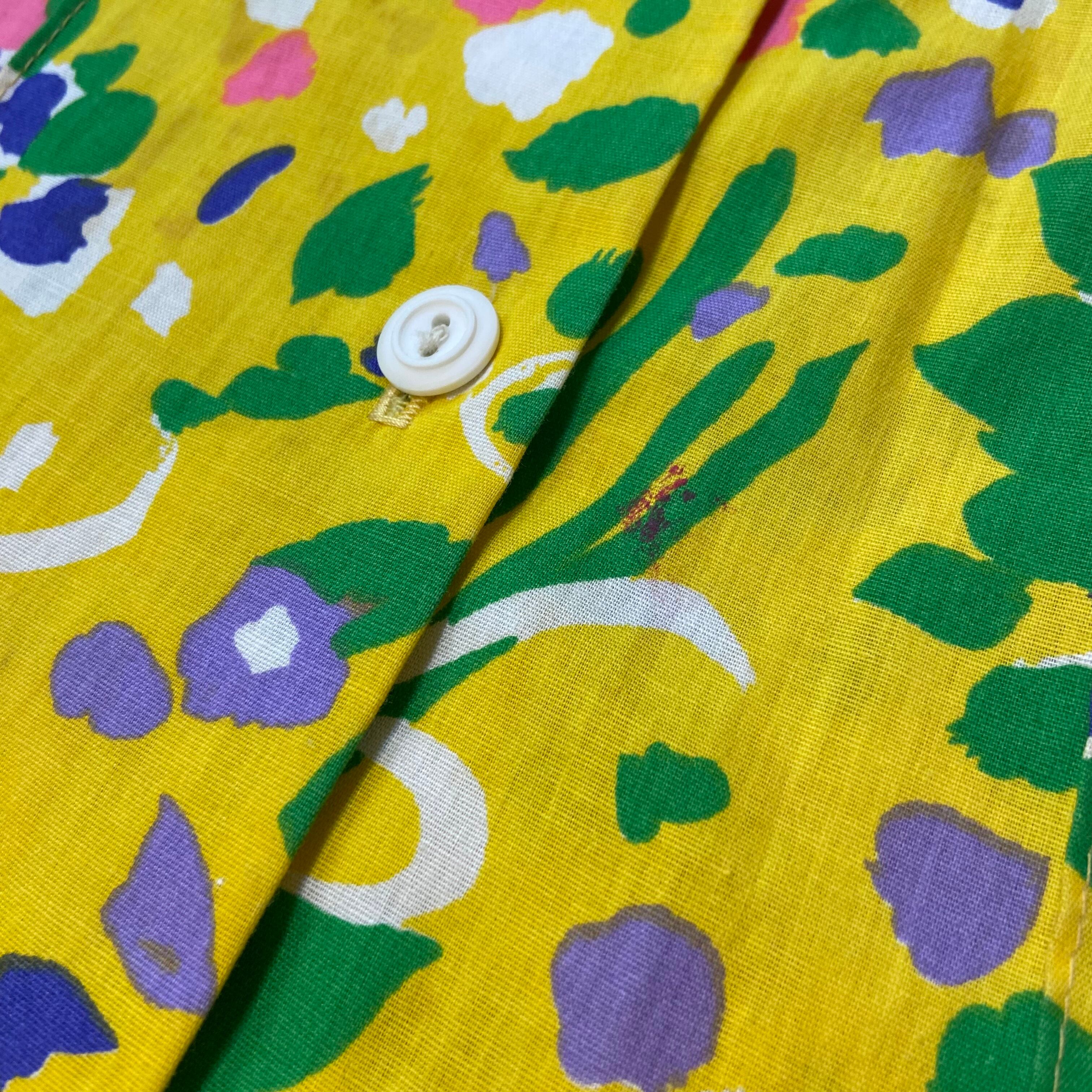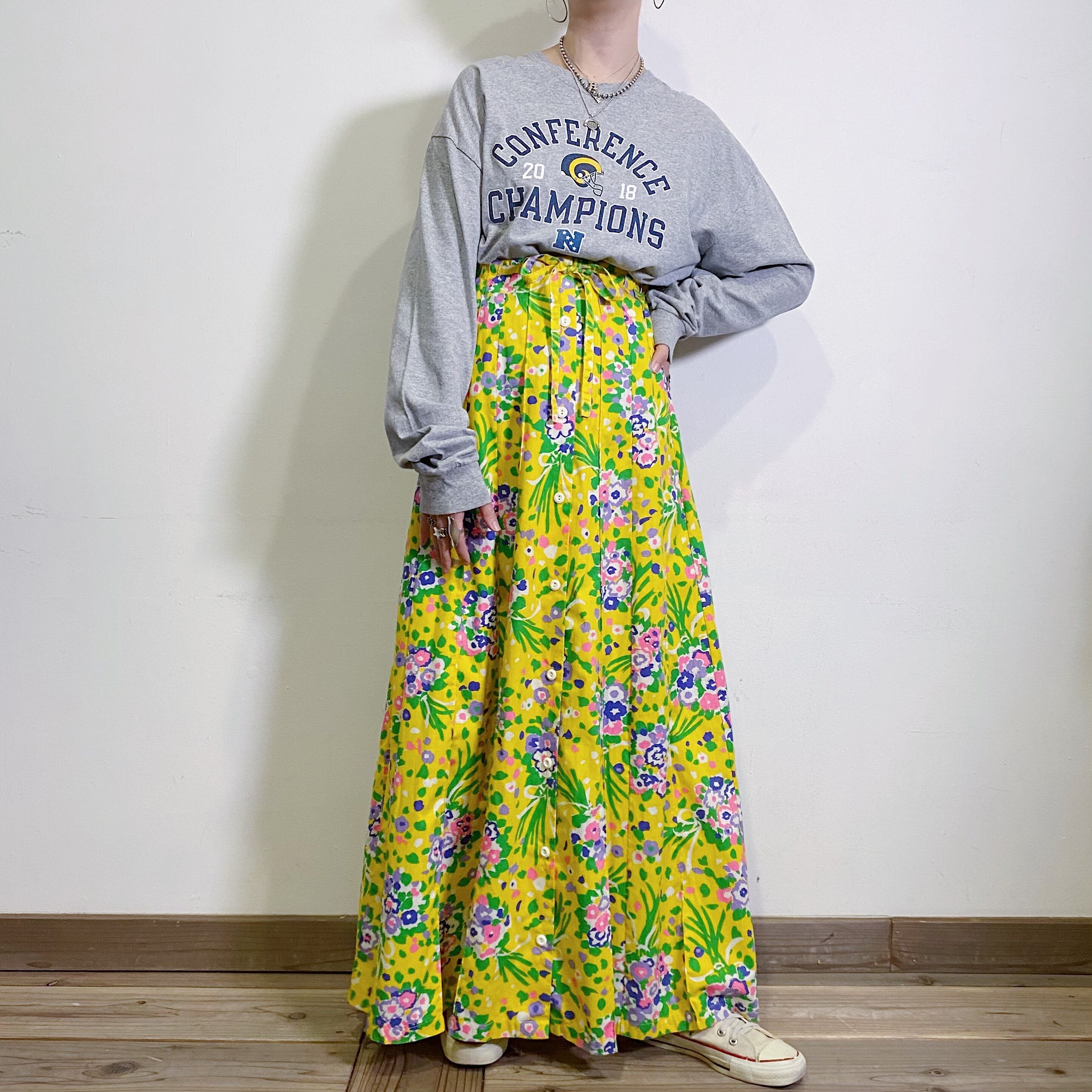 ハッピーなイエローベースにピンクやラベンダーのお花のブーケ柄が素敵な、70年代のロングスカートです。