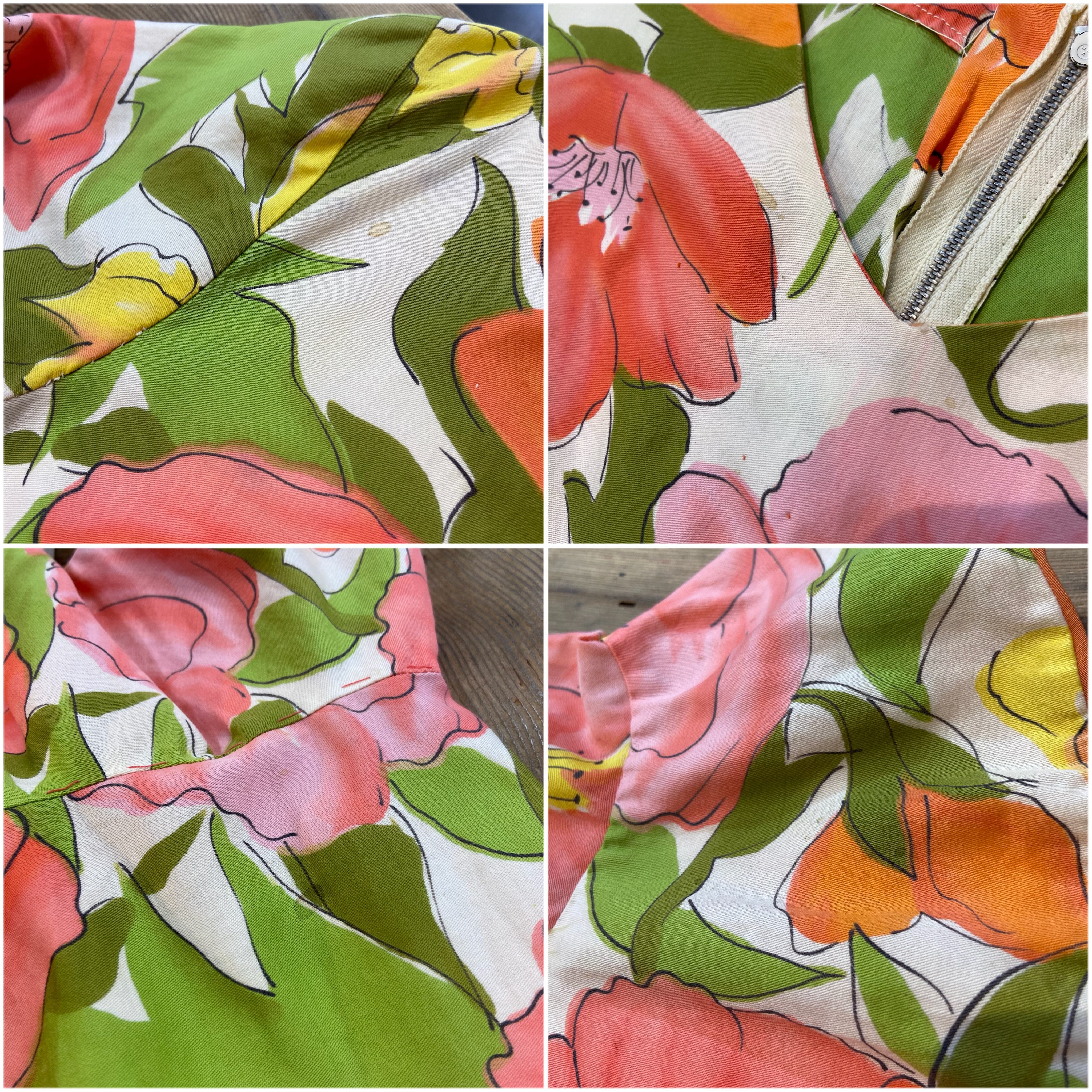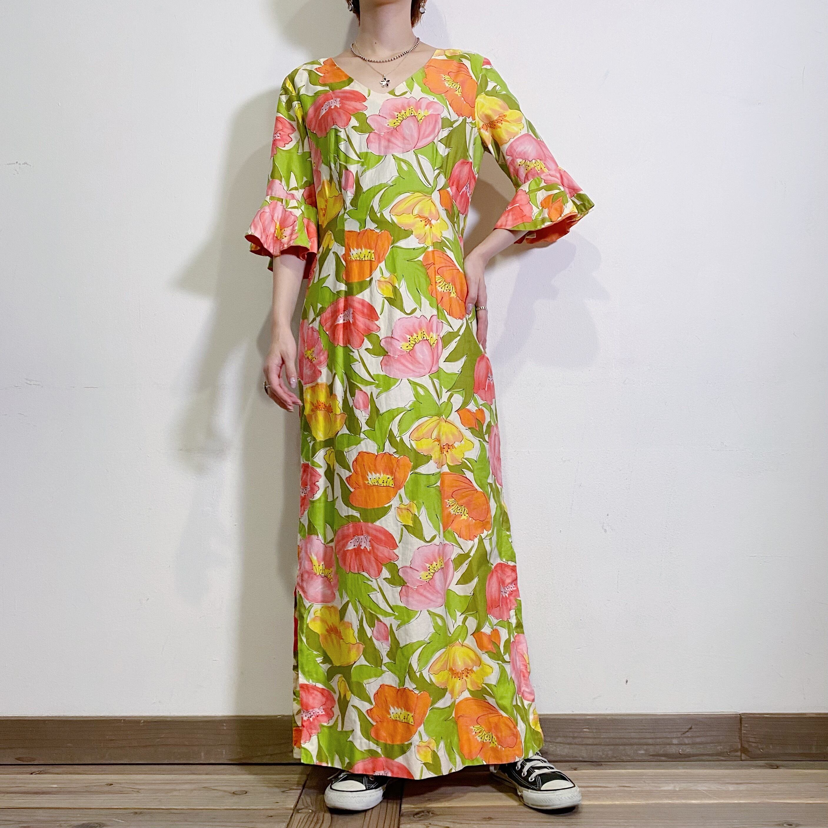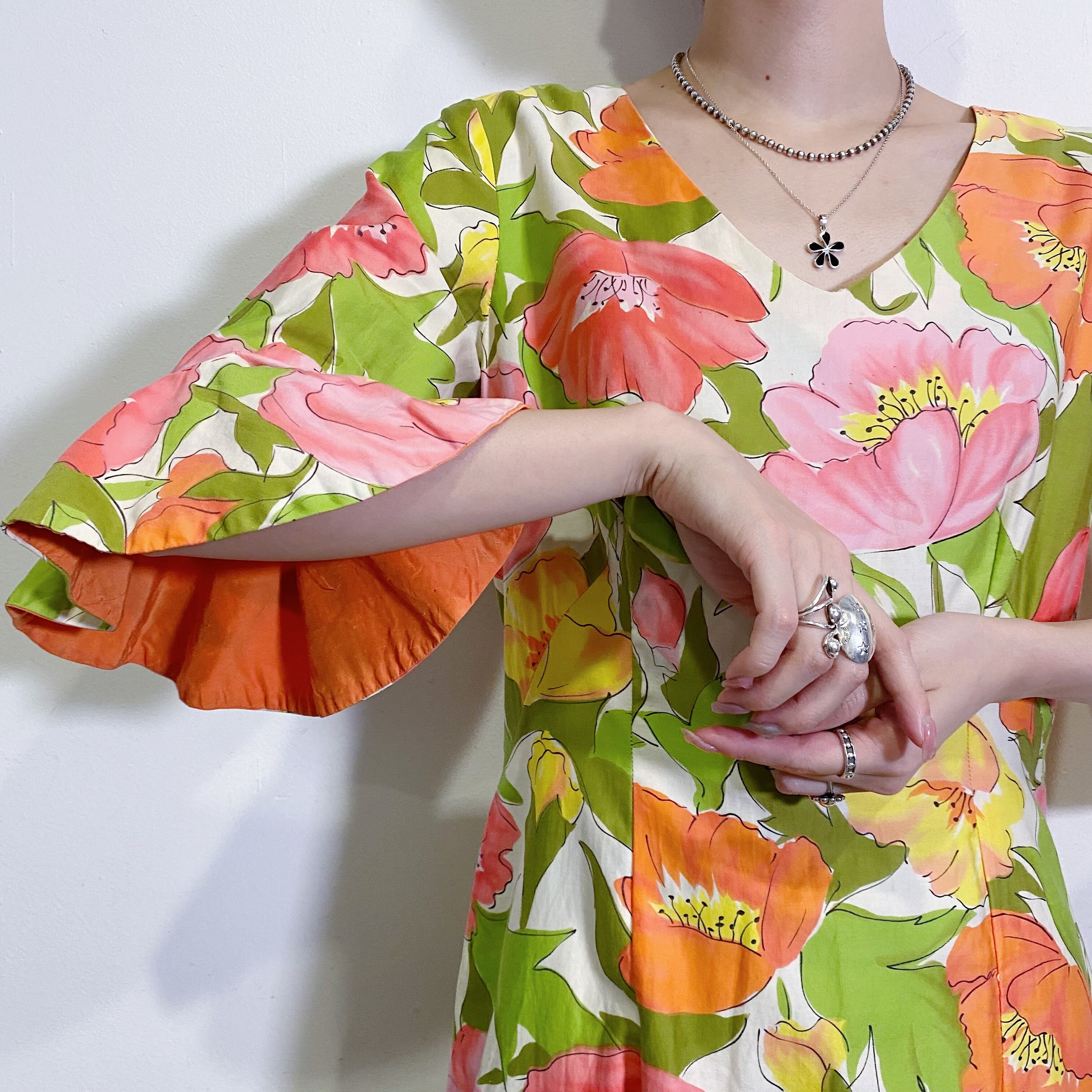 オレンジやイエローなど暖色の花柄が可愛い、60年代のワンピースです。