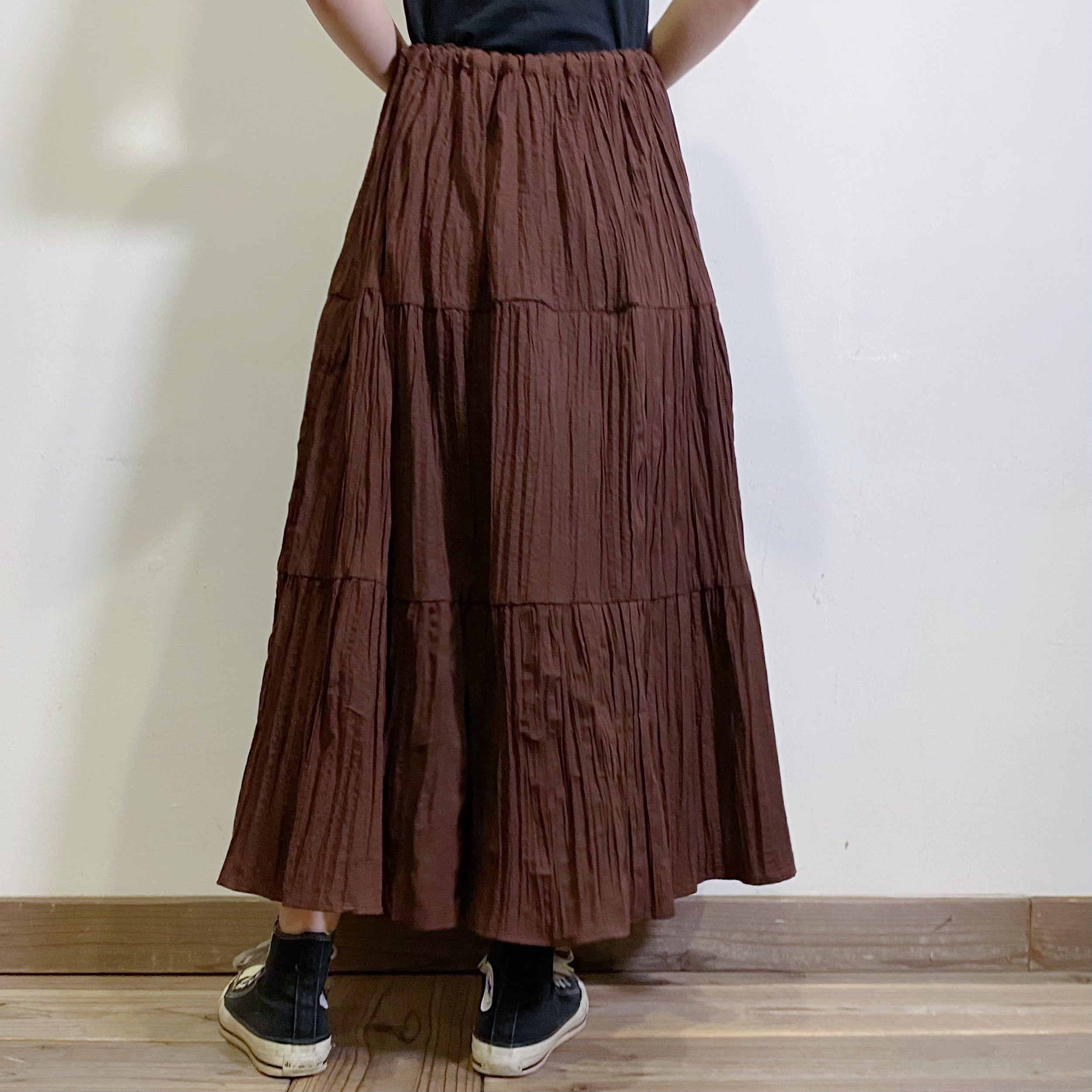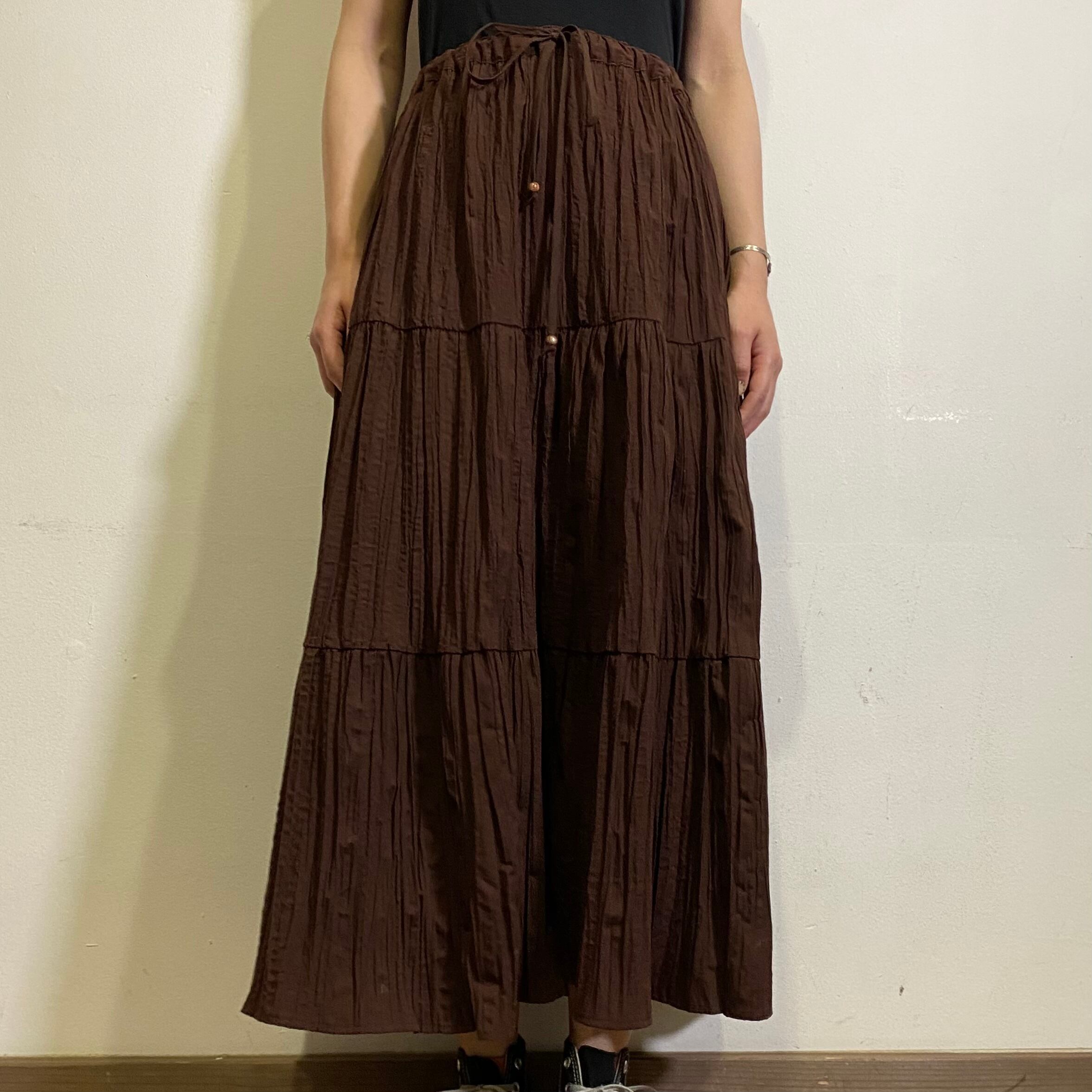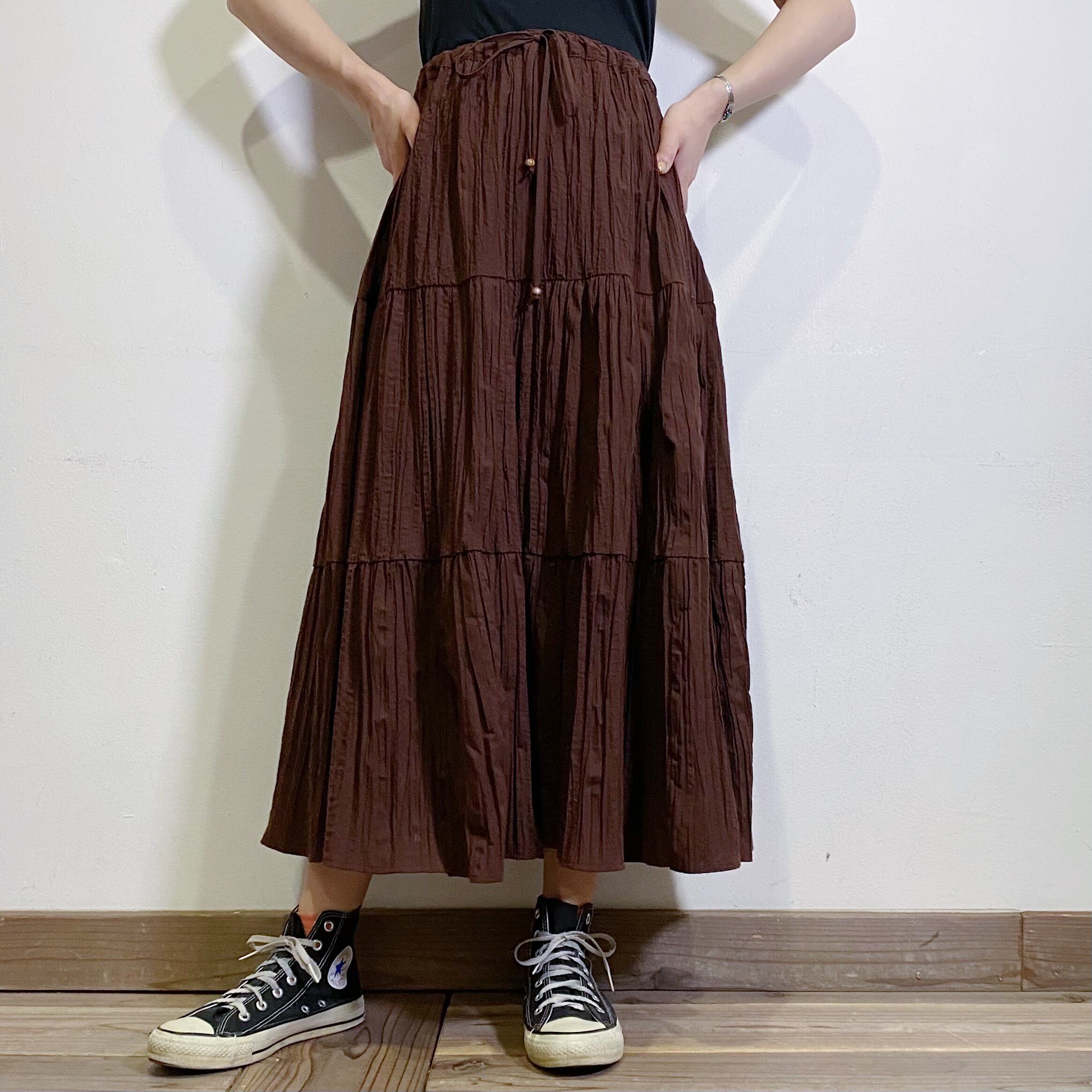 こっくりとしたブラウンカラーで大変使い勝手の良い、ロングスカートです。