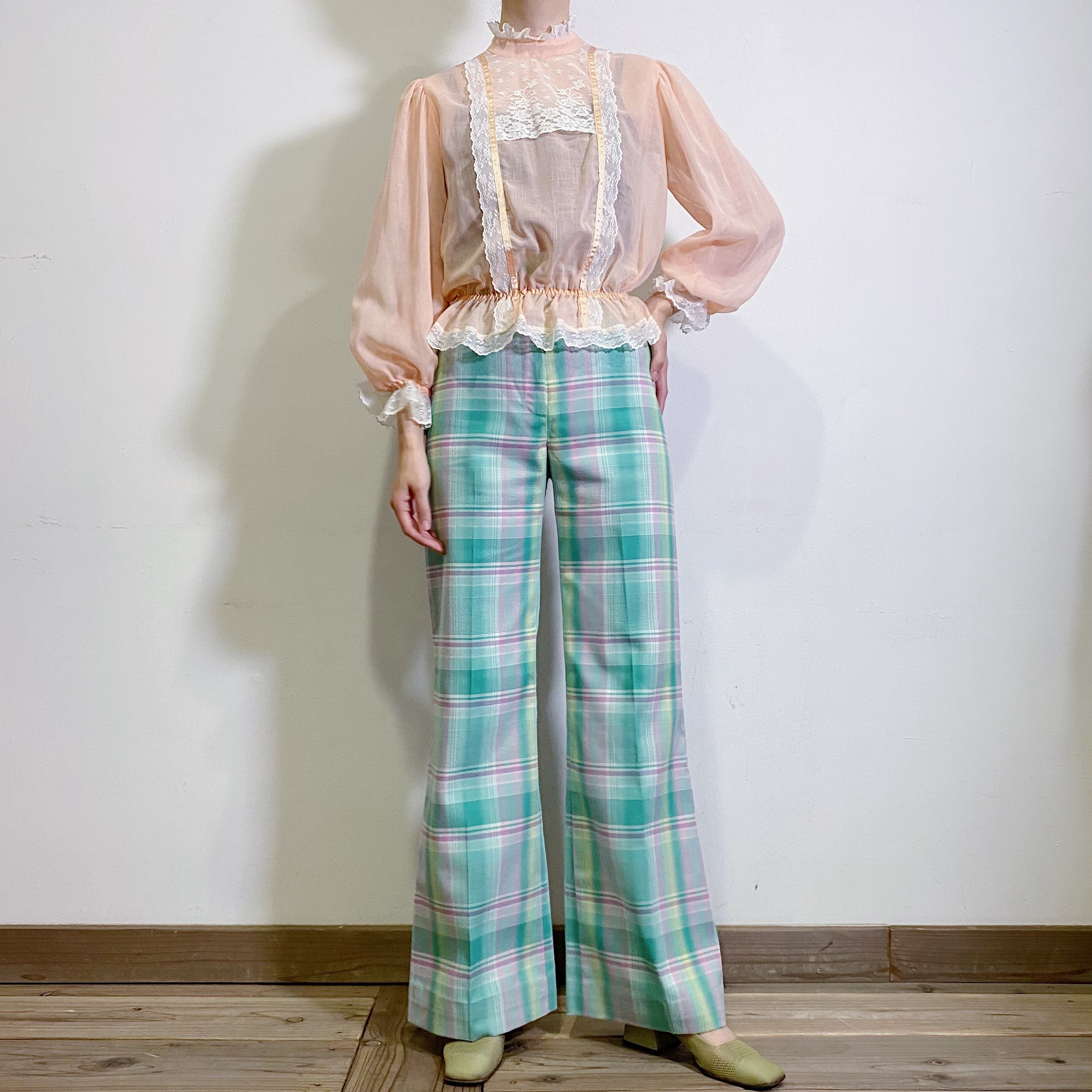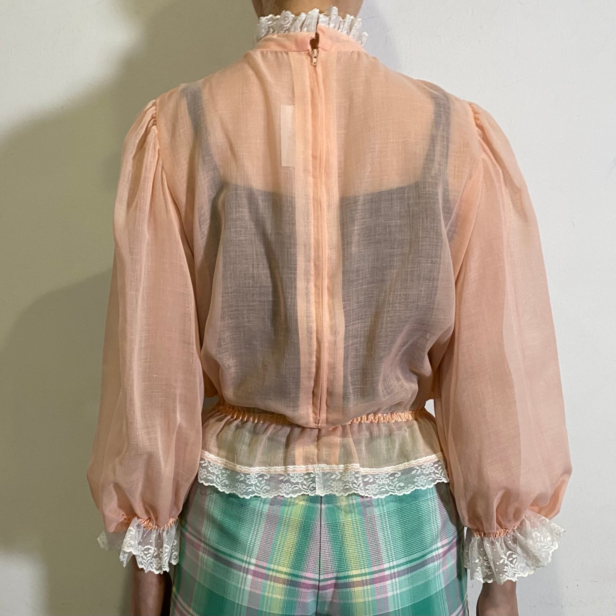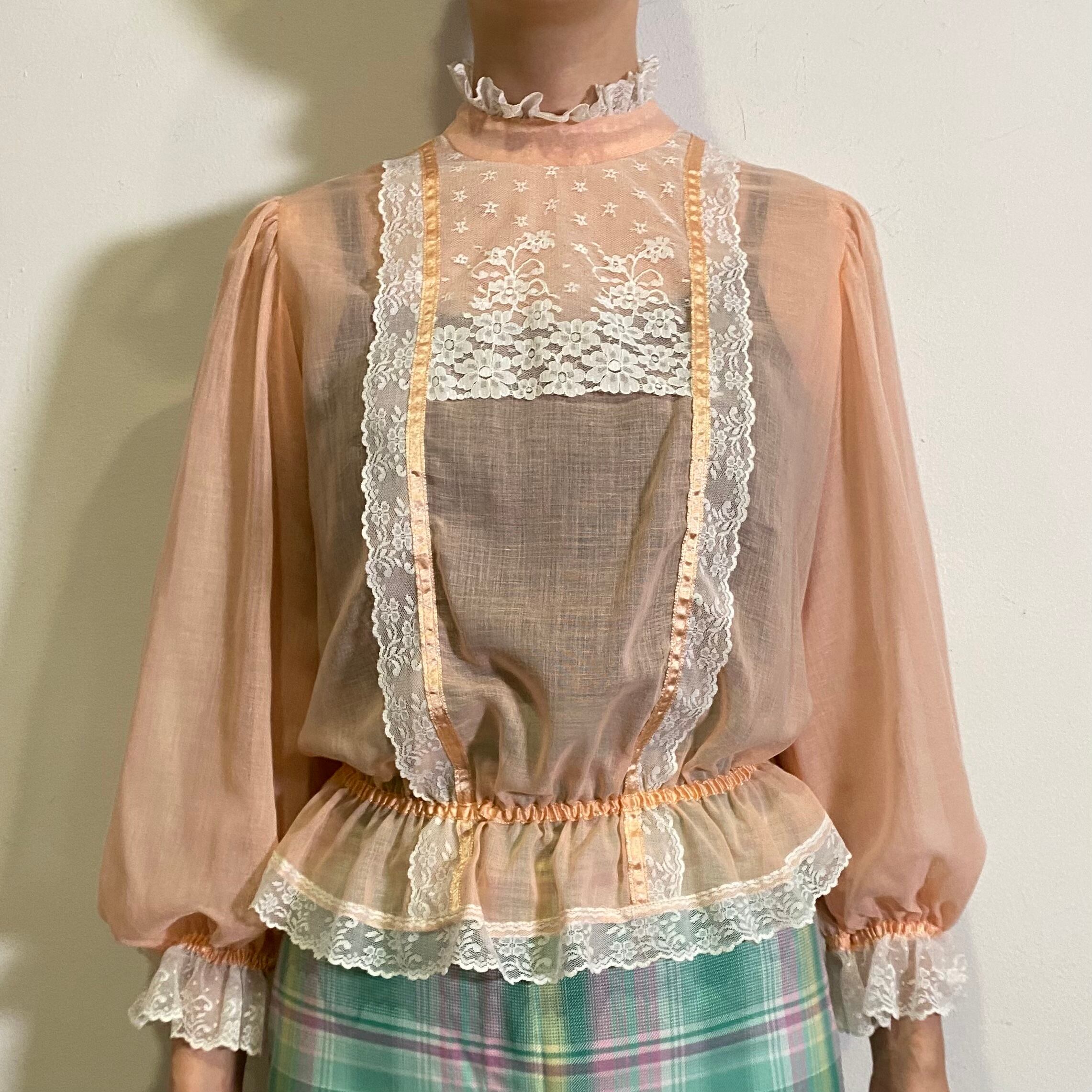 サーモンピンクカラーにたっぷりのレースの組み合わせが可愛い、70年代のトップスです。
