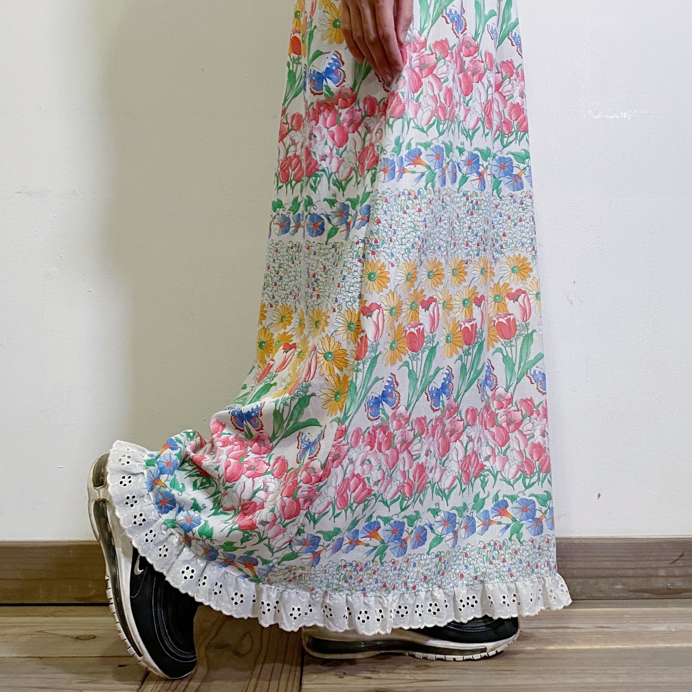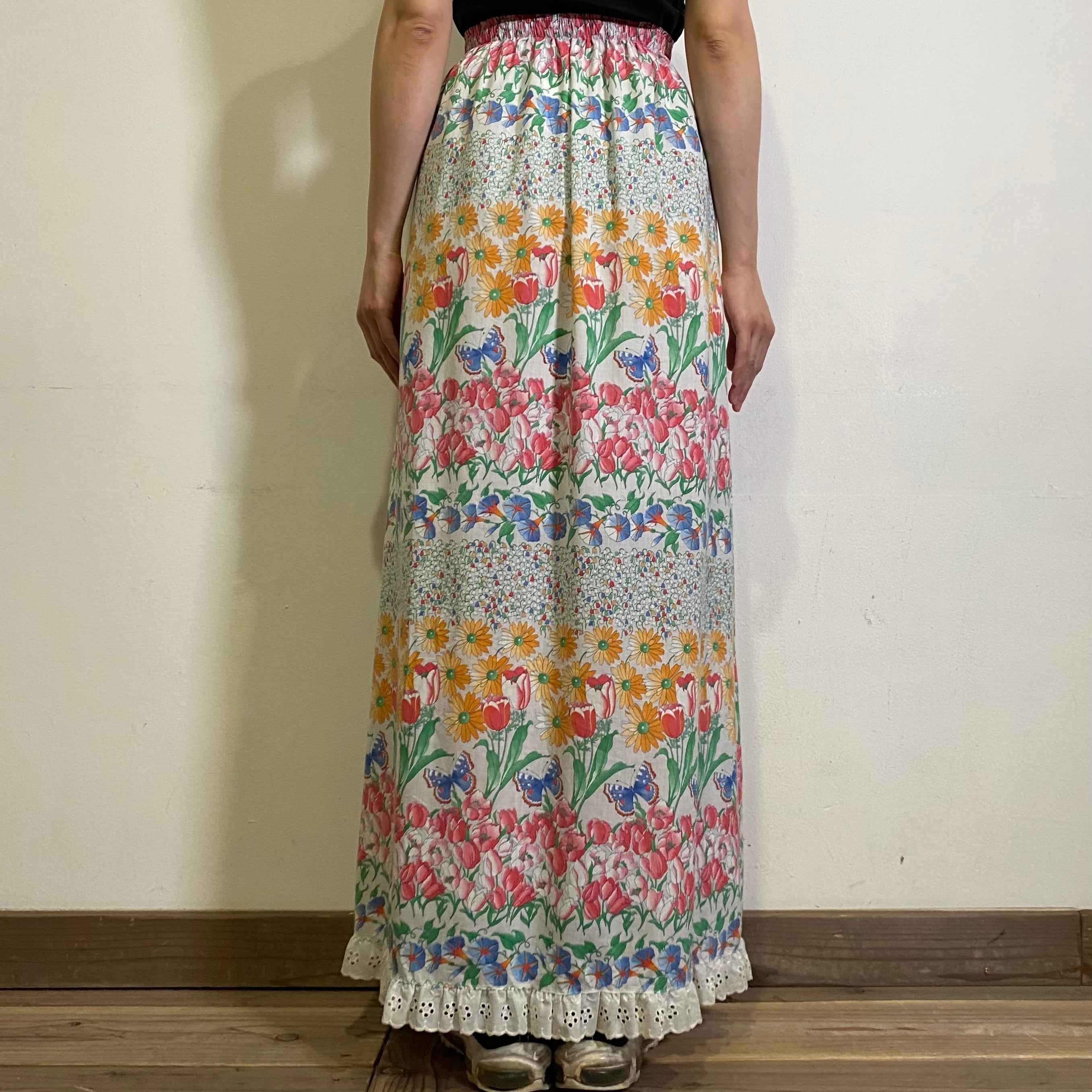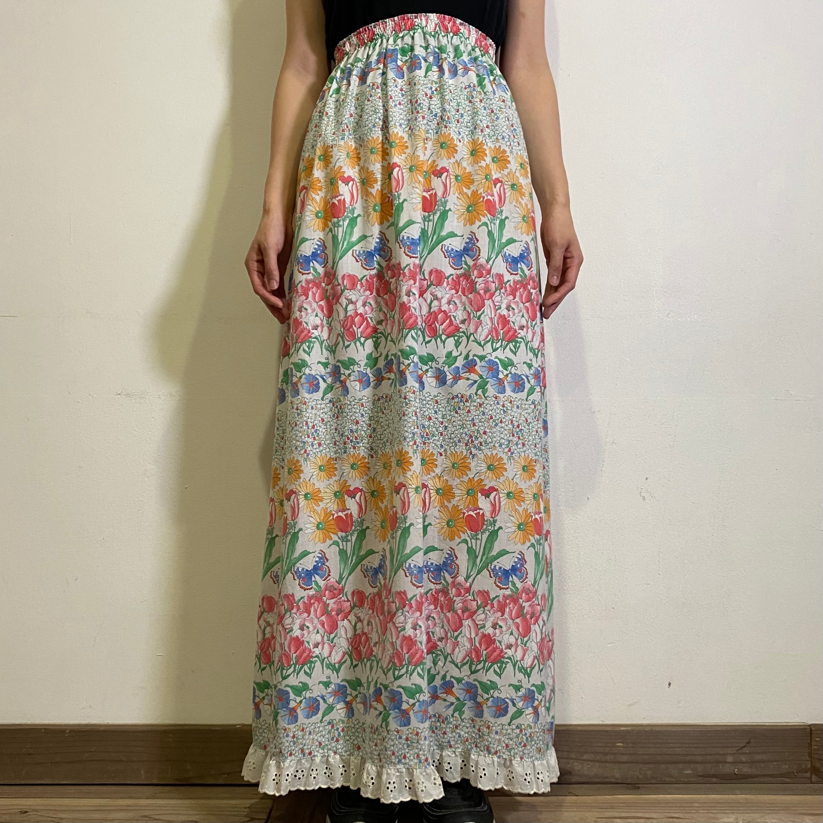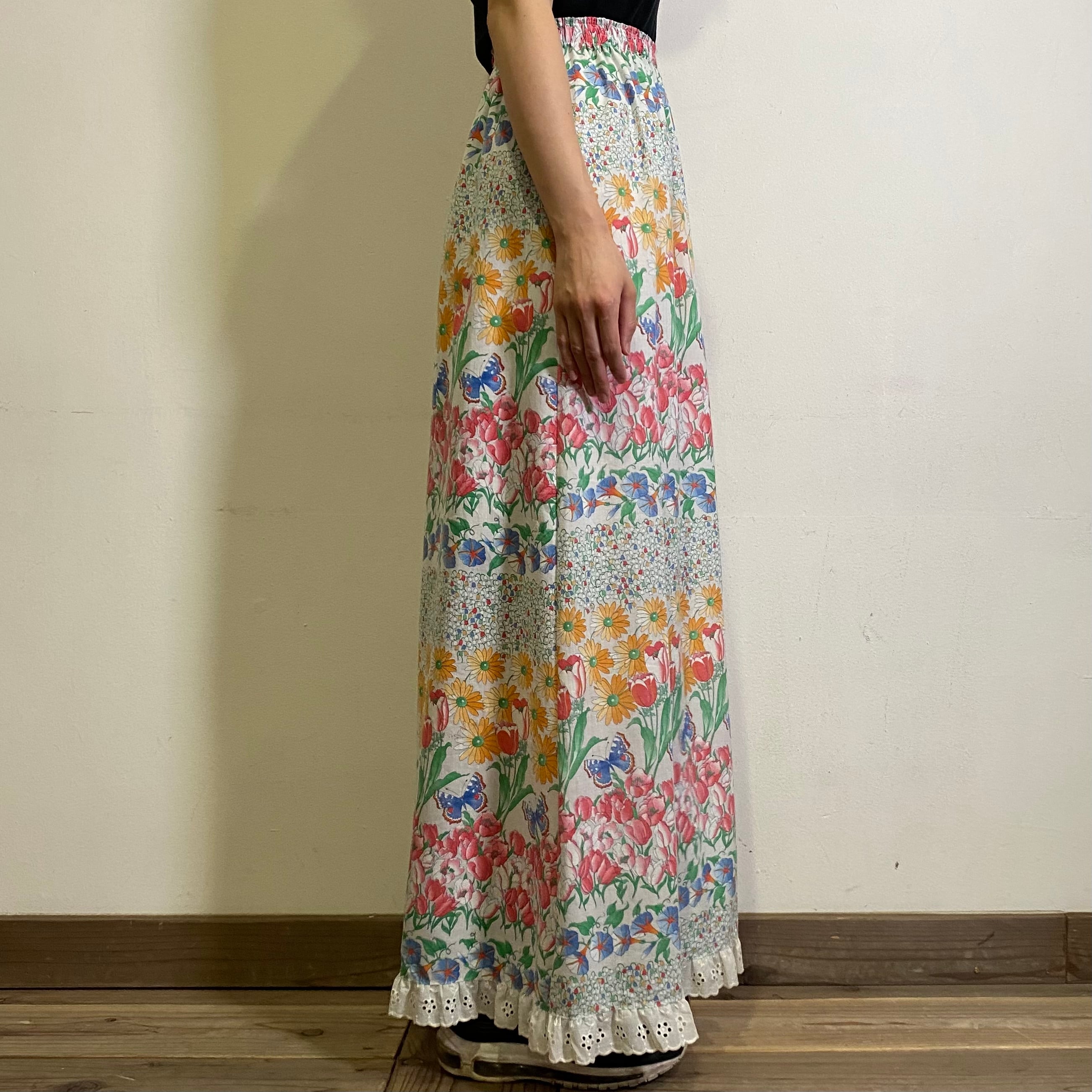 まるでお花畑のようなカラフルなテキスタイルが可愛い、70年代のスカートです。