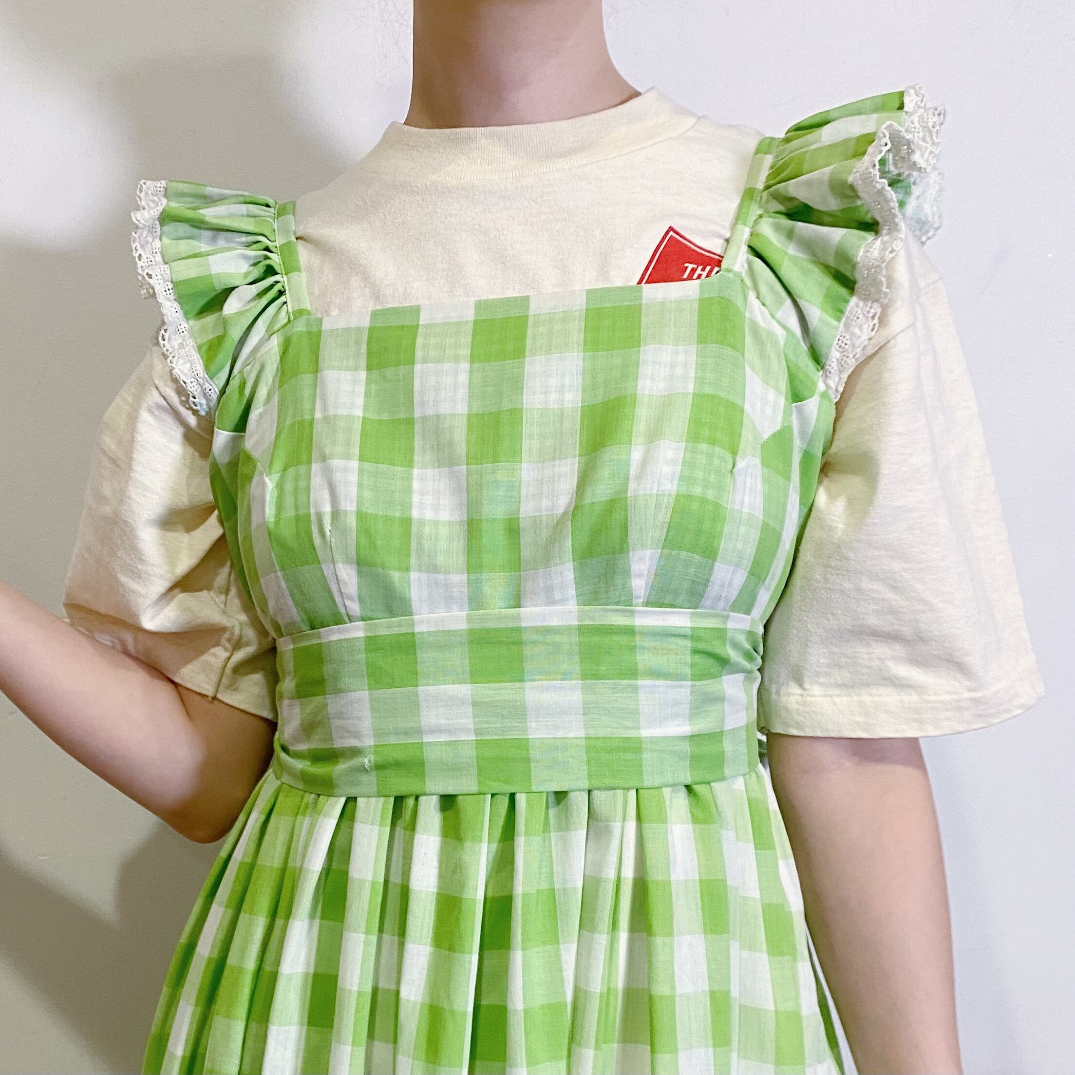 黄緑と白のギンガムチェックが可愛い、70年代のワンピースです。