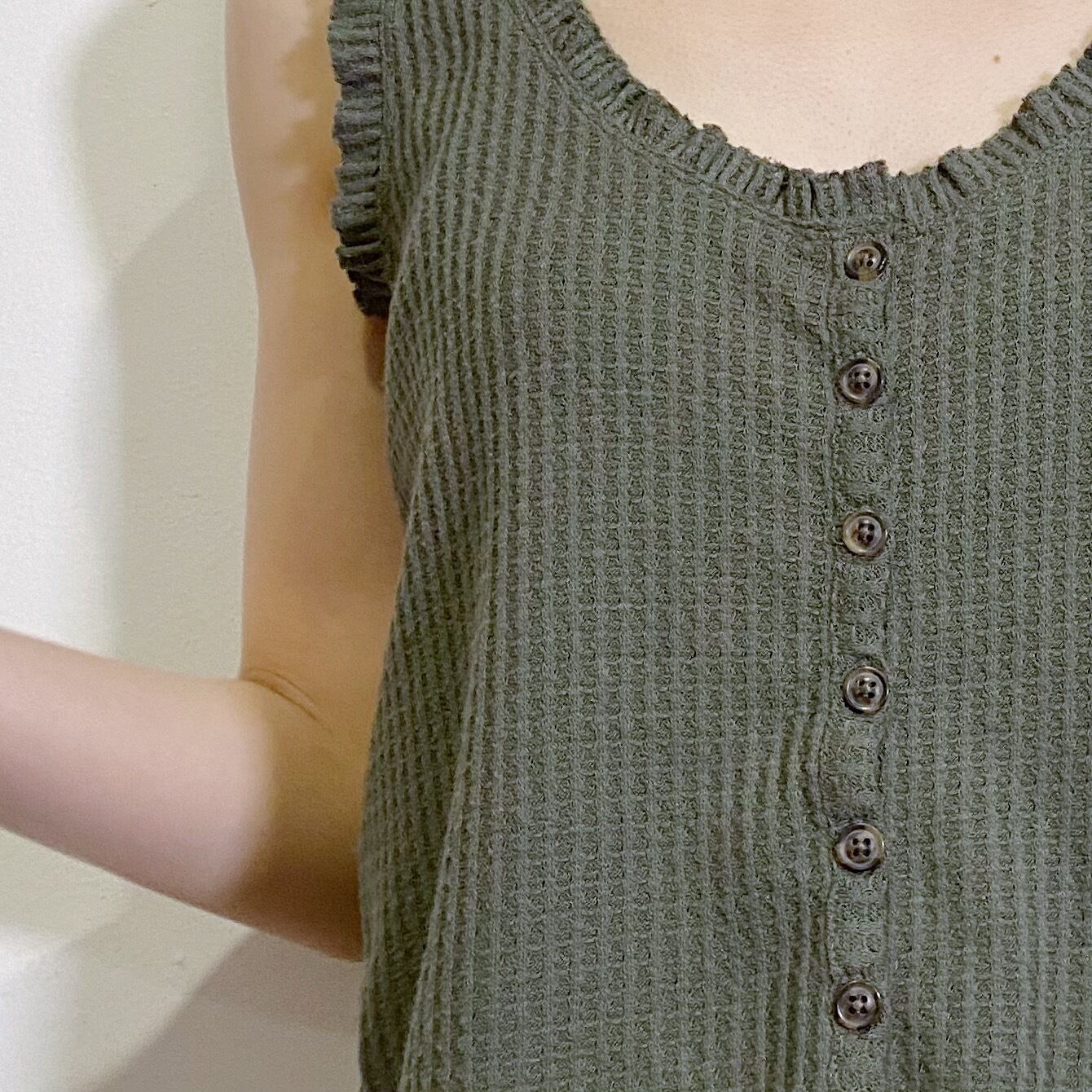 サーマルのような素材感にフリフリとした肩回りがキュートな、ノースリーブトップスです。
