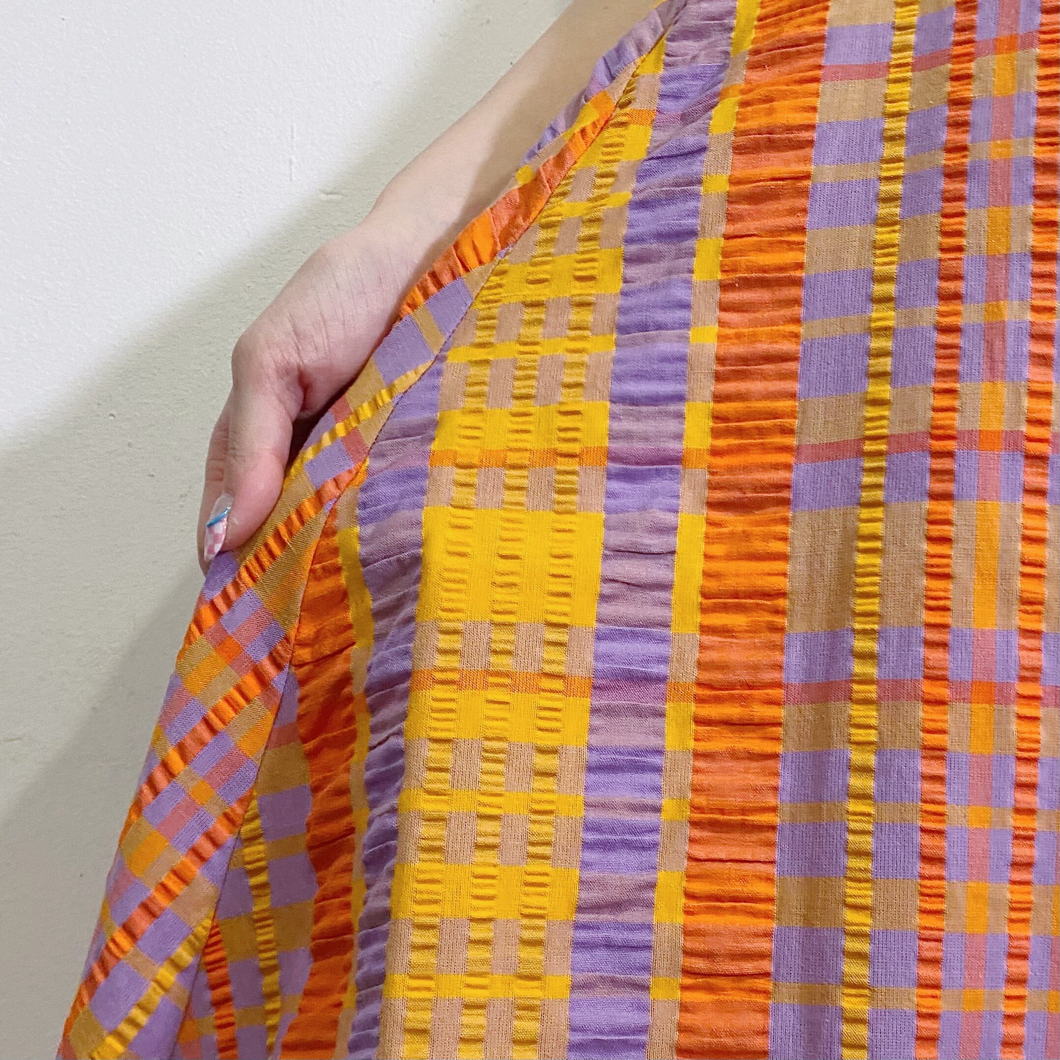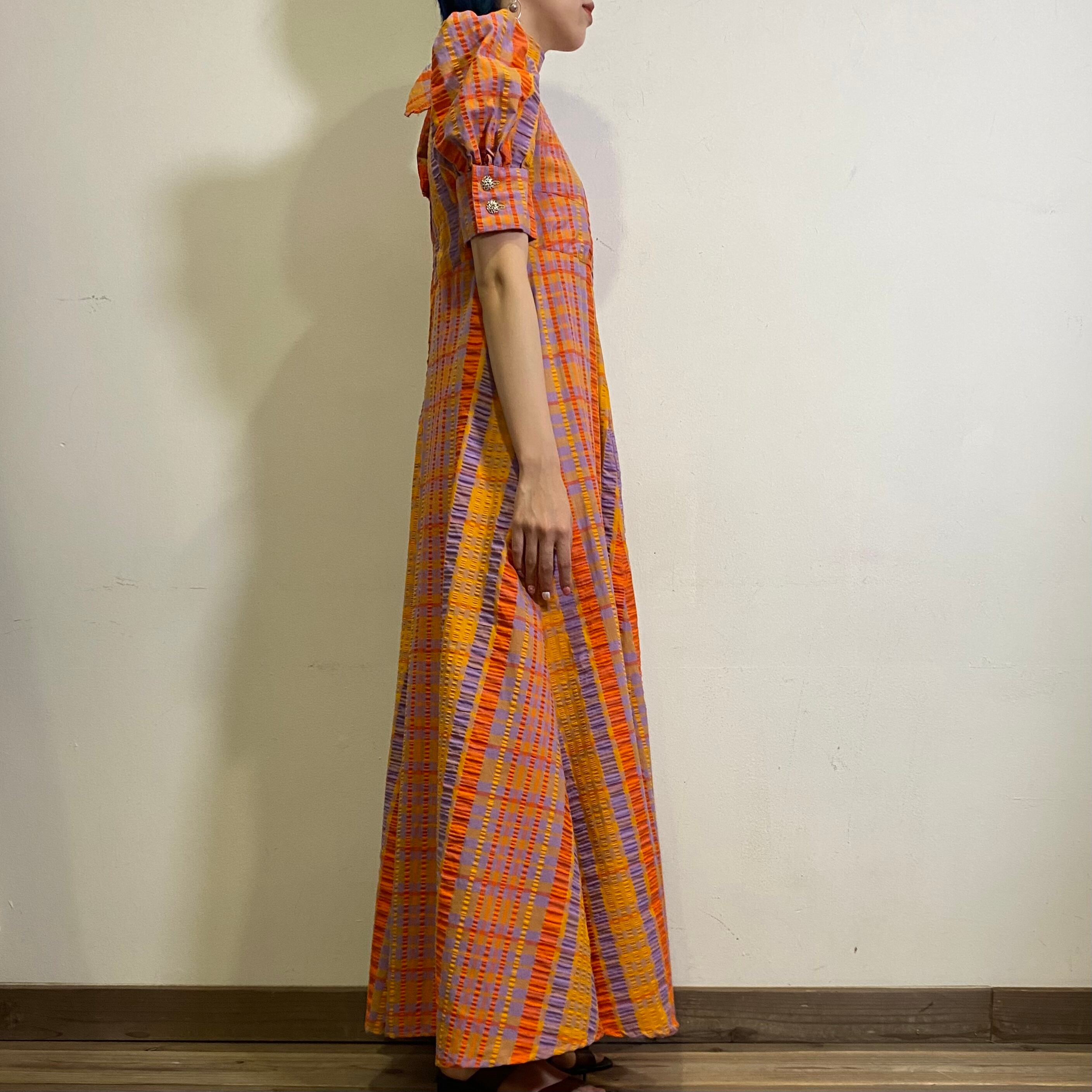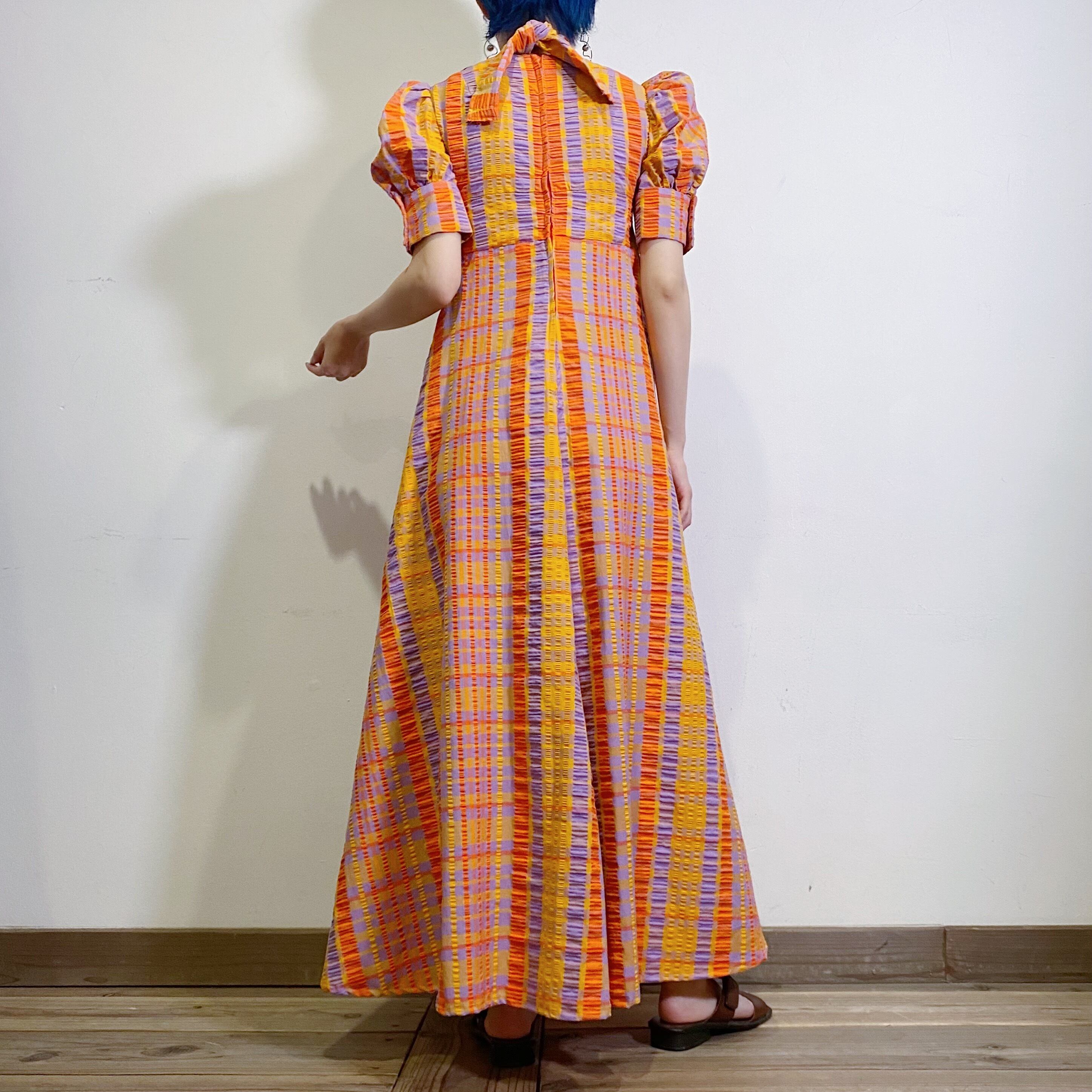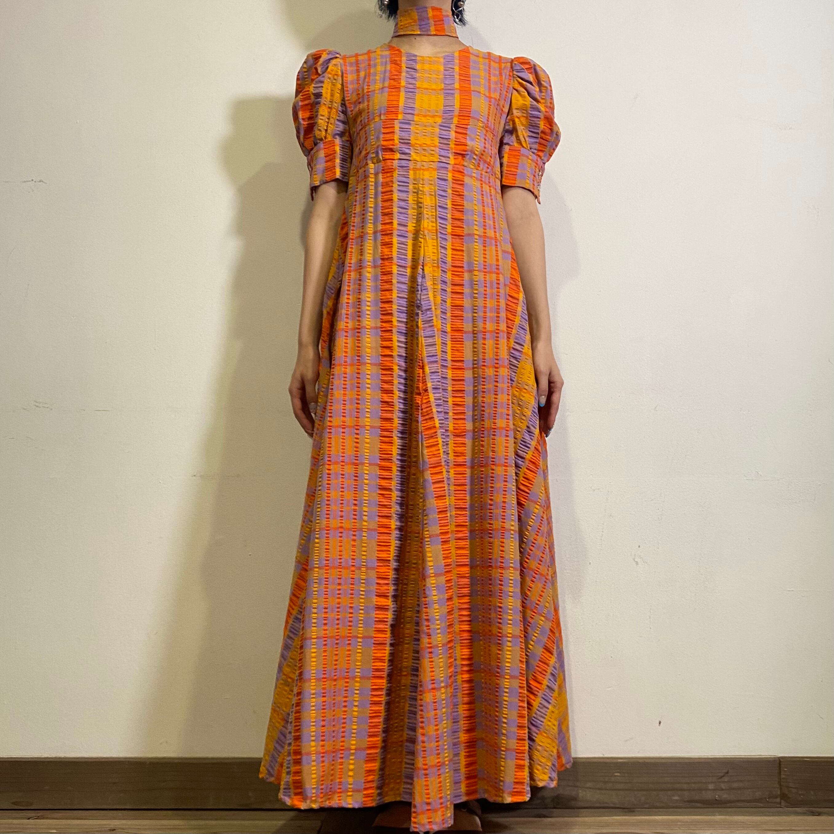 オレンジとパープルのチェック柄の色合いが可愛い、70年代のロングワンピースです。