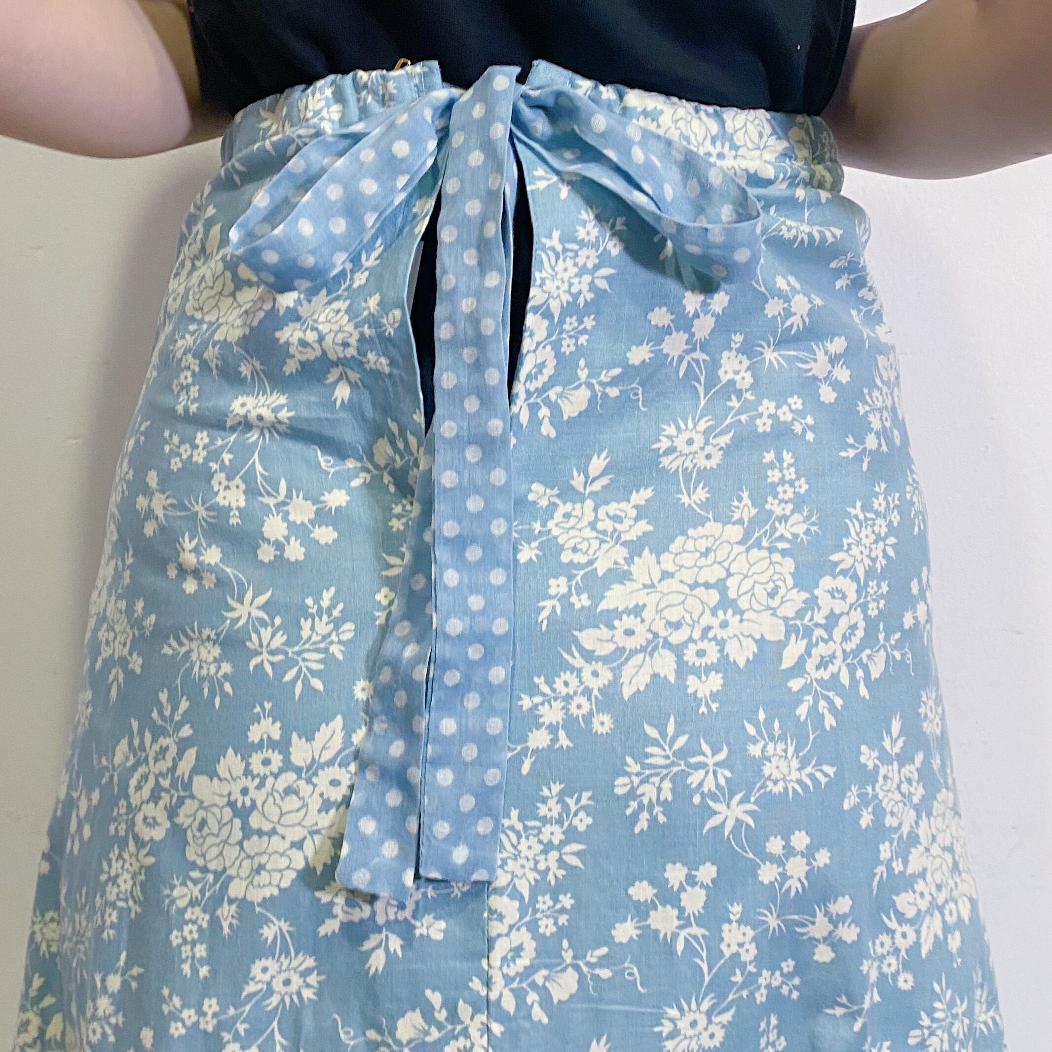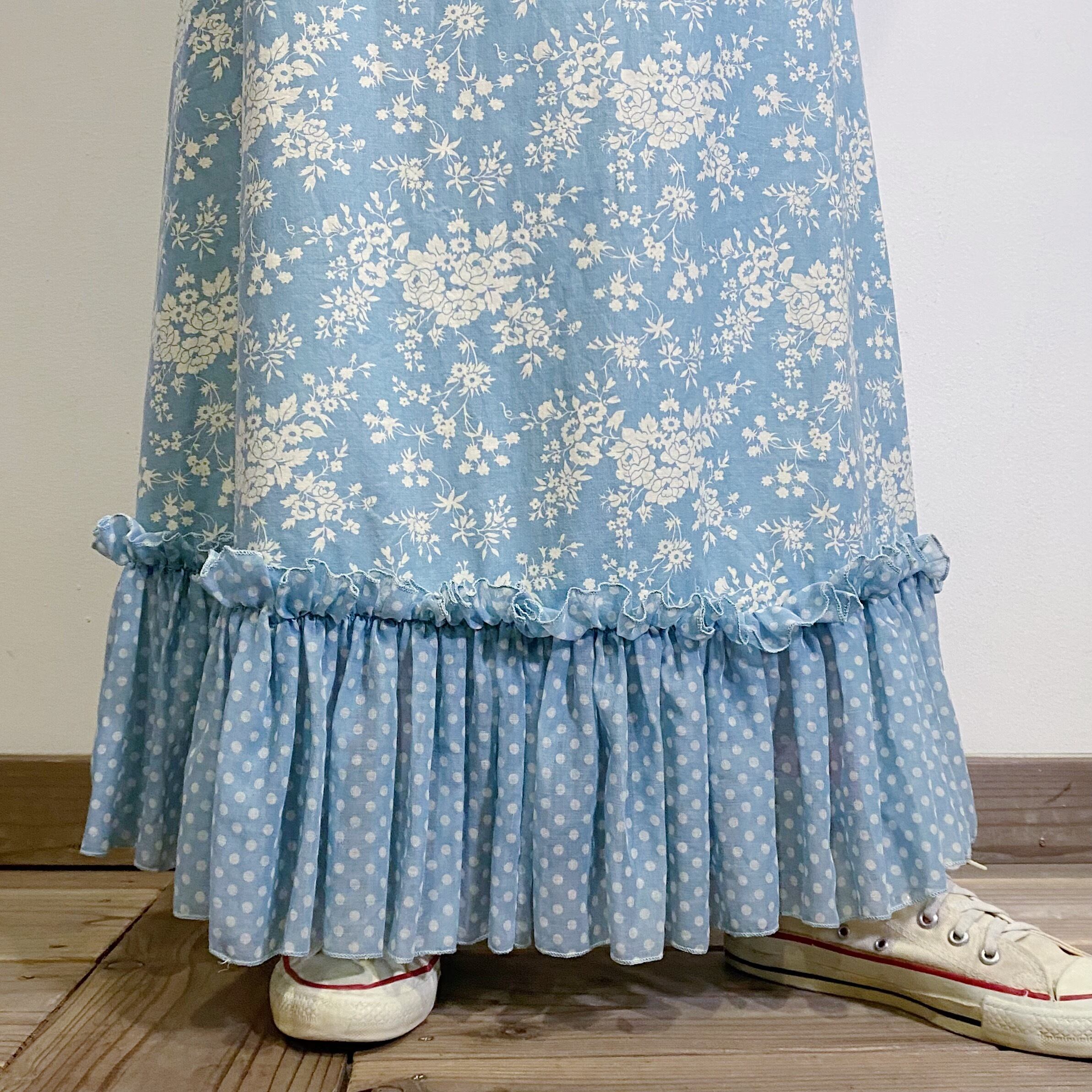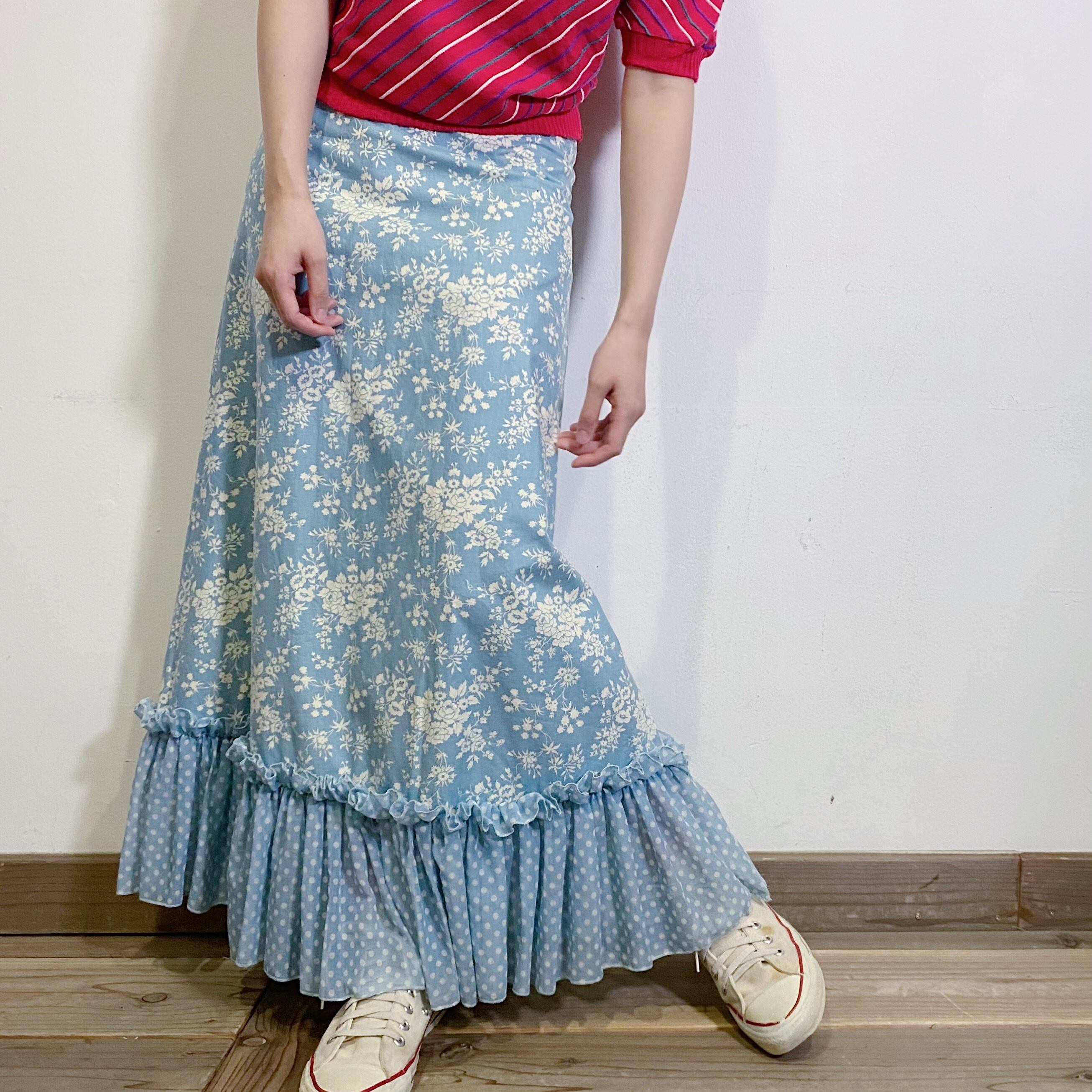 サックスブルーとホワイトの淡い色合いの花柄が素敵な、70年代のロングスカートです。