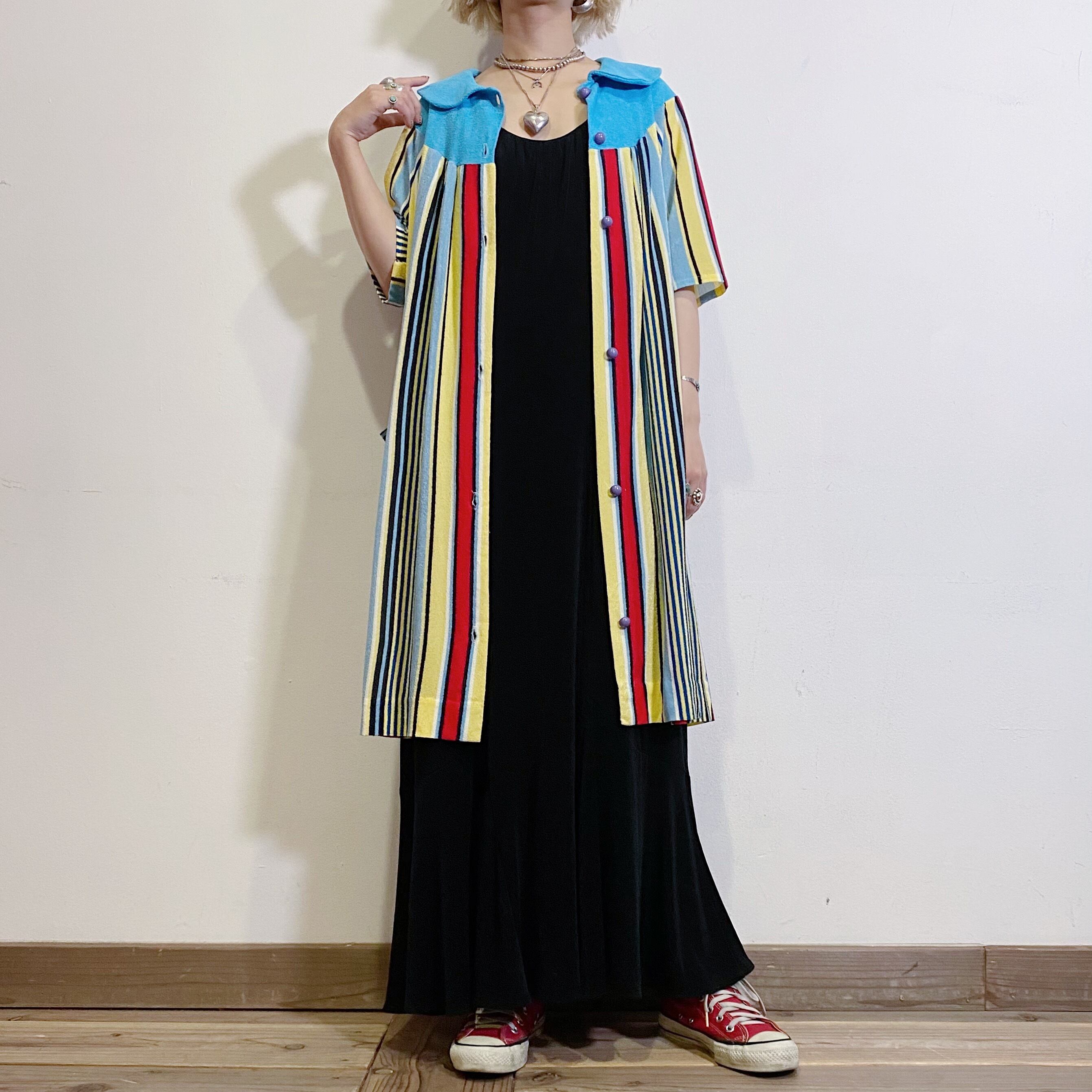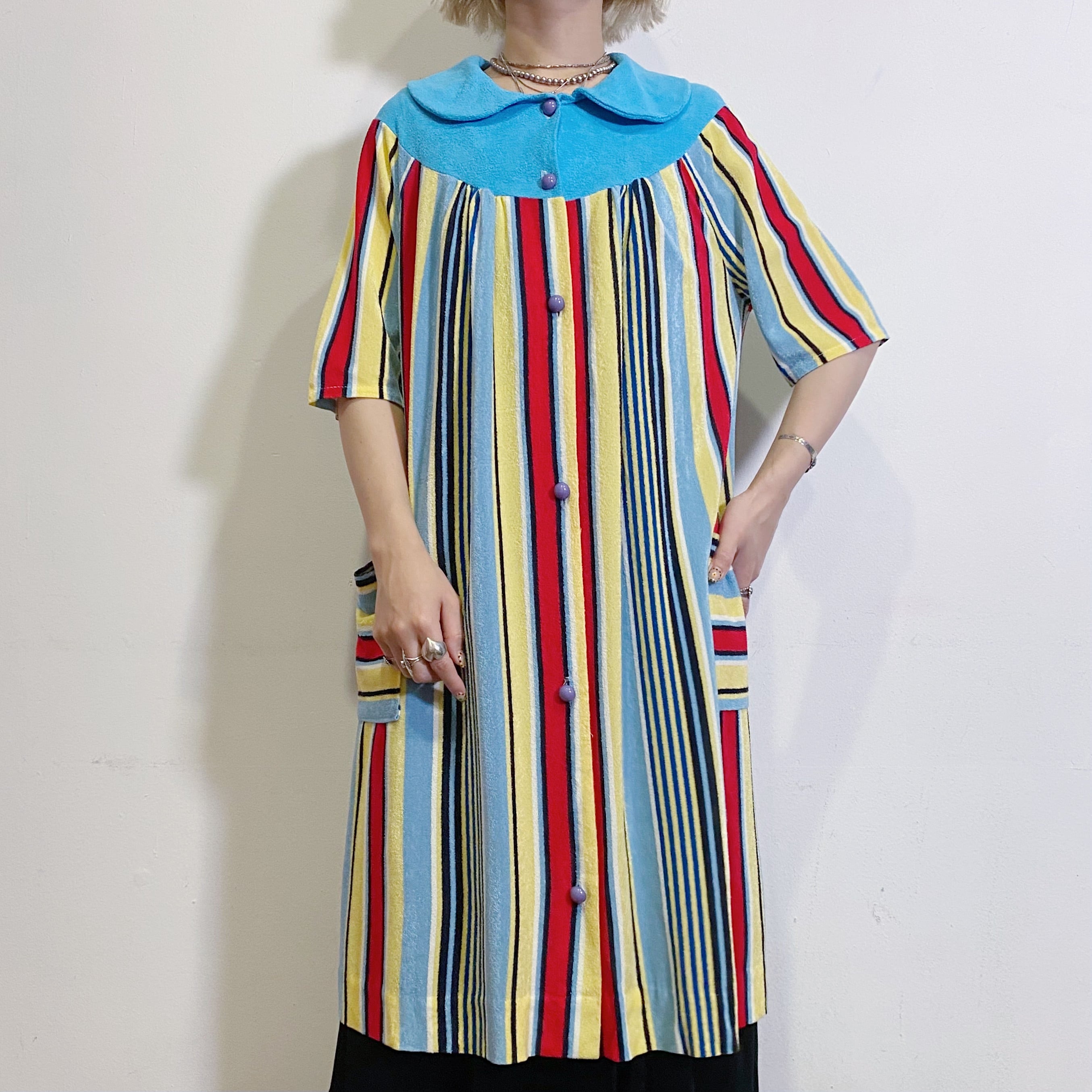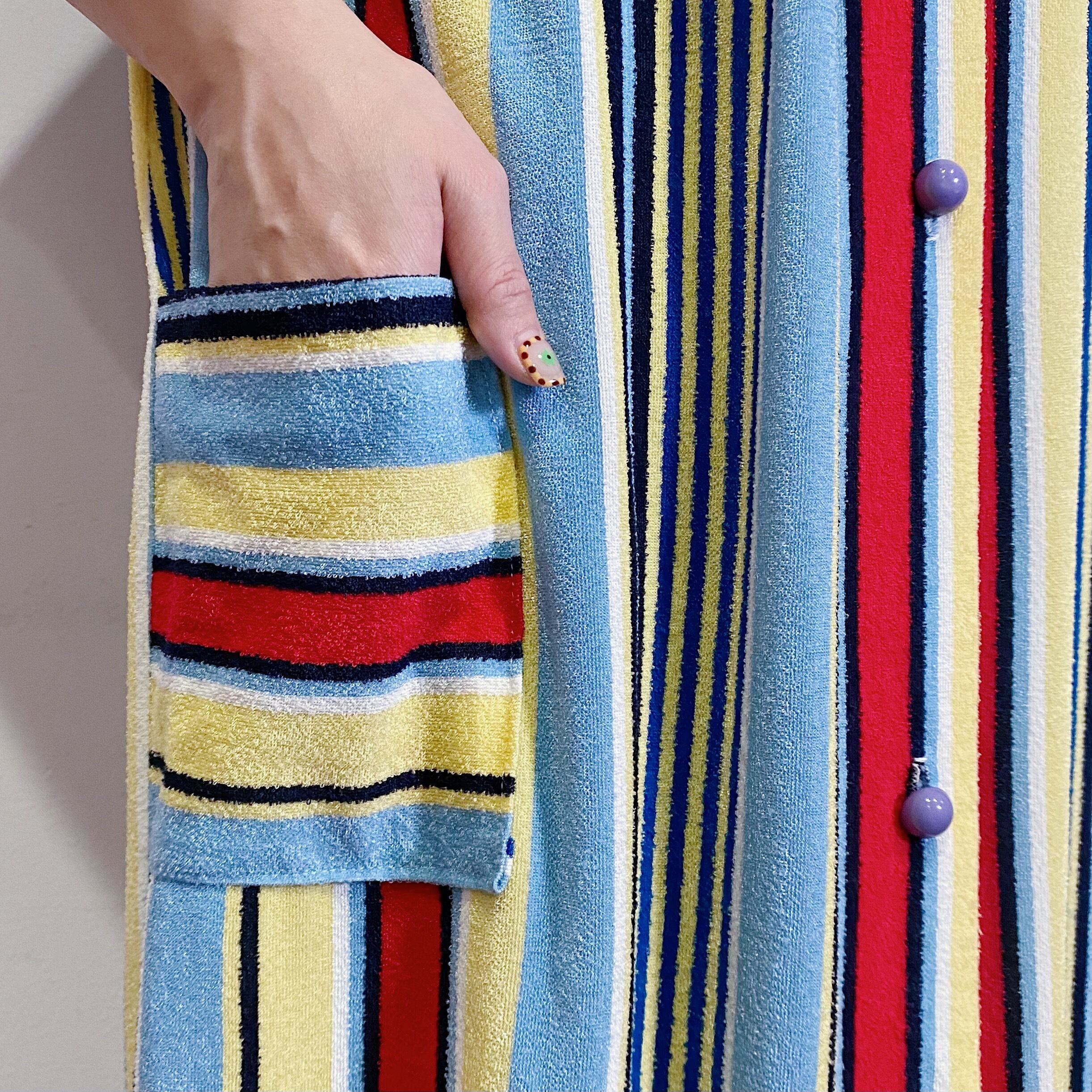 サックスブルー・レッド・イエローのストライプ柄の色合いが可愛い、60年代のパイルガウンです。