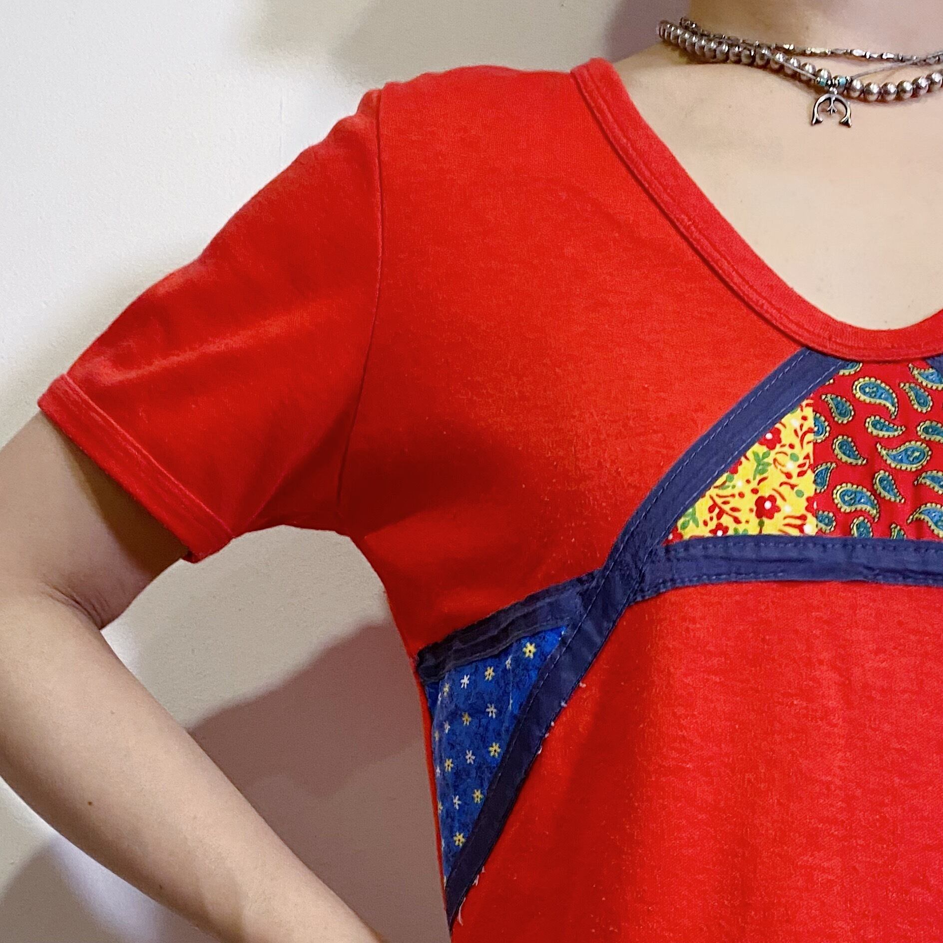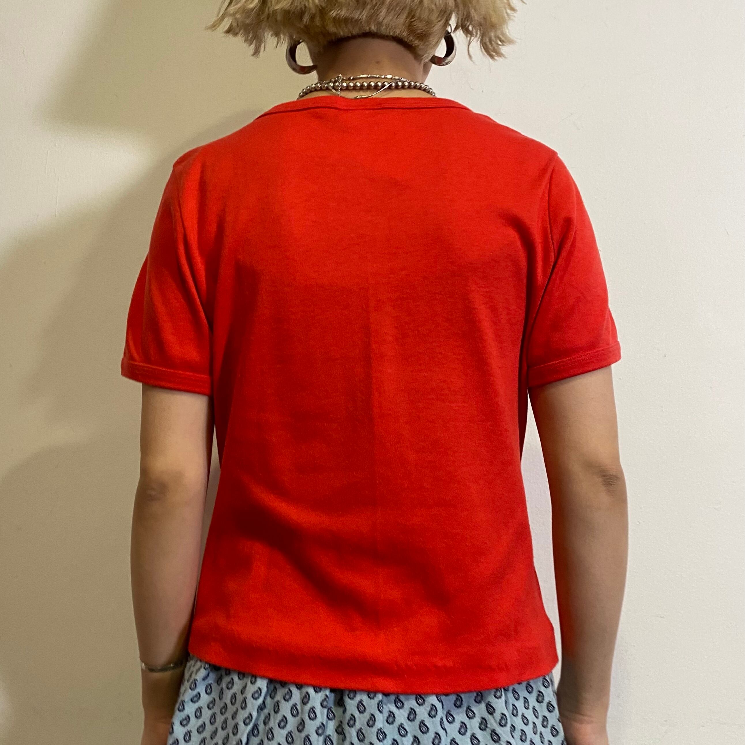パッと目を惹く鮮やかなレッドボディが可愛い、70年代のTシャツです。