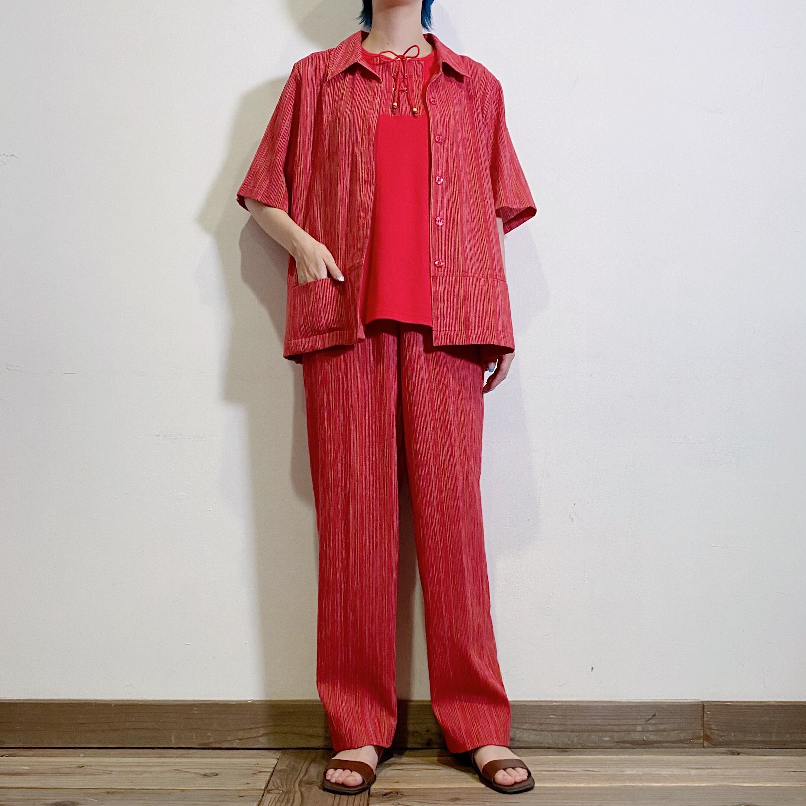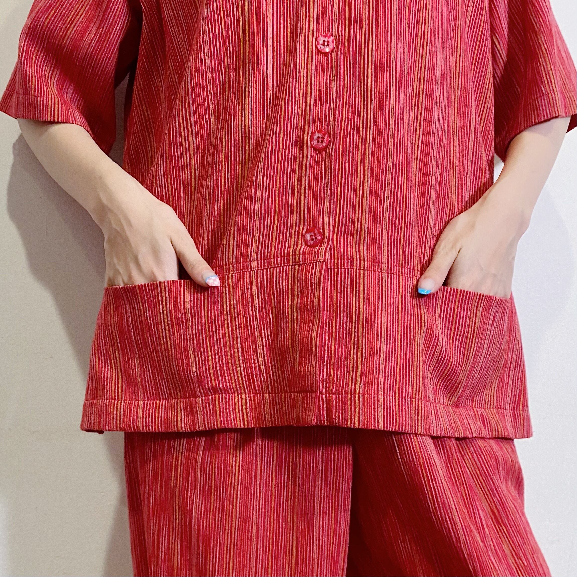 レッドとオレンジの織のようなストライプ柄が可愛い、90年代のセットアップです。