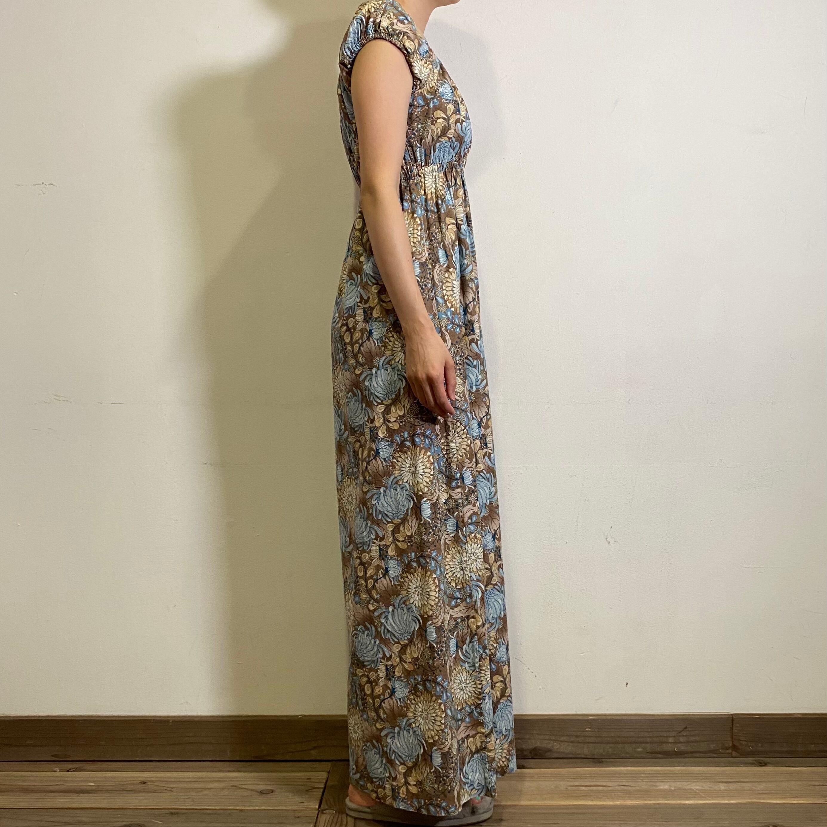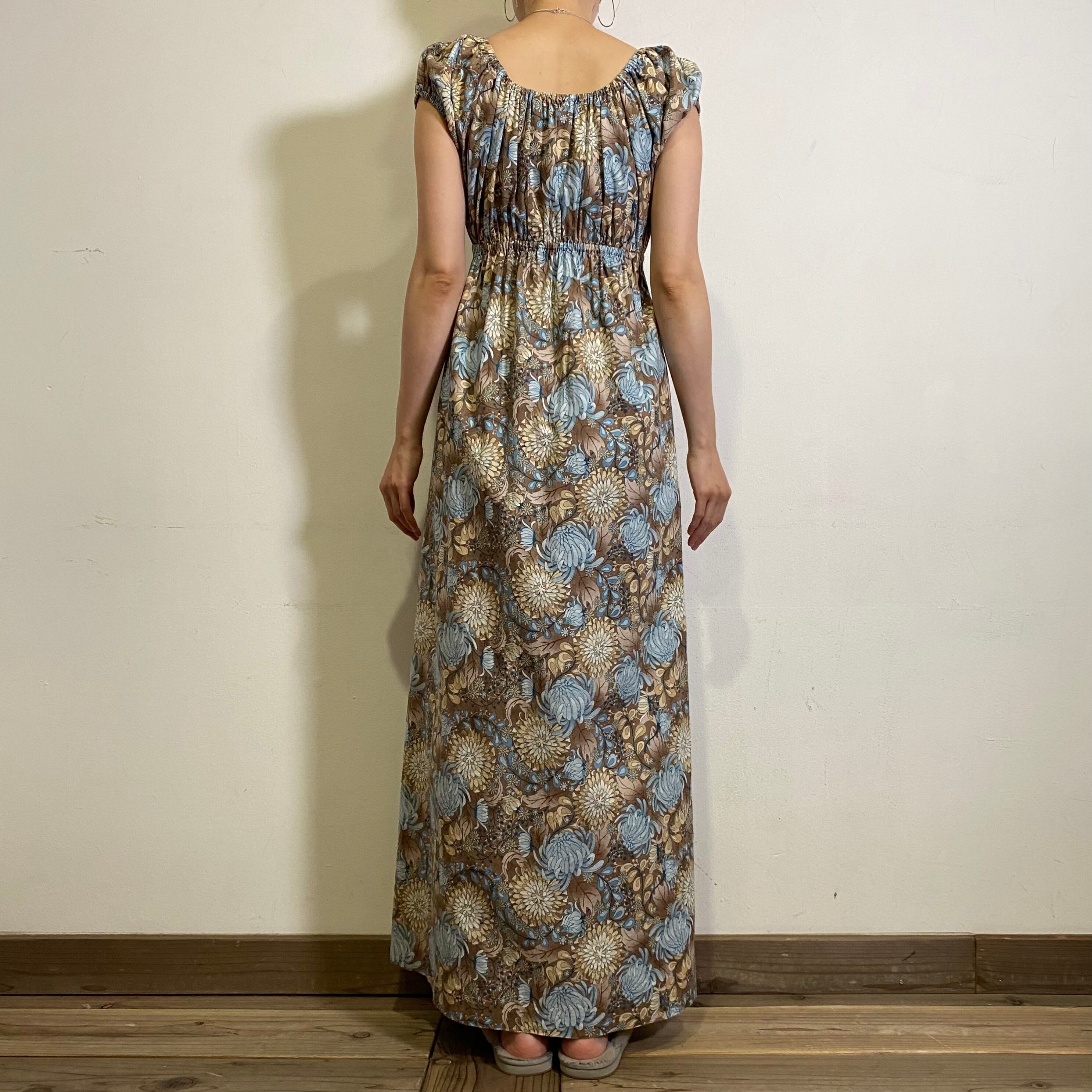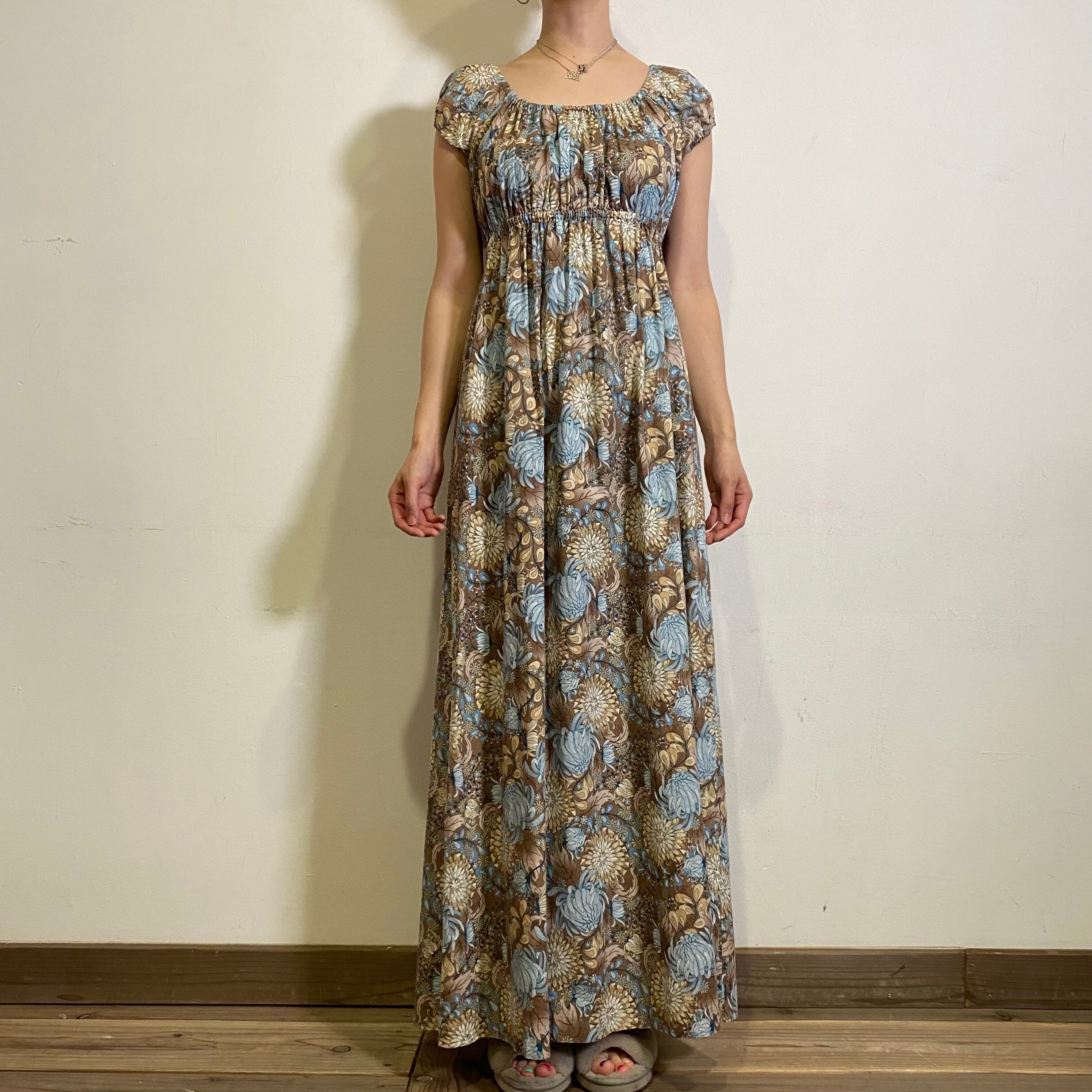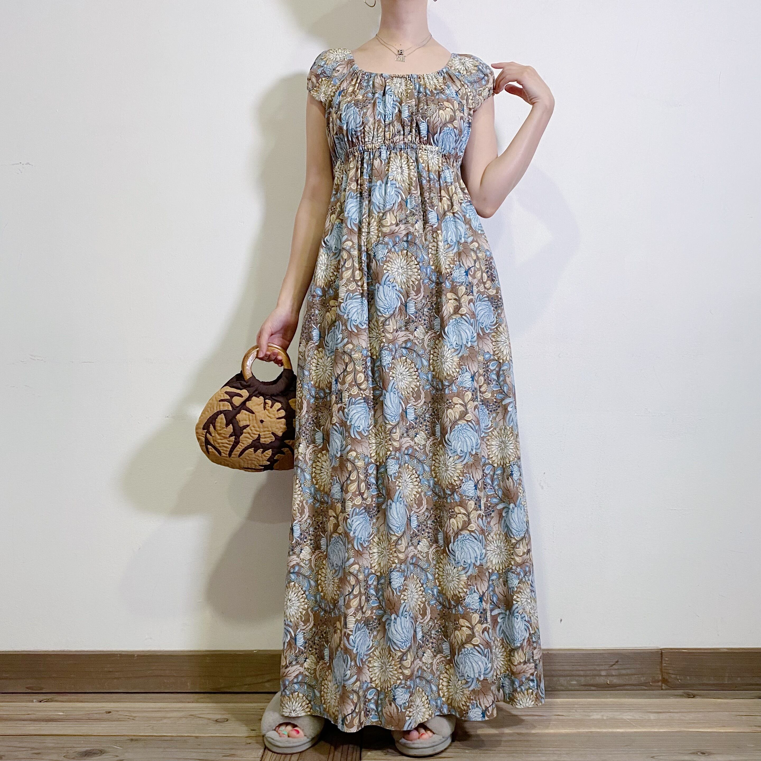 ブラウンとサックスブルーの組み合わせが可愛い、70年代の花柄ワンピースです。