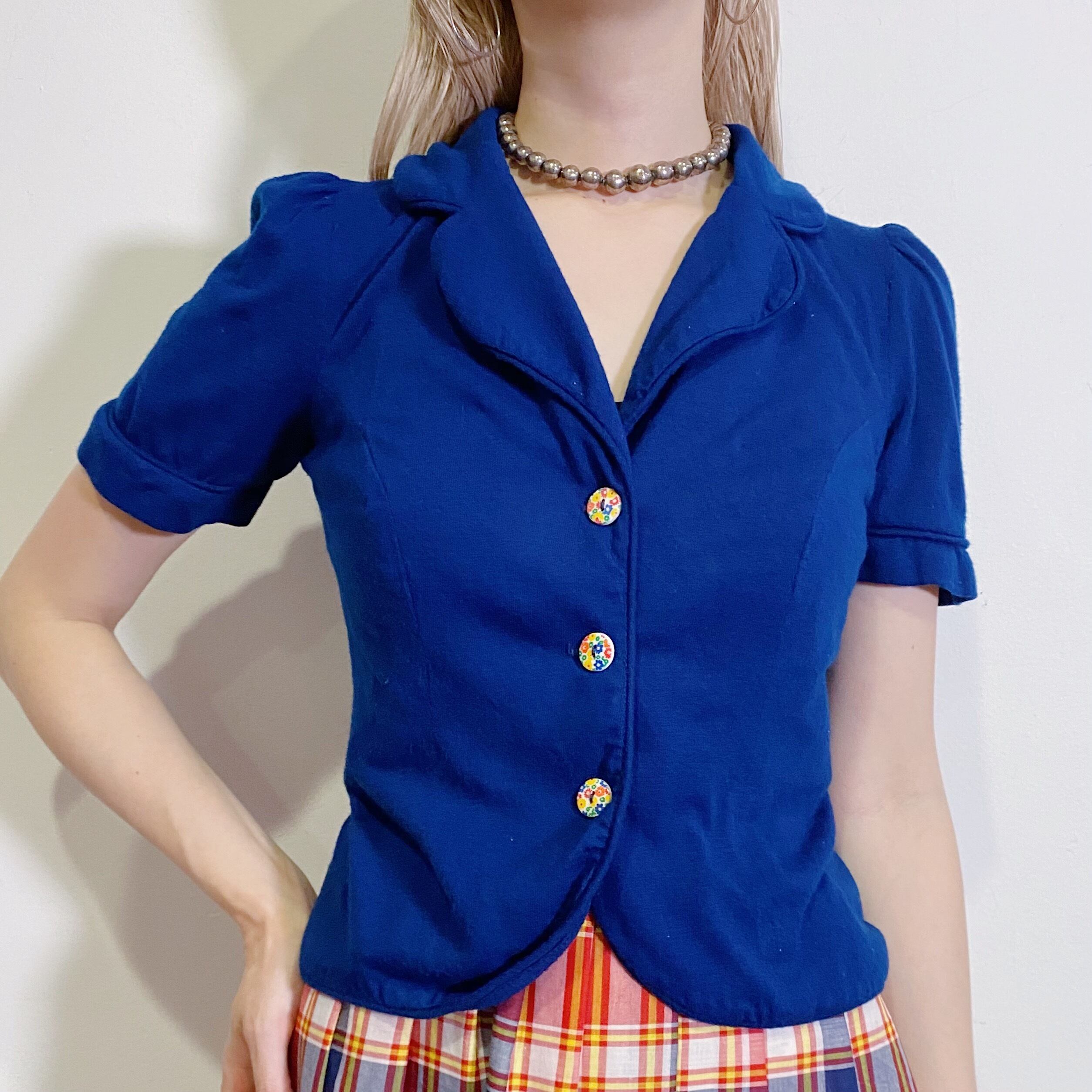 カラフルなお花のボタンがポイントになった70年代の半袖シャツです。
