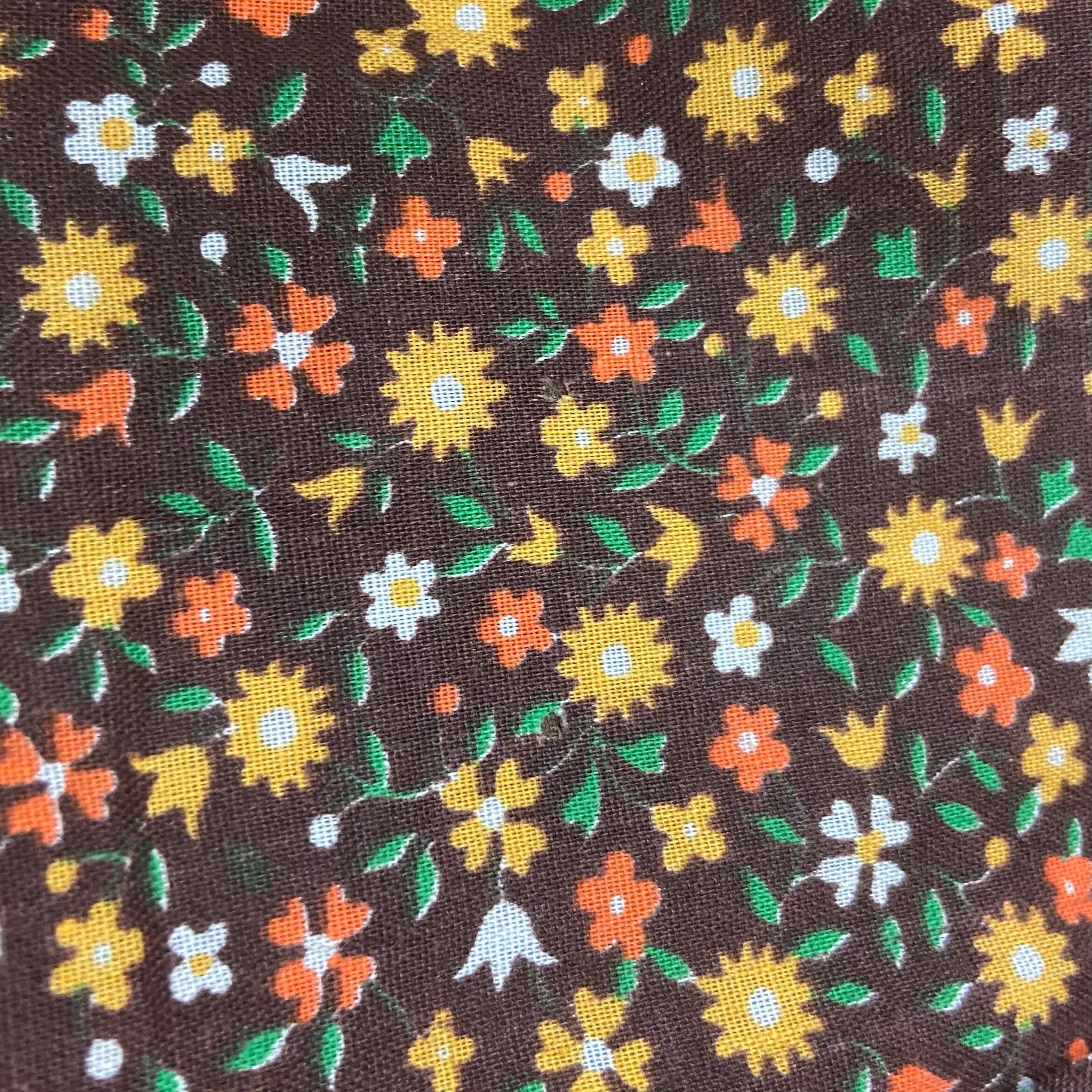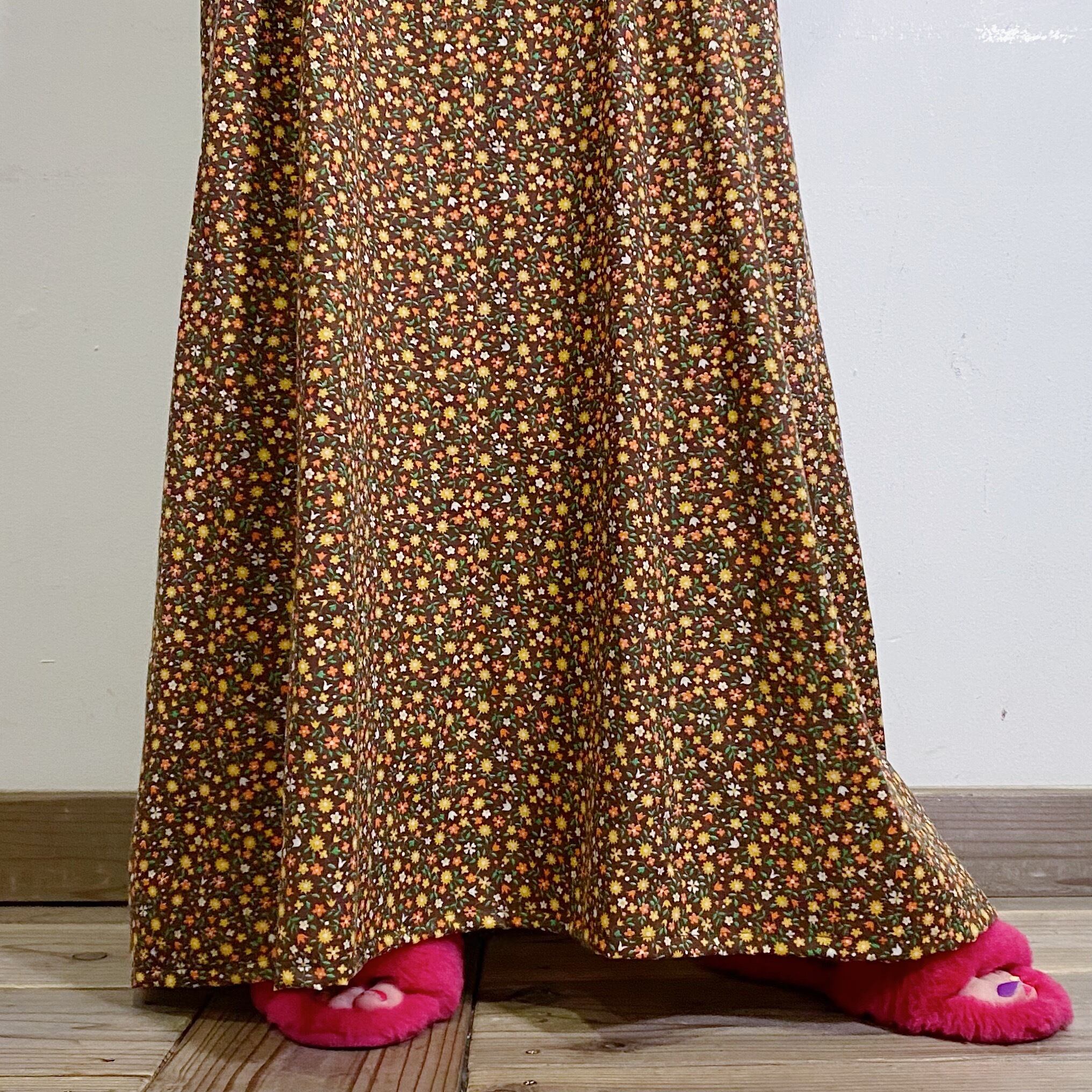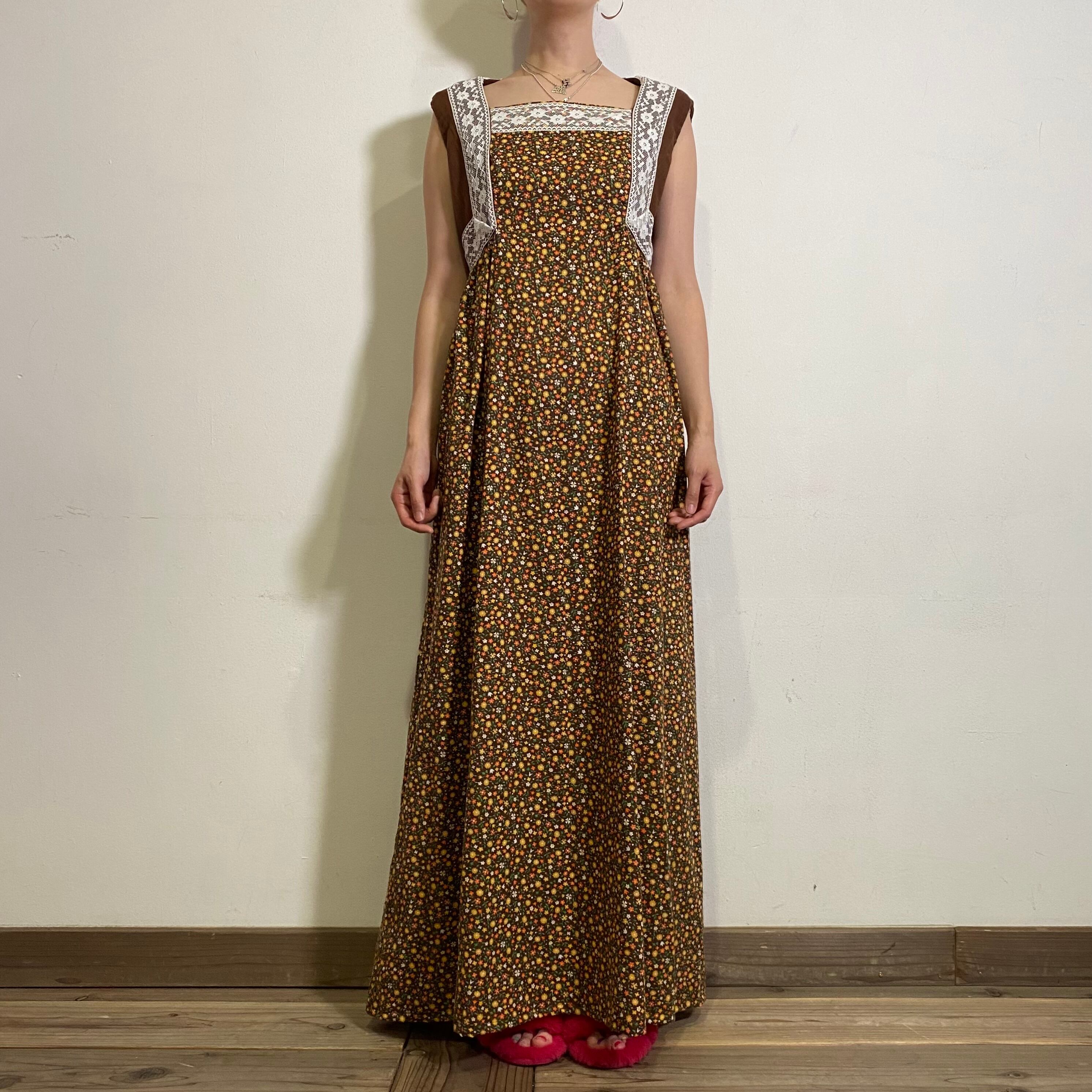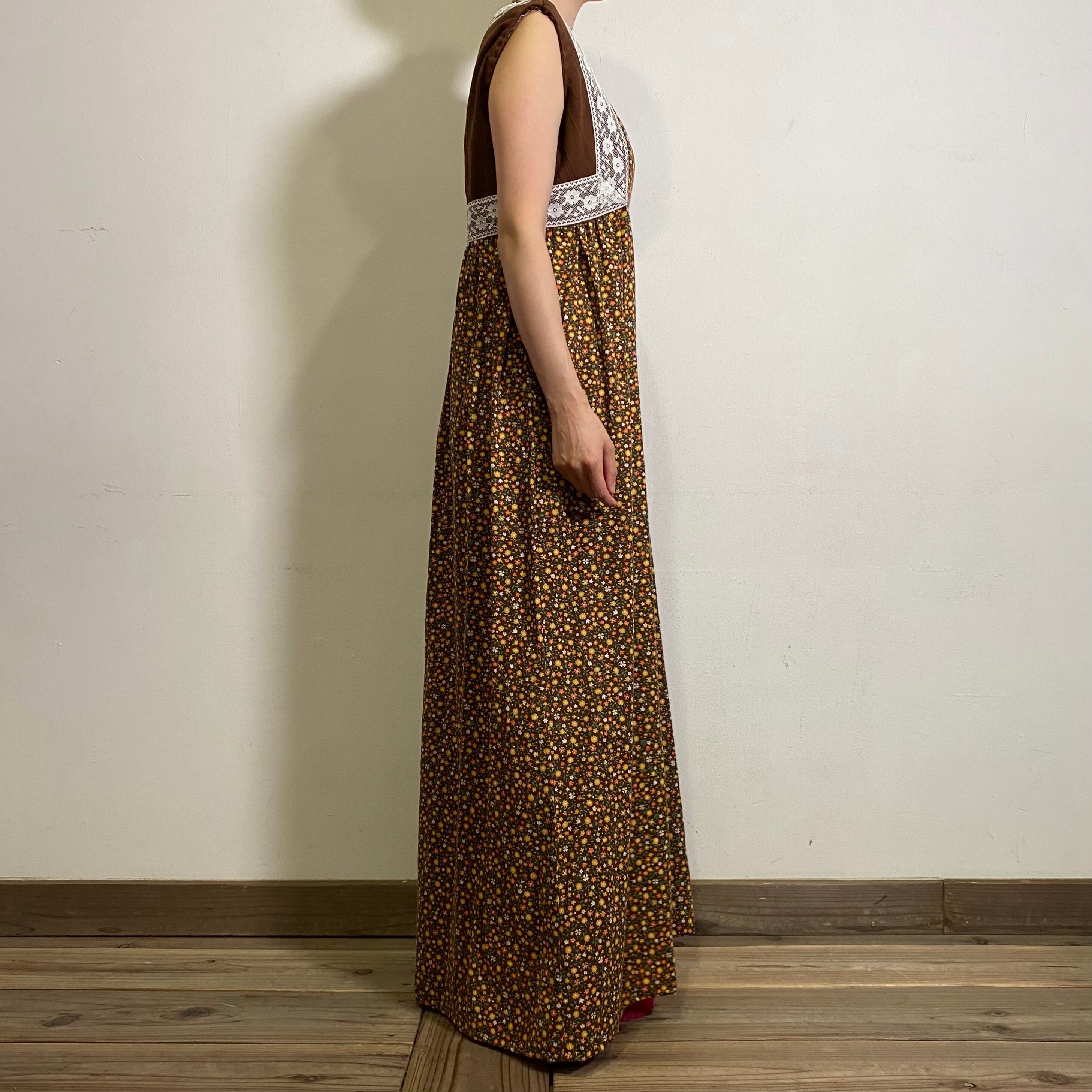 ブラウンベースの花柄にレースの組み合わせが可愛い、70年代のワンピースです。