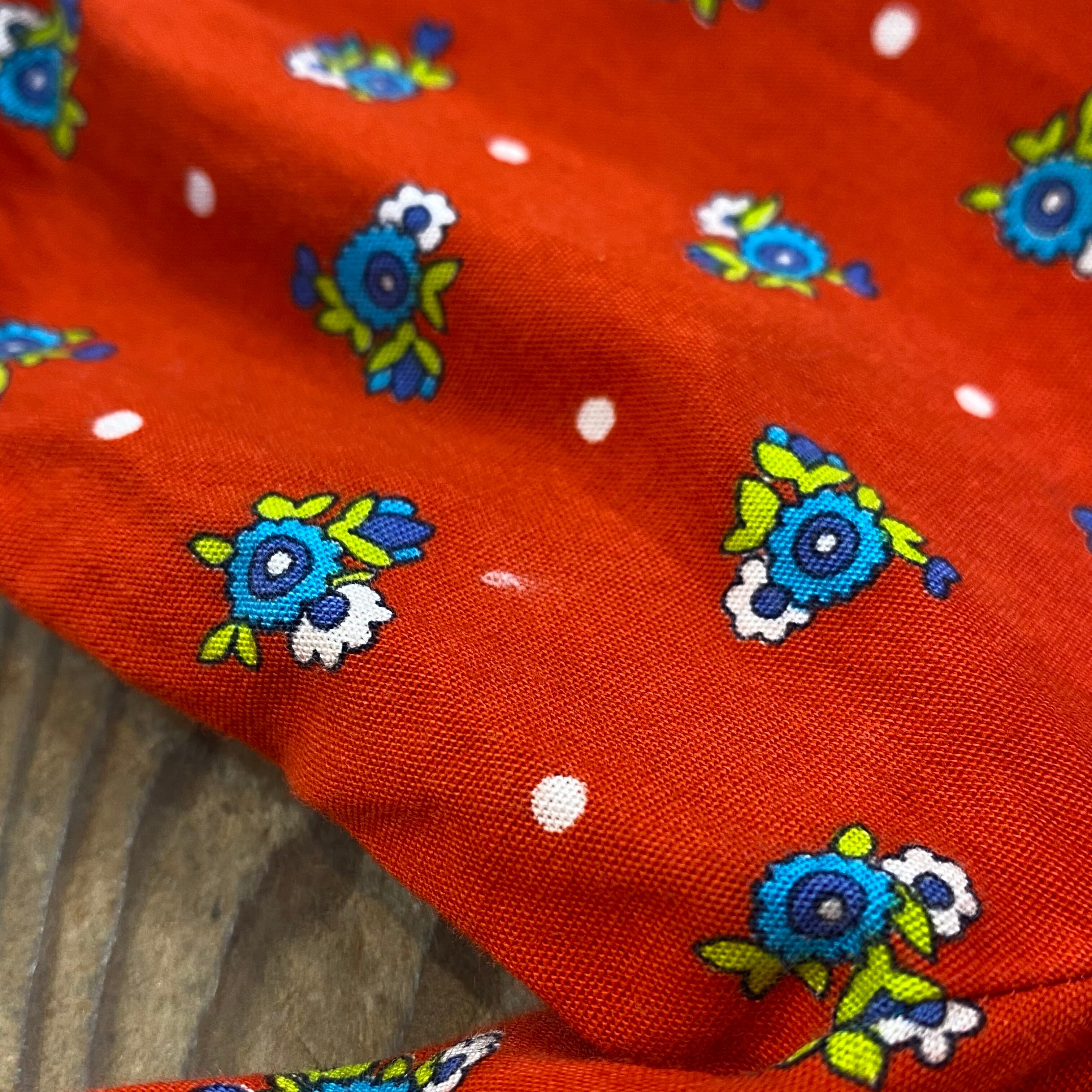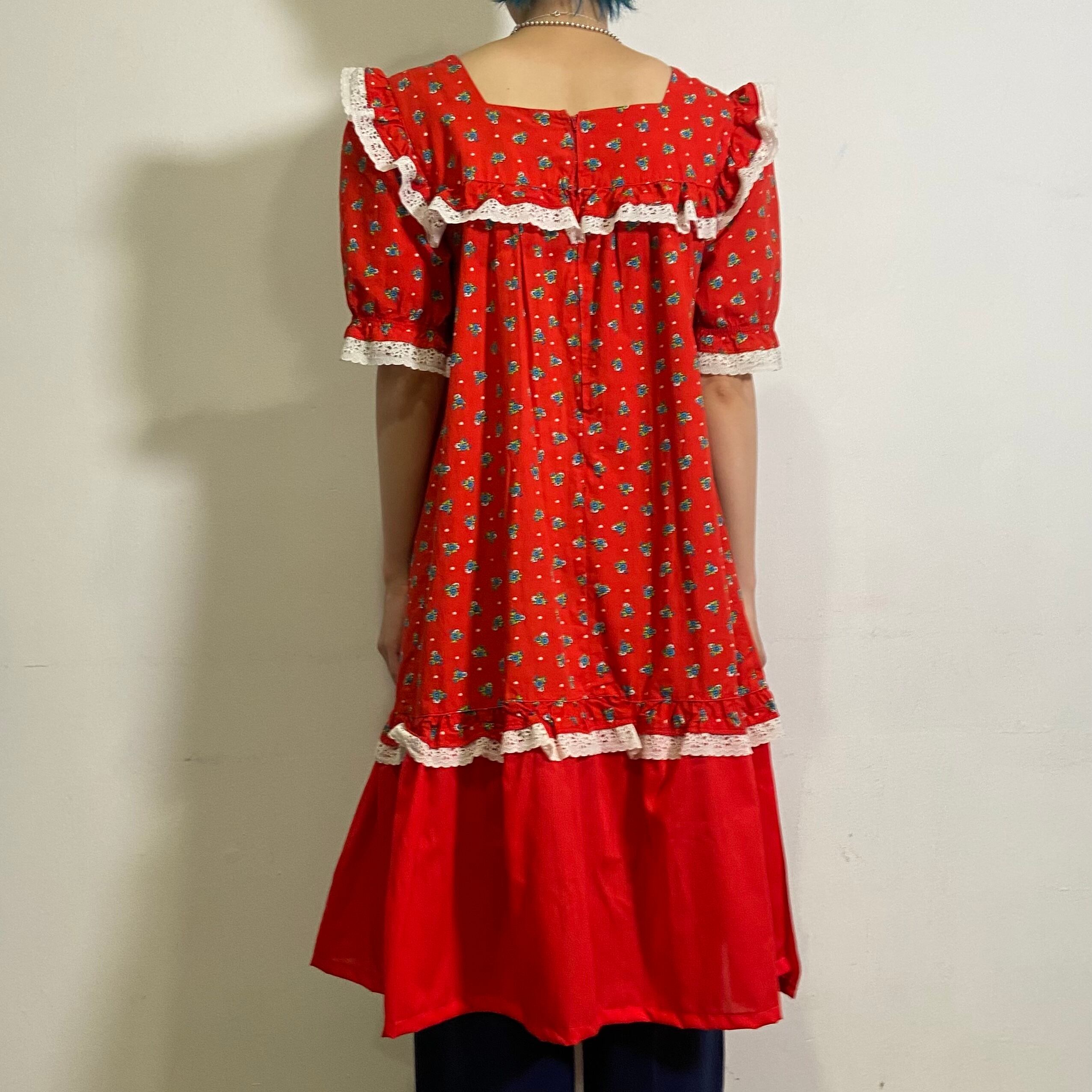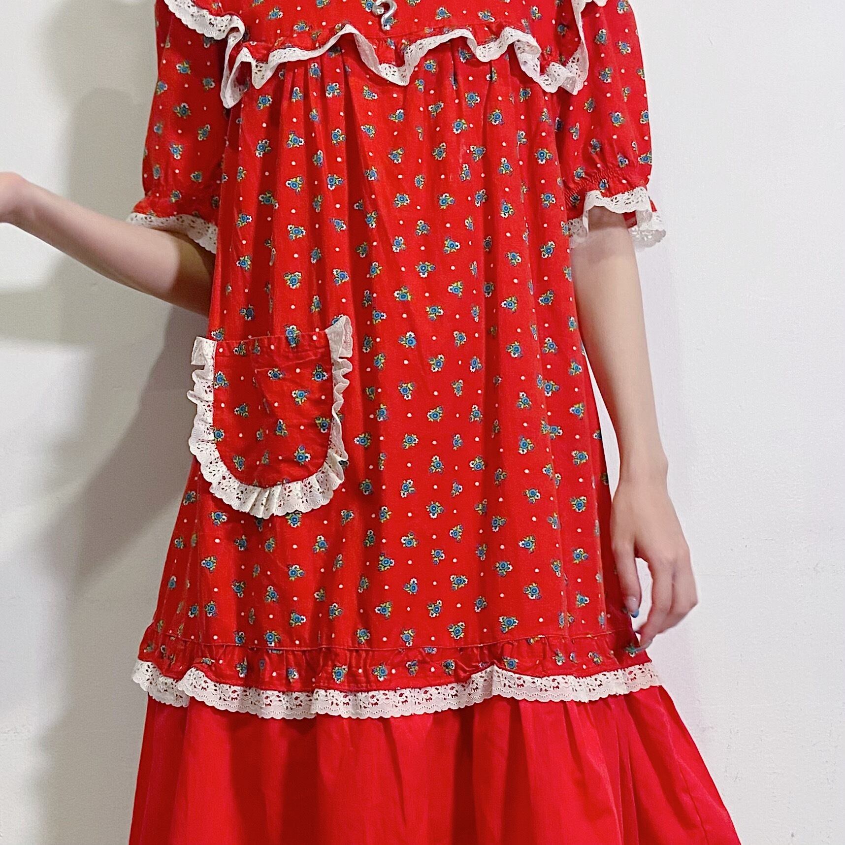 鮮やかなレッドベースの花柄が可愛い、70年代のワンピースです。