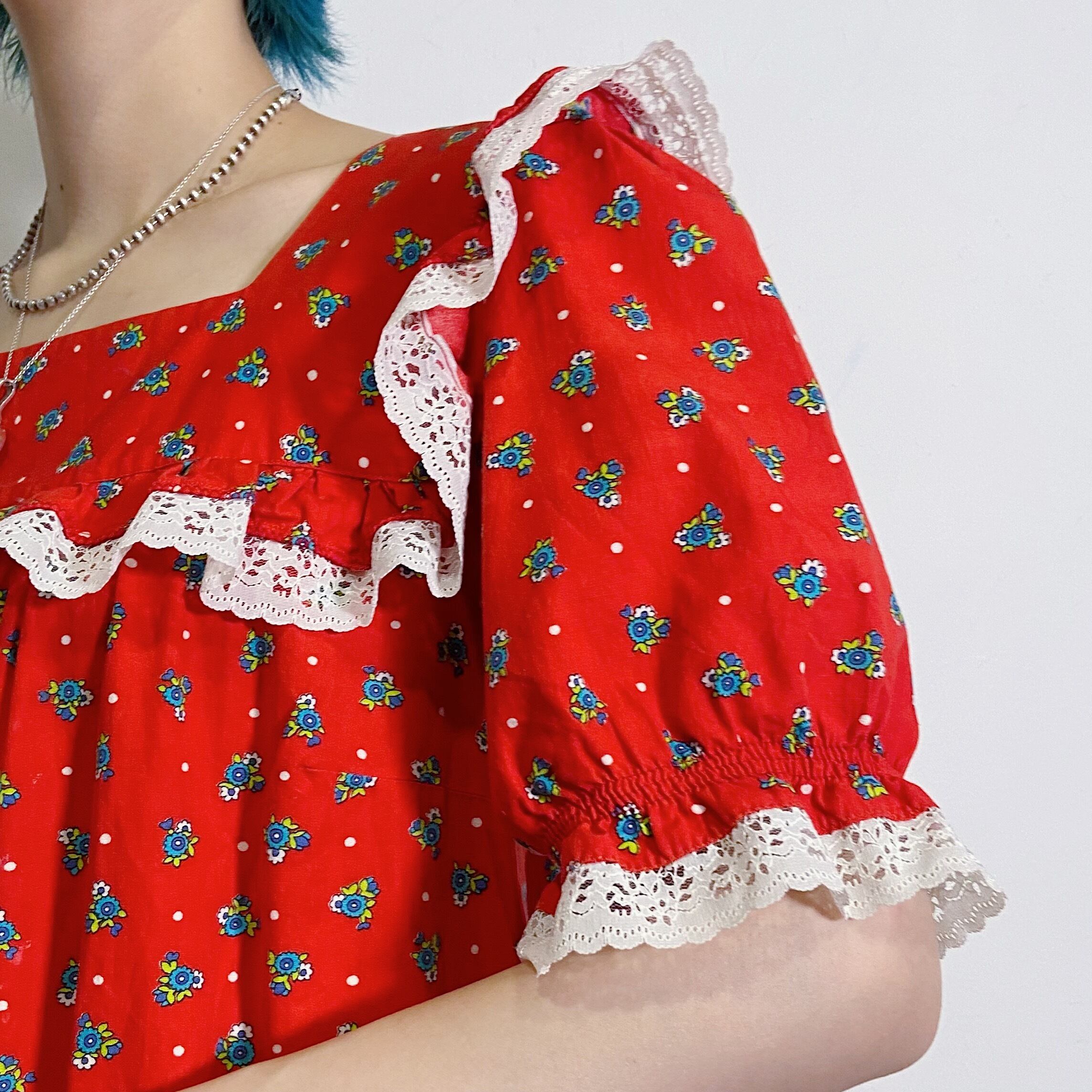 70s red flower printed cotton smock dress