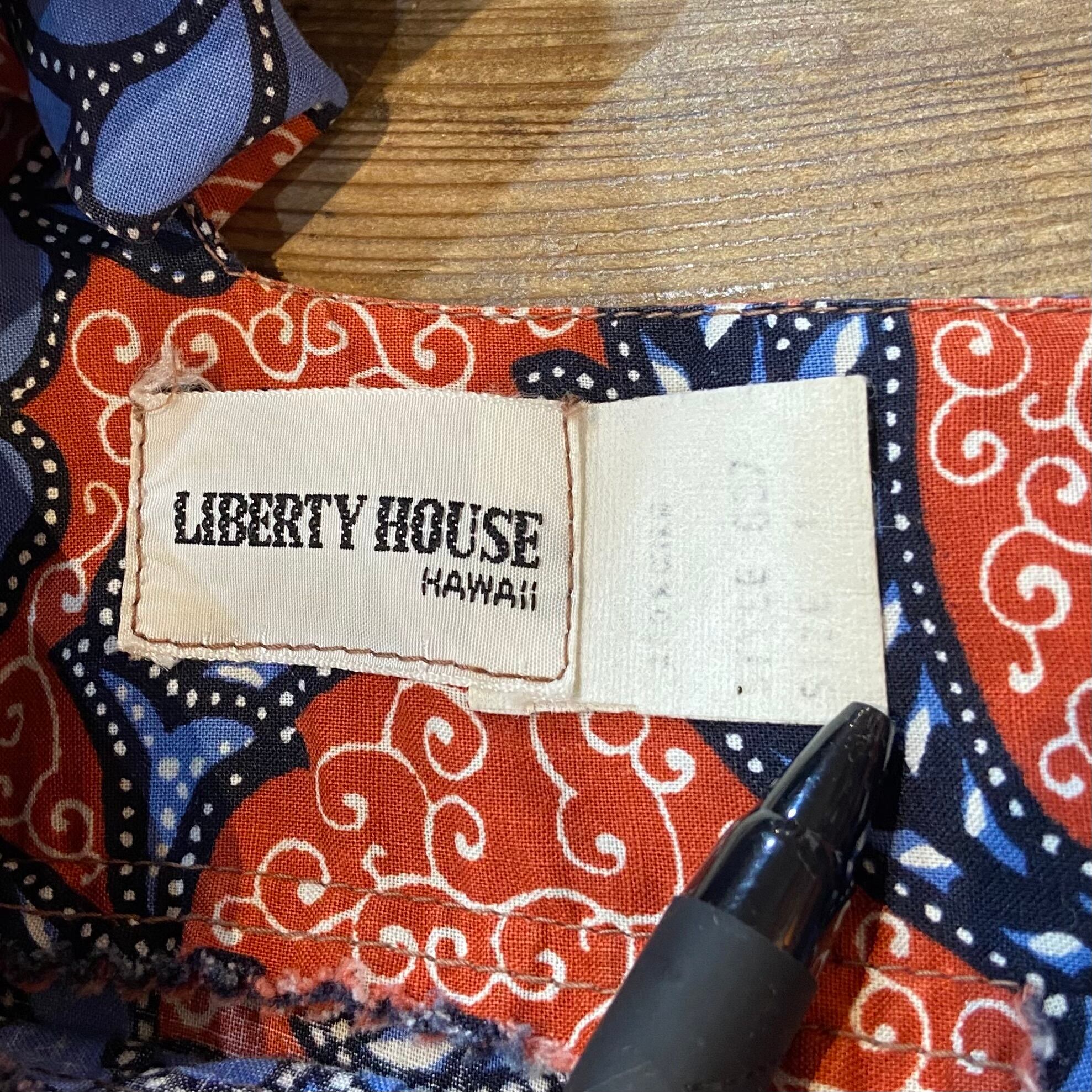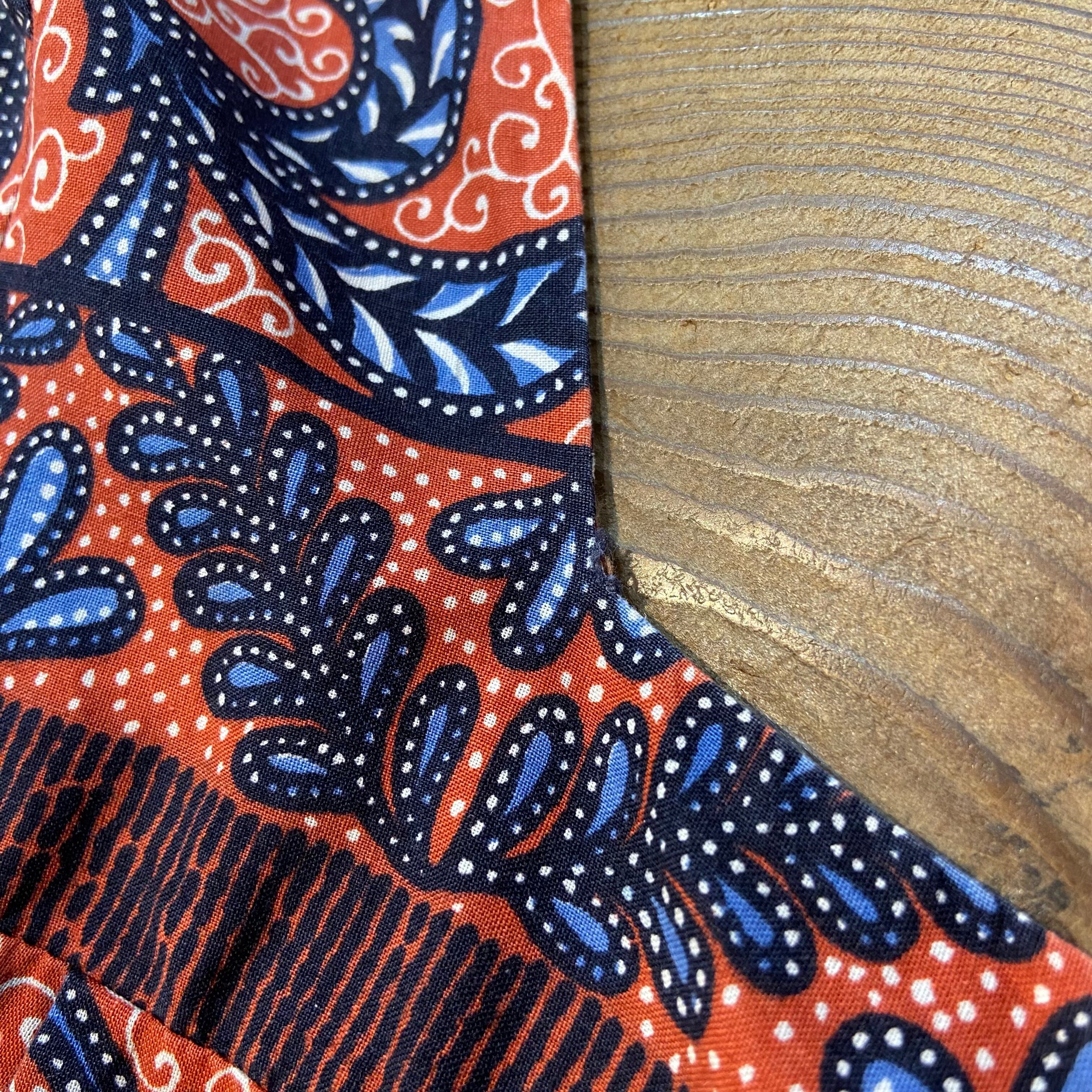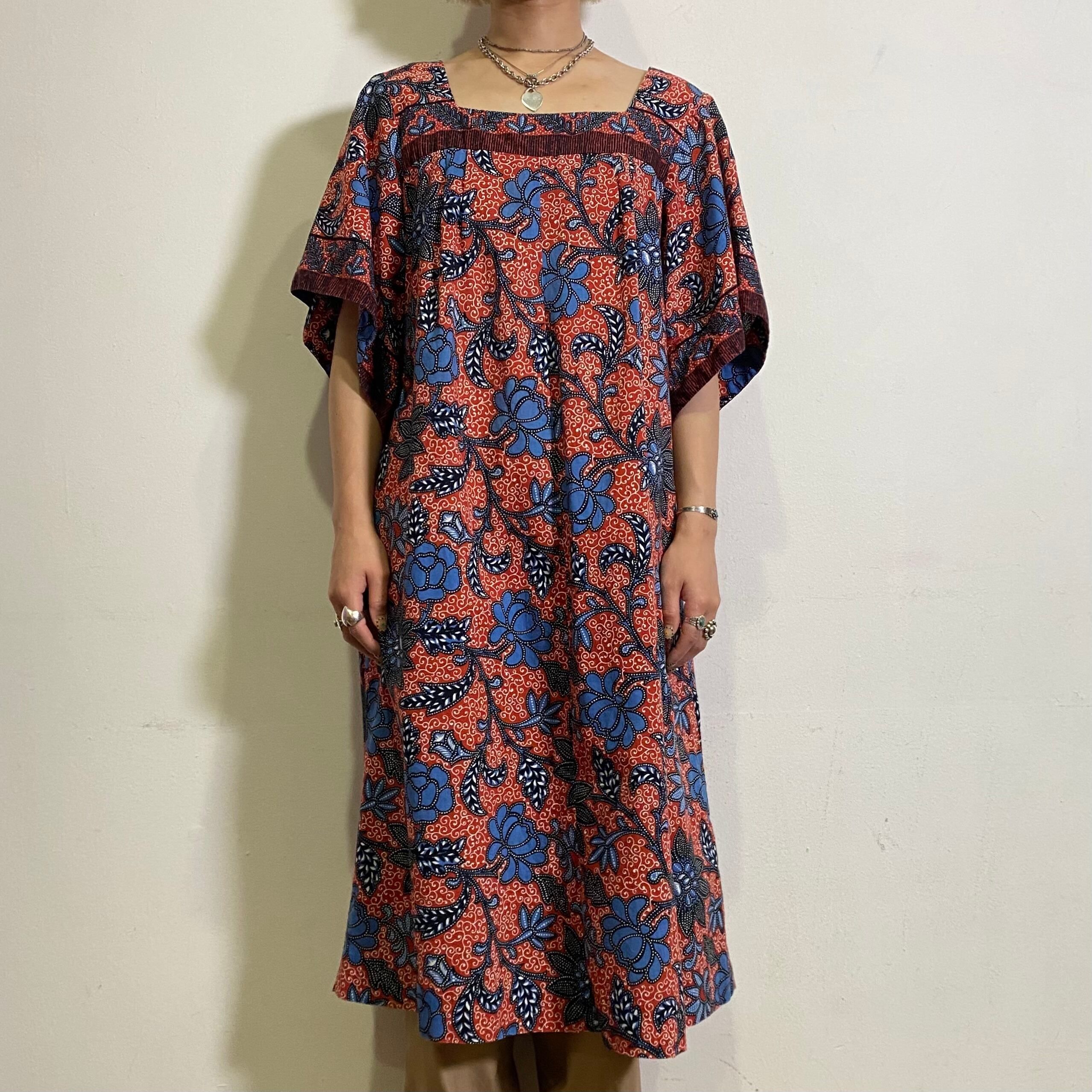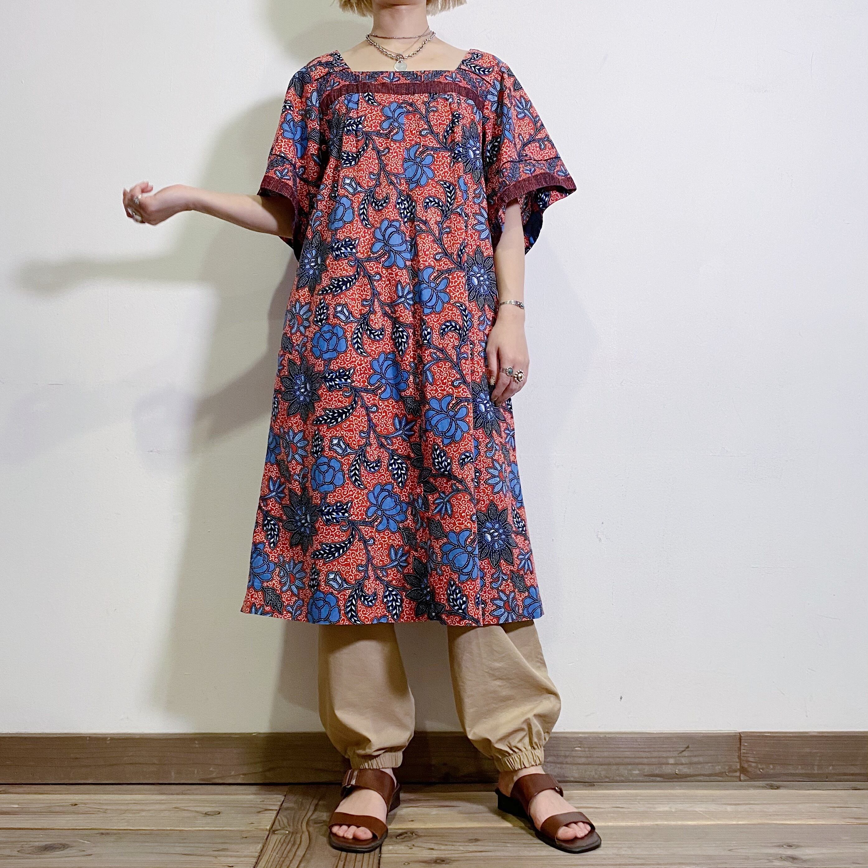 レッドベースにブルーの花柄が可愛い、70年代のワンピースです。