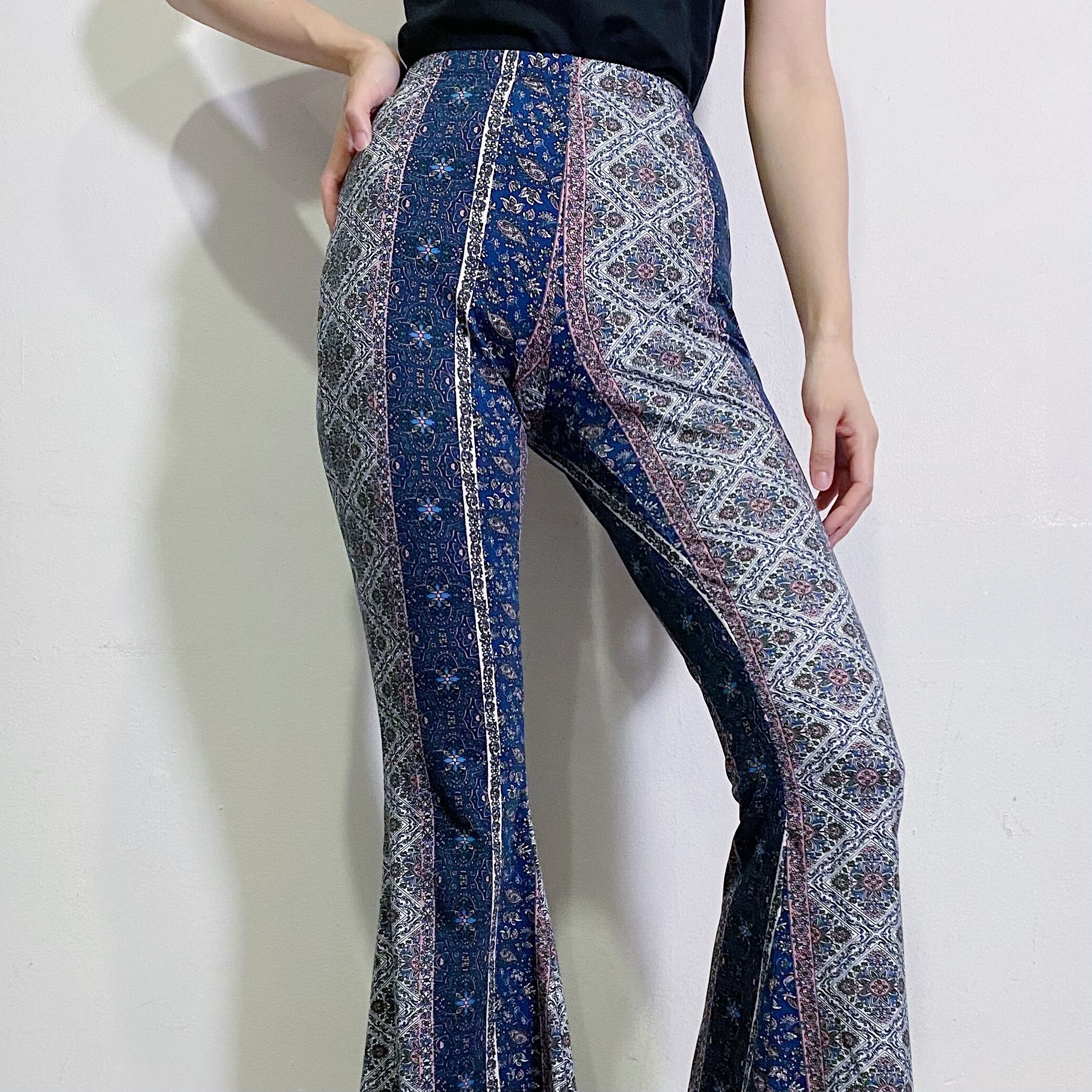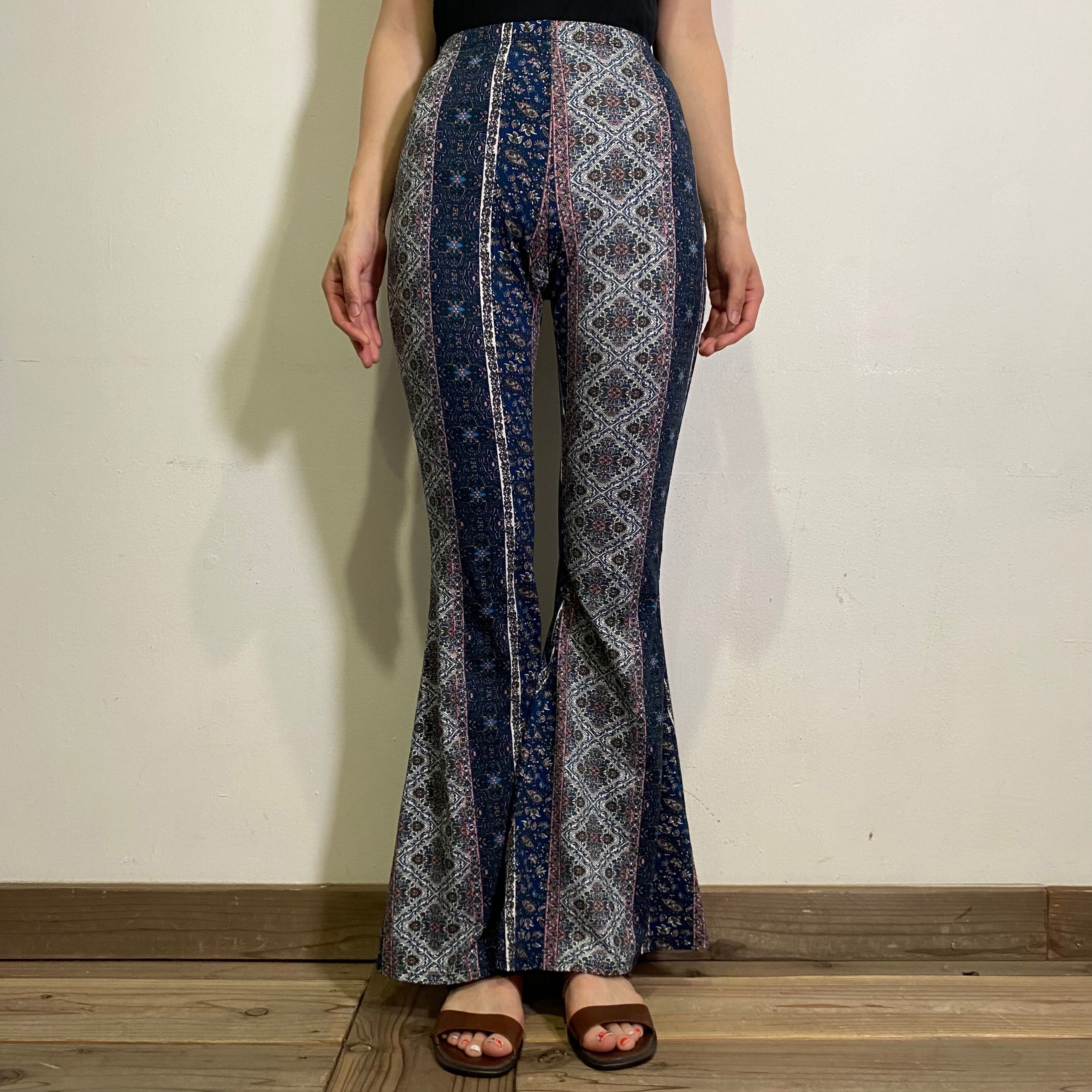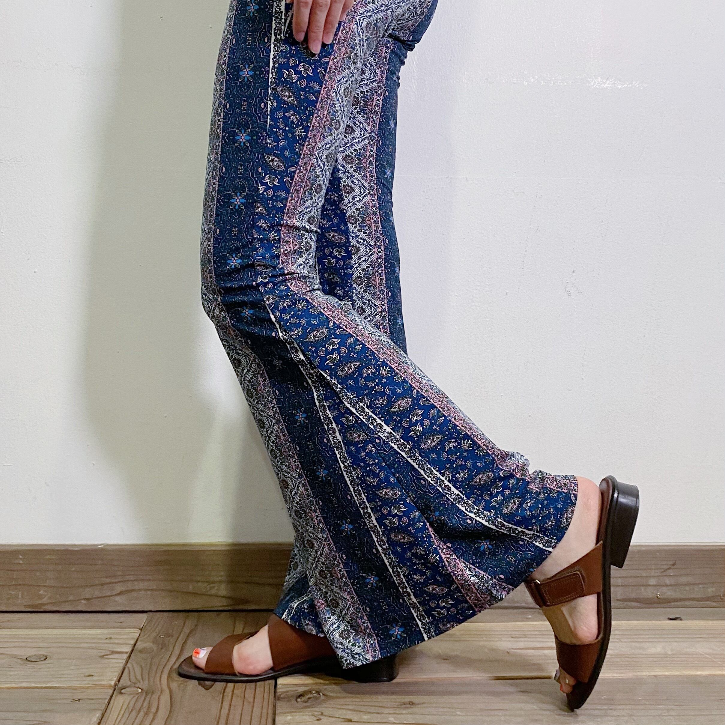 ネイビーとピンクの壁紙のようなテキスタイルが可愛い、フレアパンツです。
