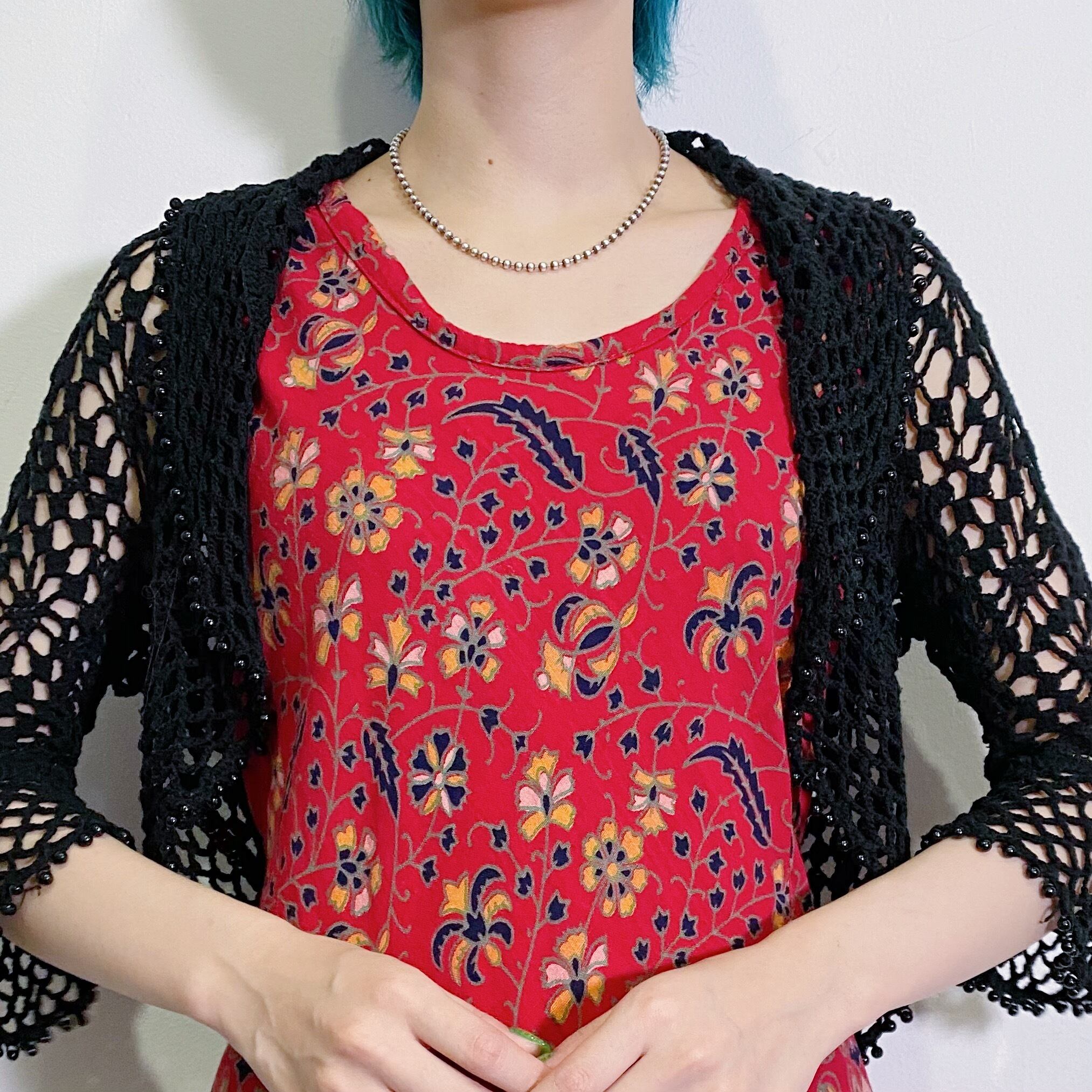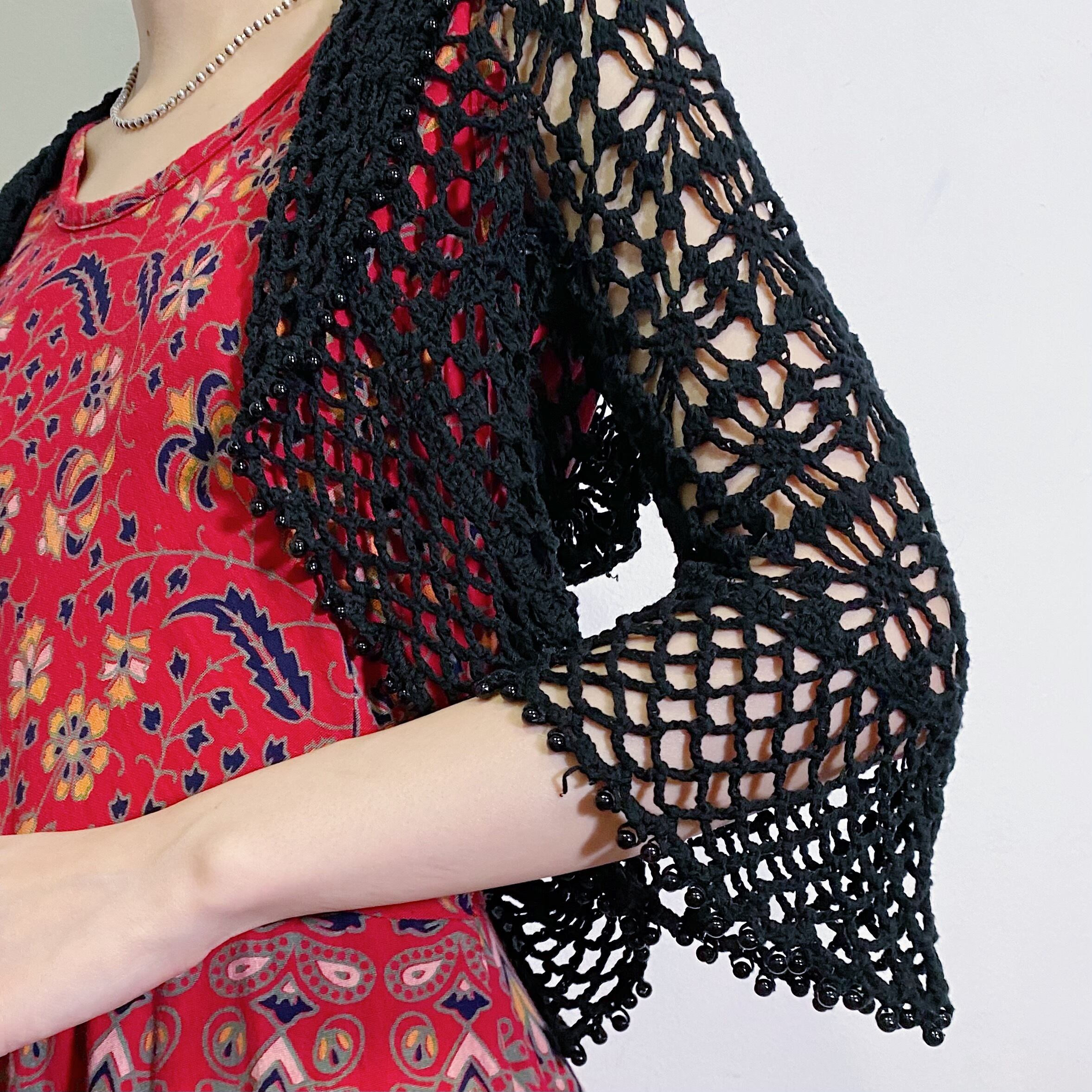 ブラックカラーで大変使い勝手の良い、クロシェカーディガンです。