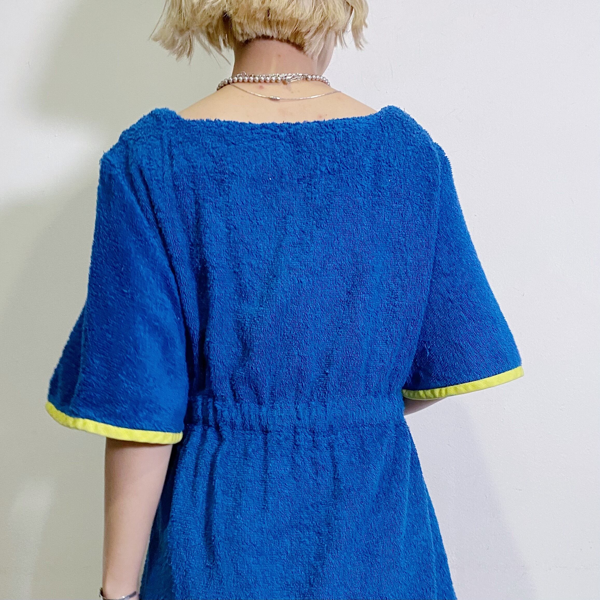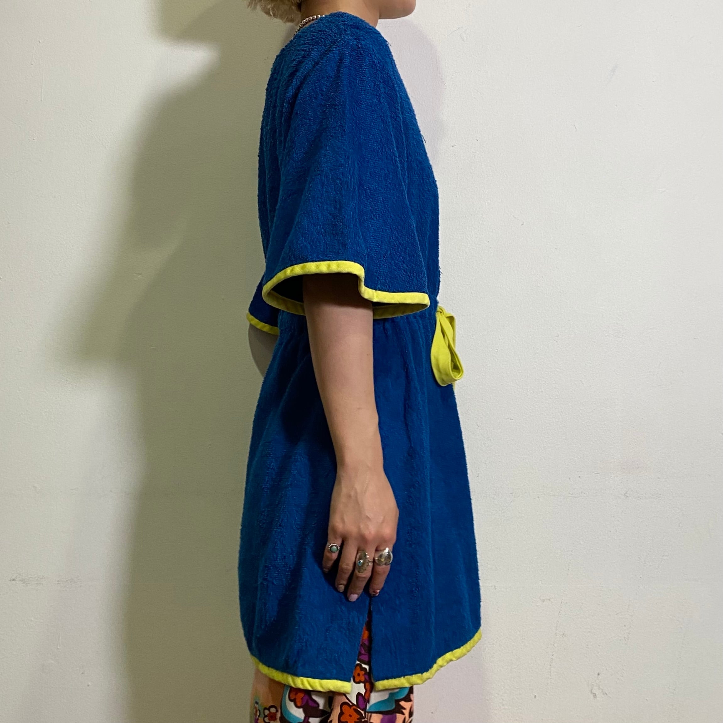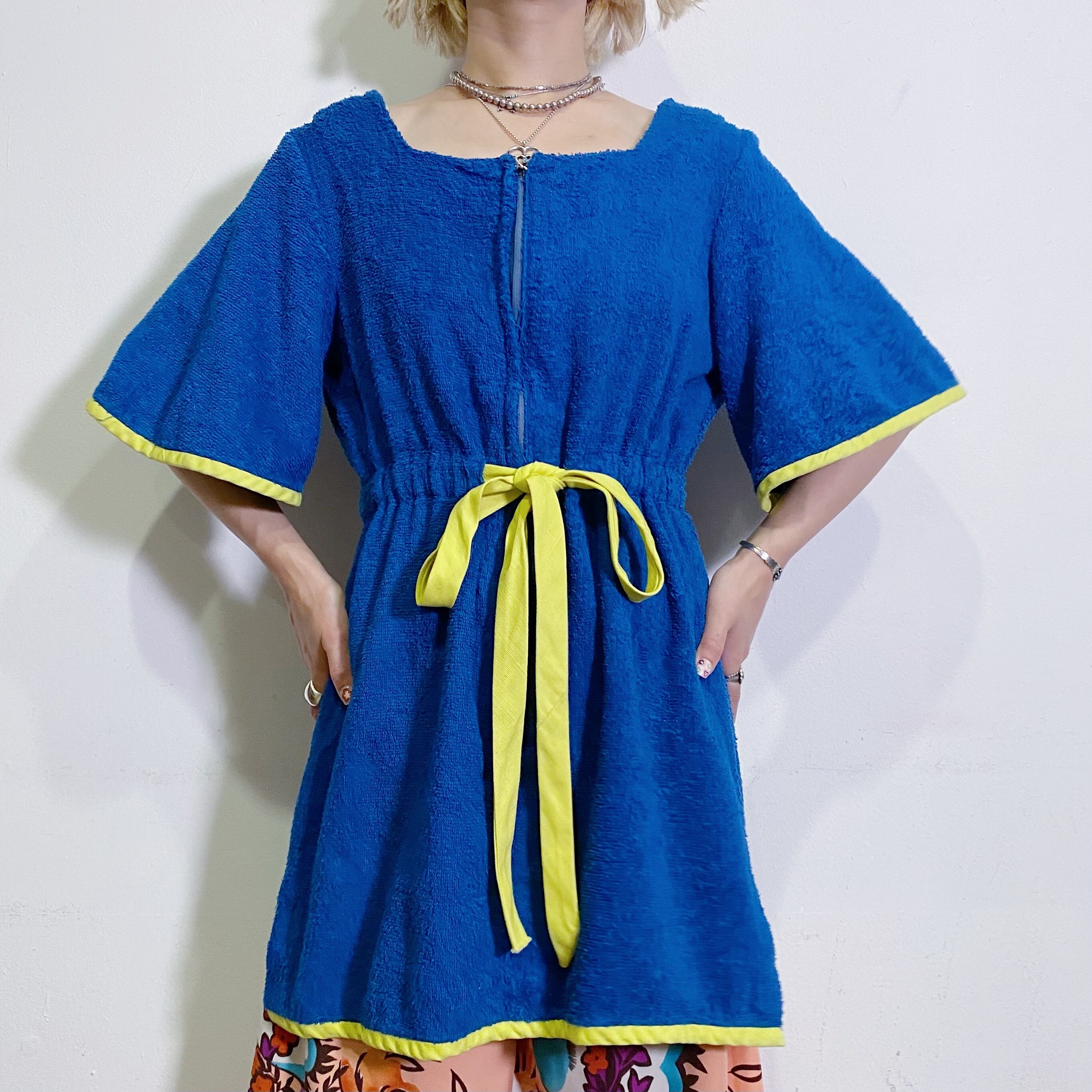 ブルーのパイル地にイエローのパイピングが差し色になった、70年代のミニワンピースです。