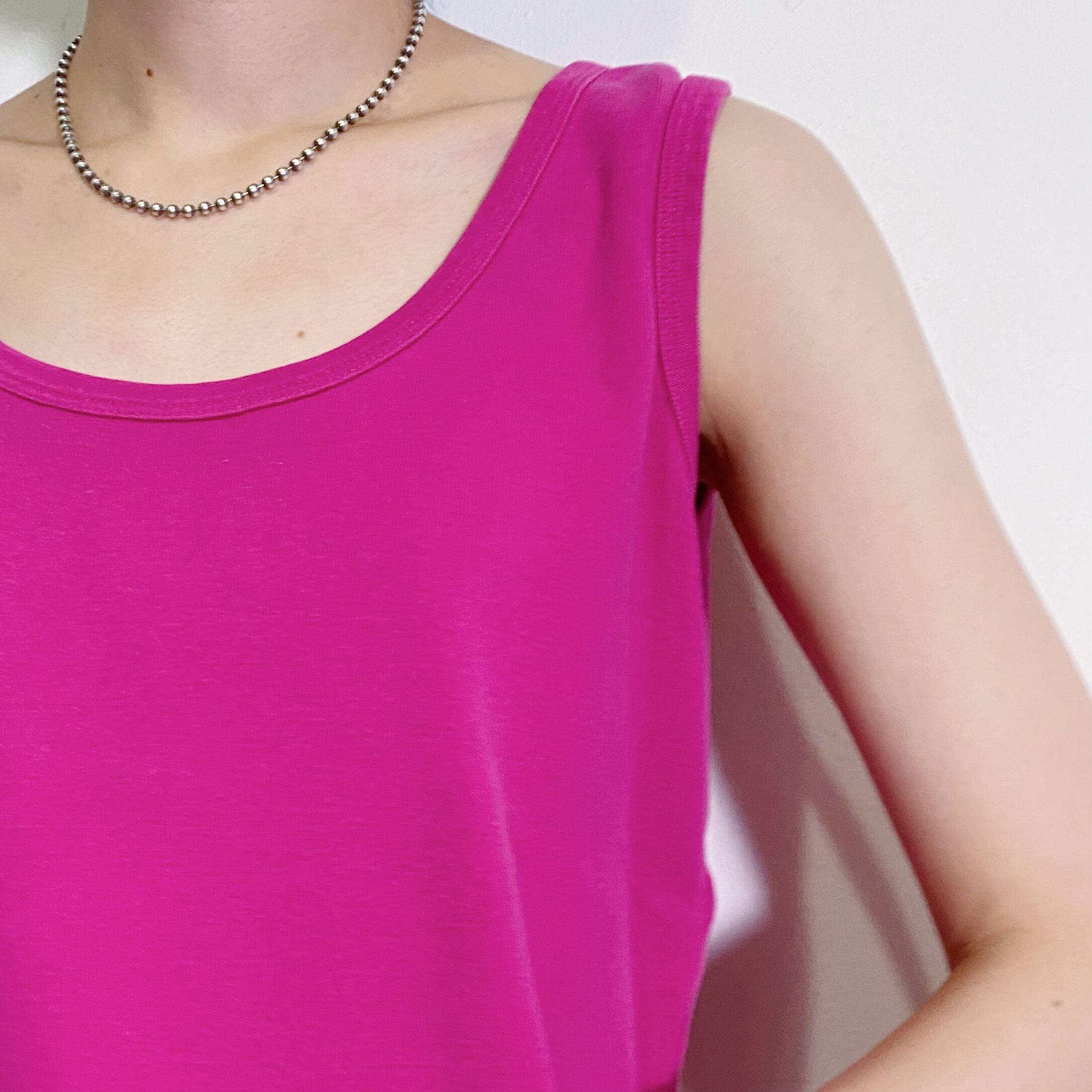 鮮やかなショッキングピンクの色合いが可愛い、ノースリーブトップスです。
