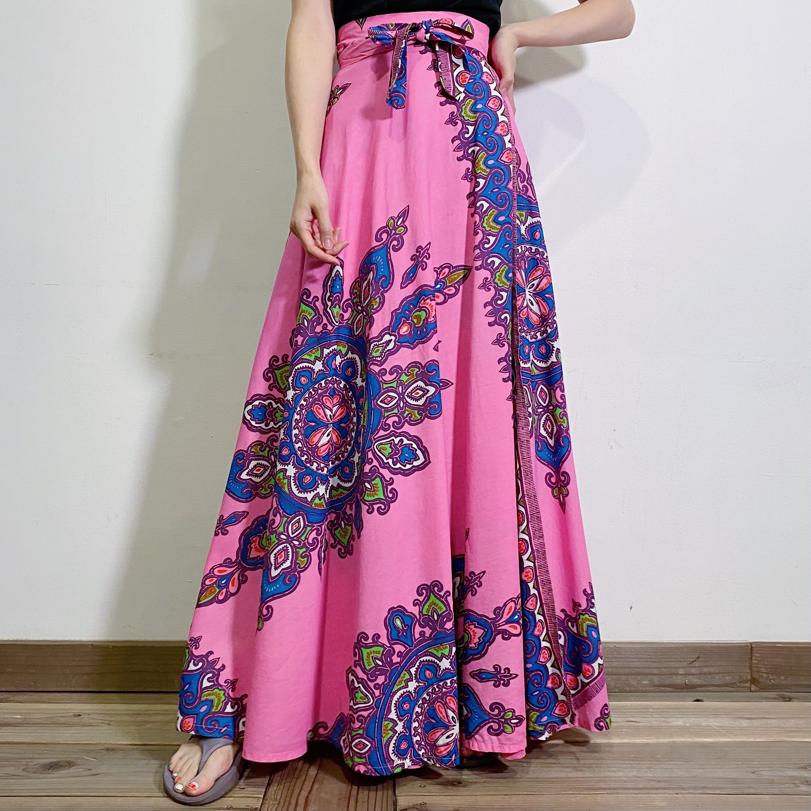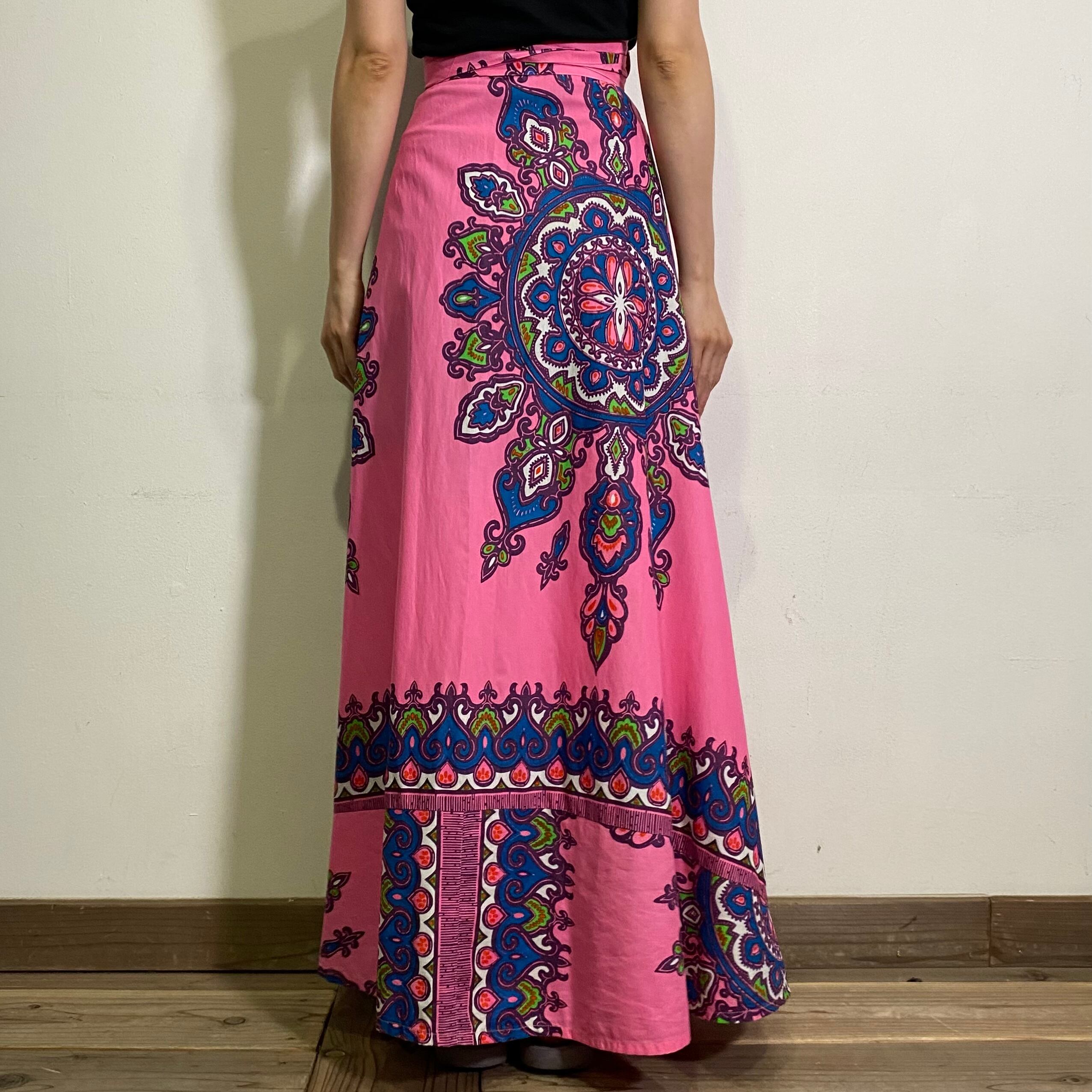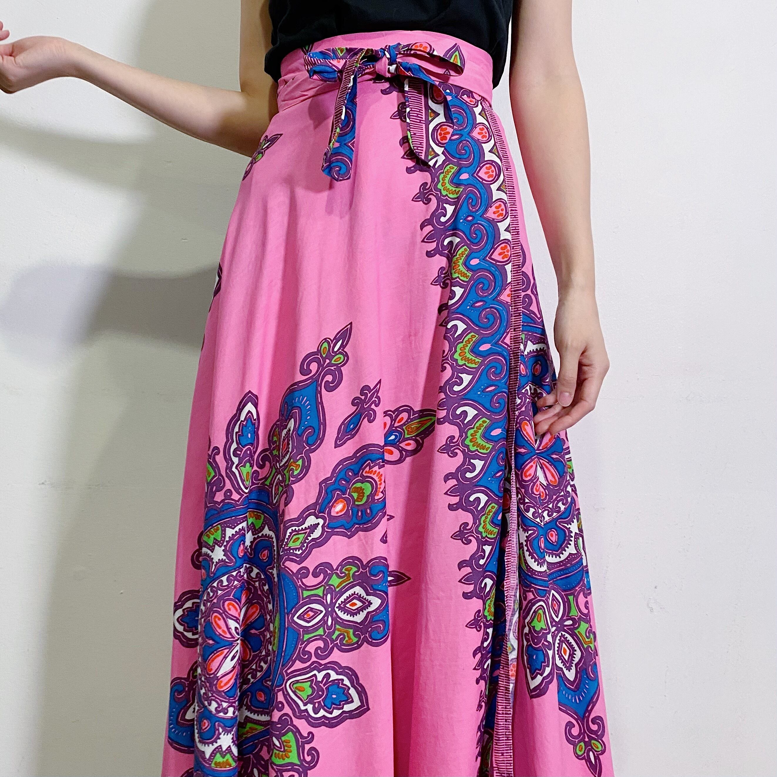 色鮮やかなピンクカラーにブルーとグリーンの、エスニックムードなプリントが可愛い70年代のラップスカートです。
