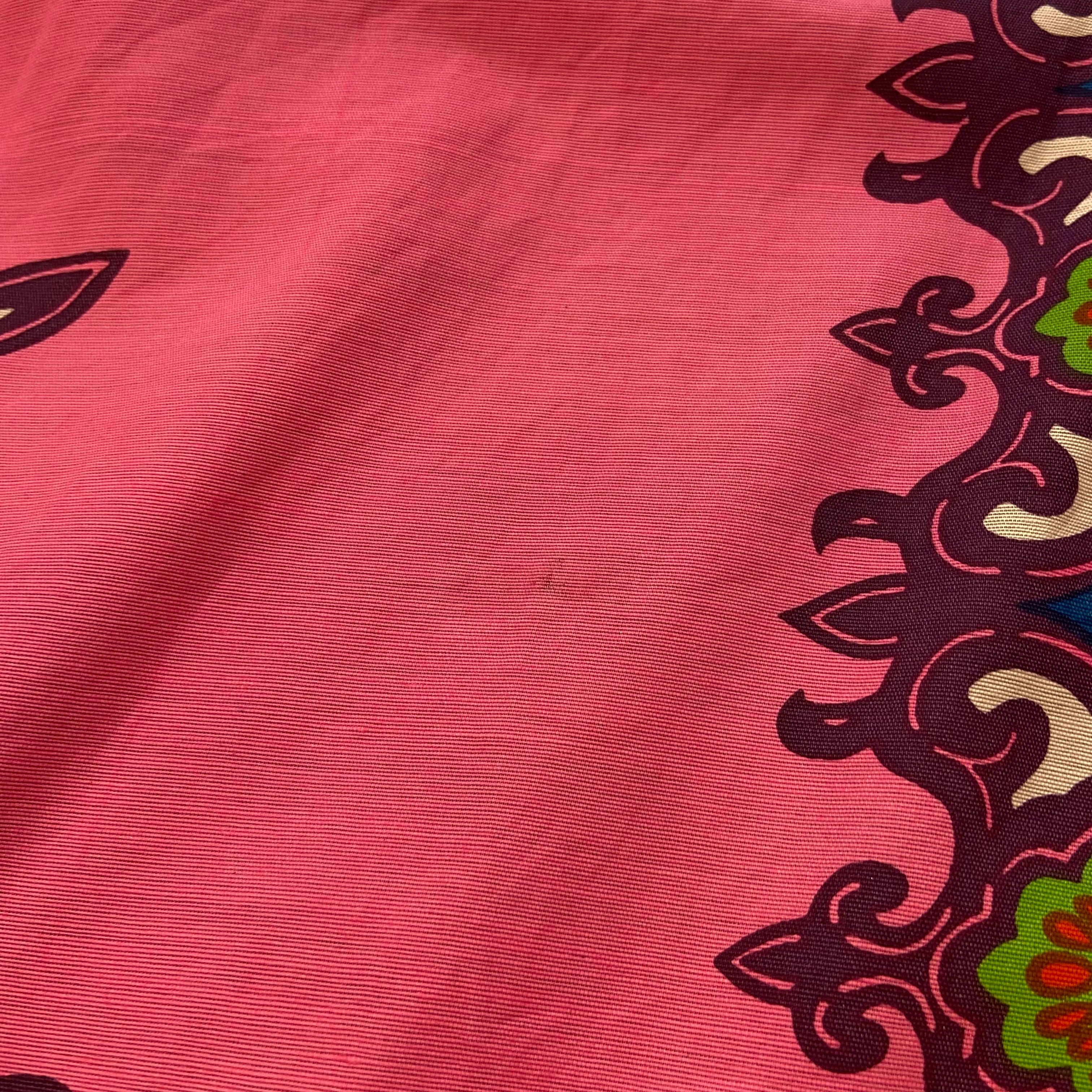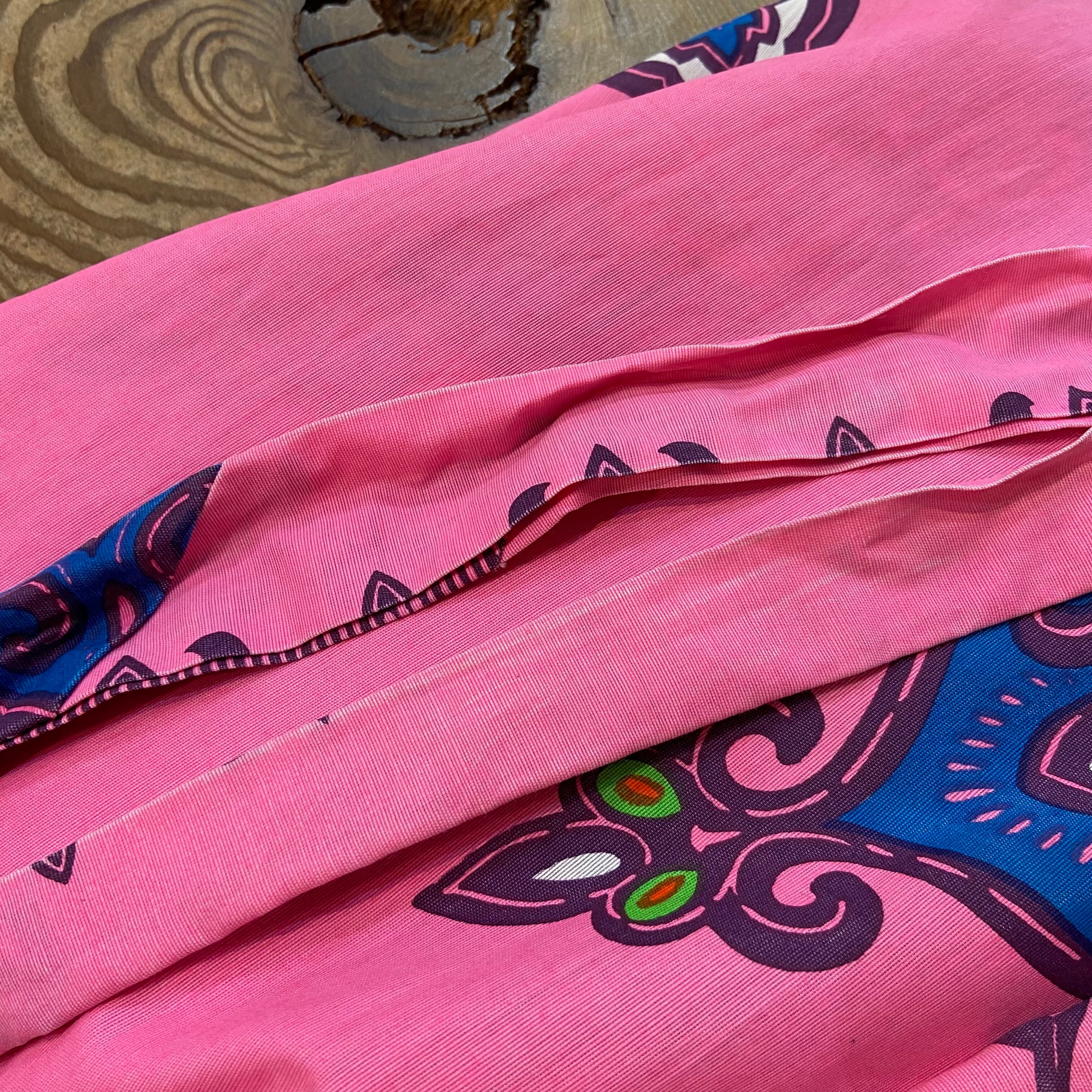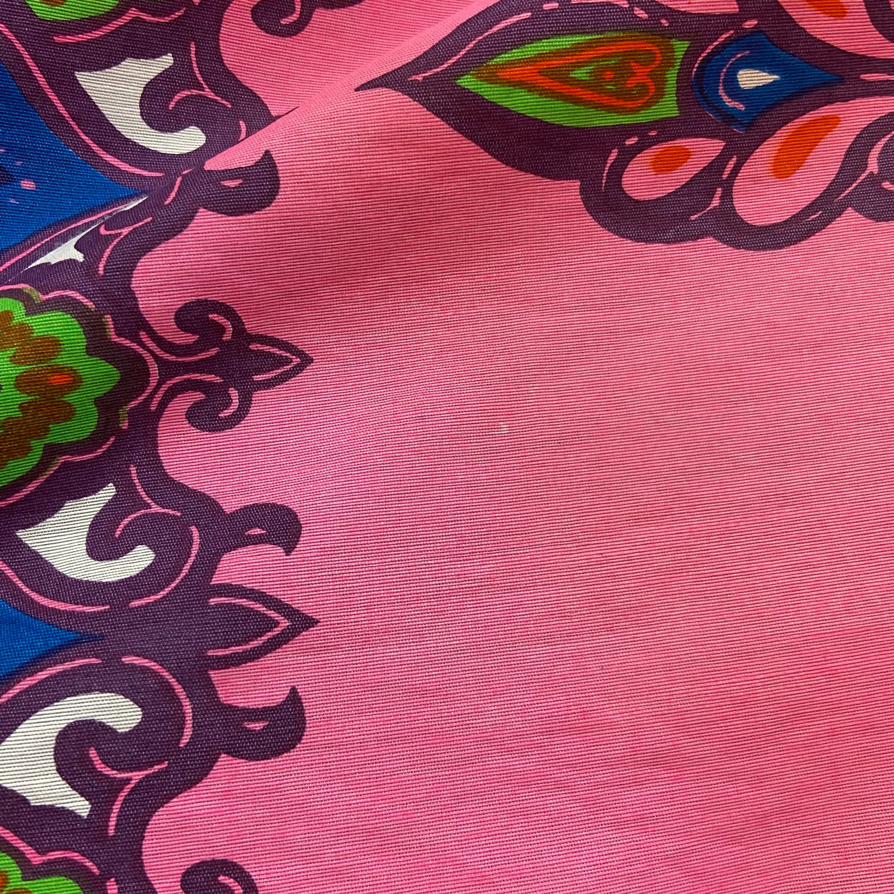 色鮮やかなピンクカラーにブルーとグリーンの、エスニックムードなプリントが可愛い70年代のラップスカートです。