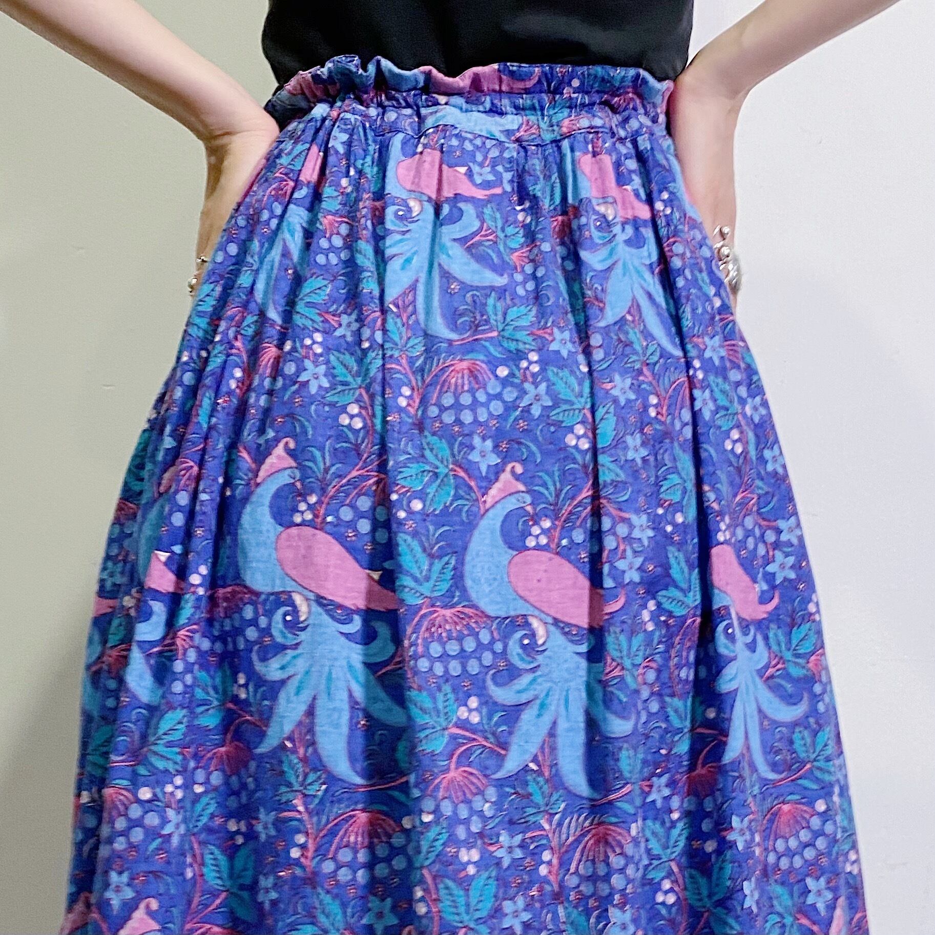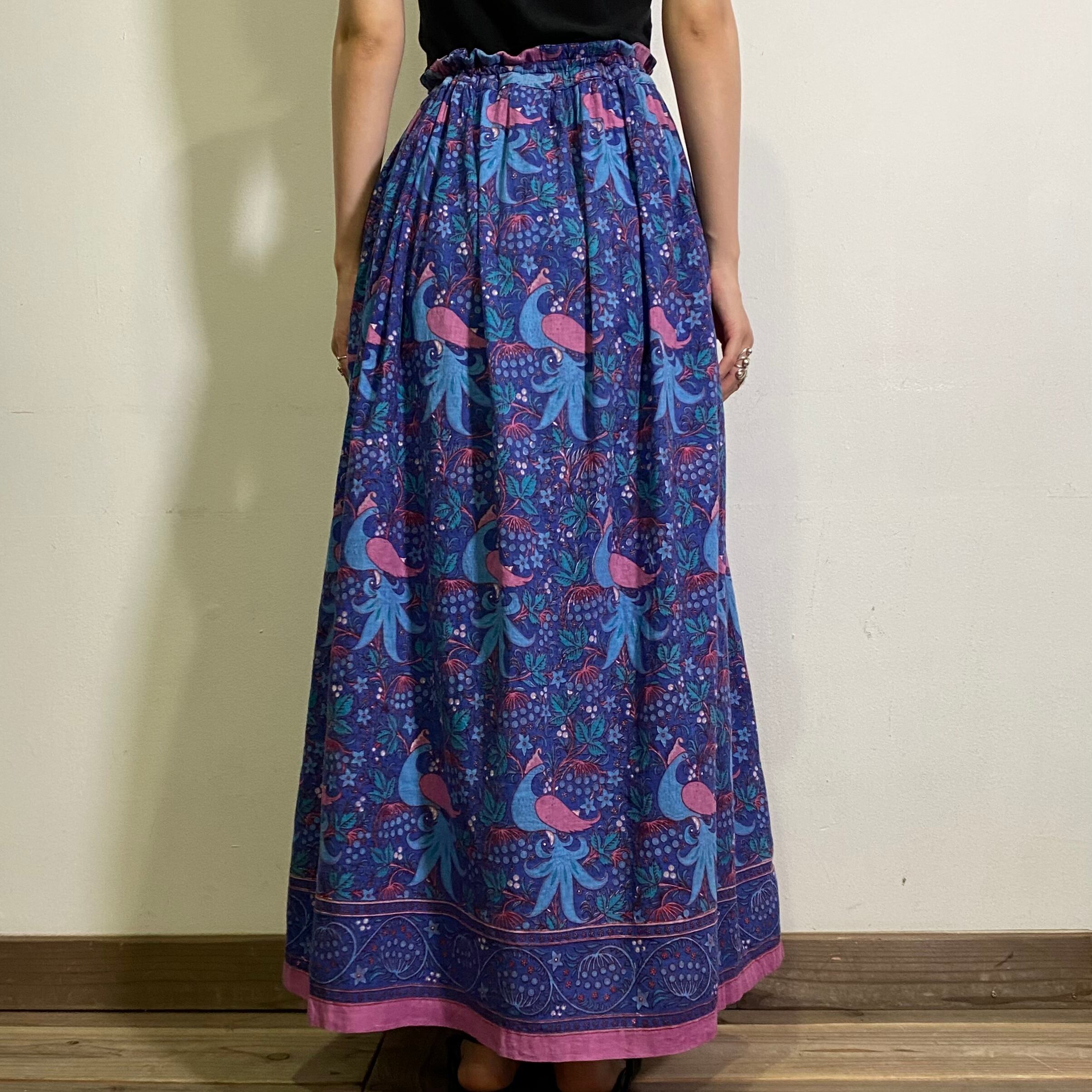 70s blue bird motif Indian cotton long skirt