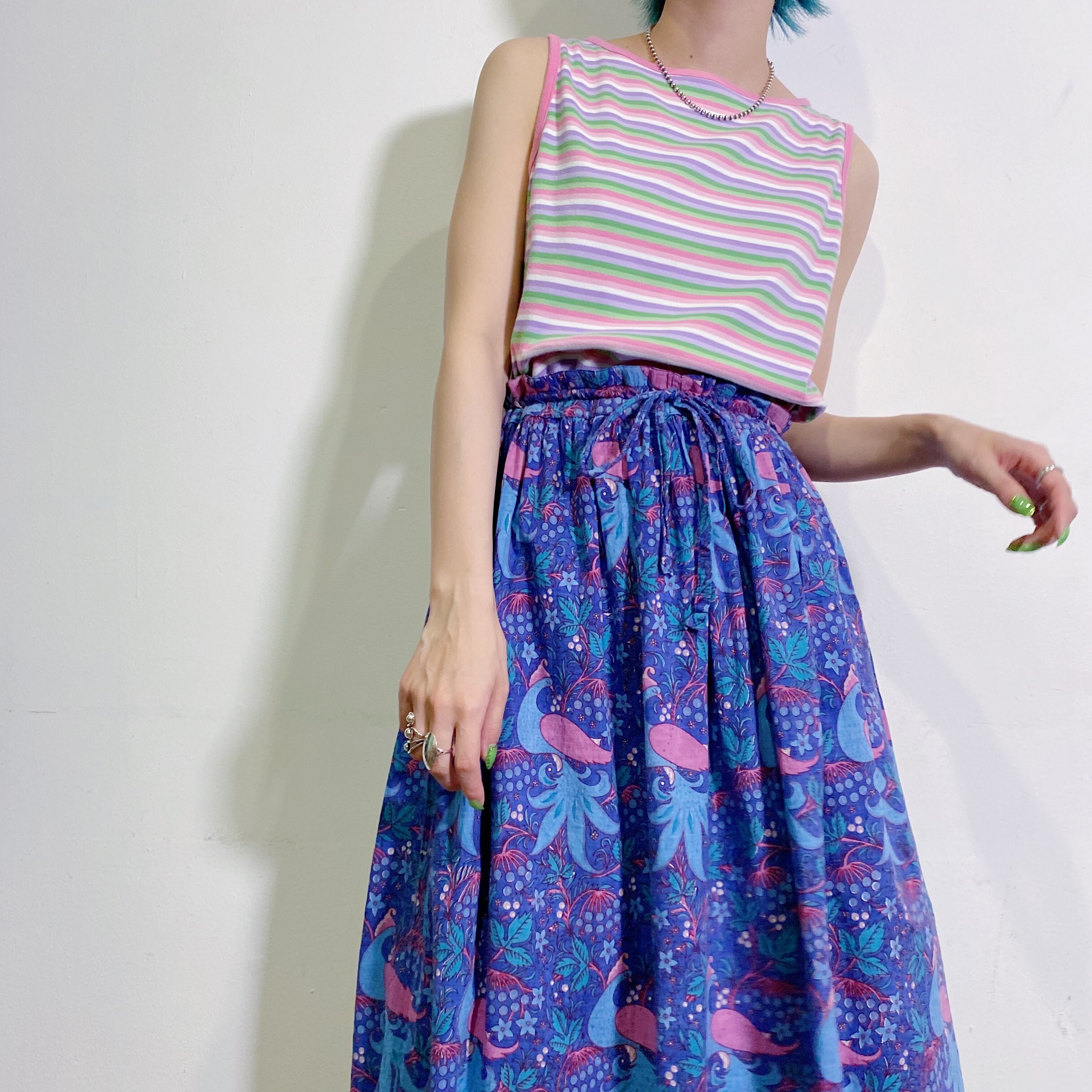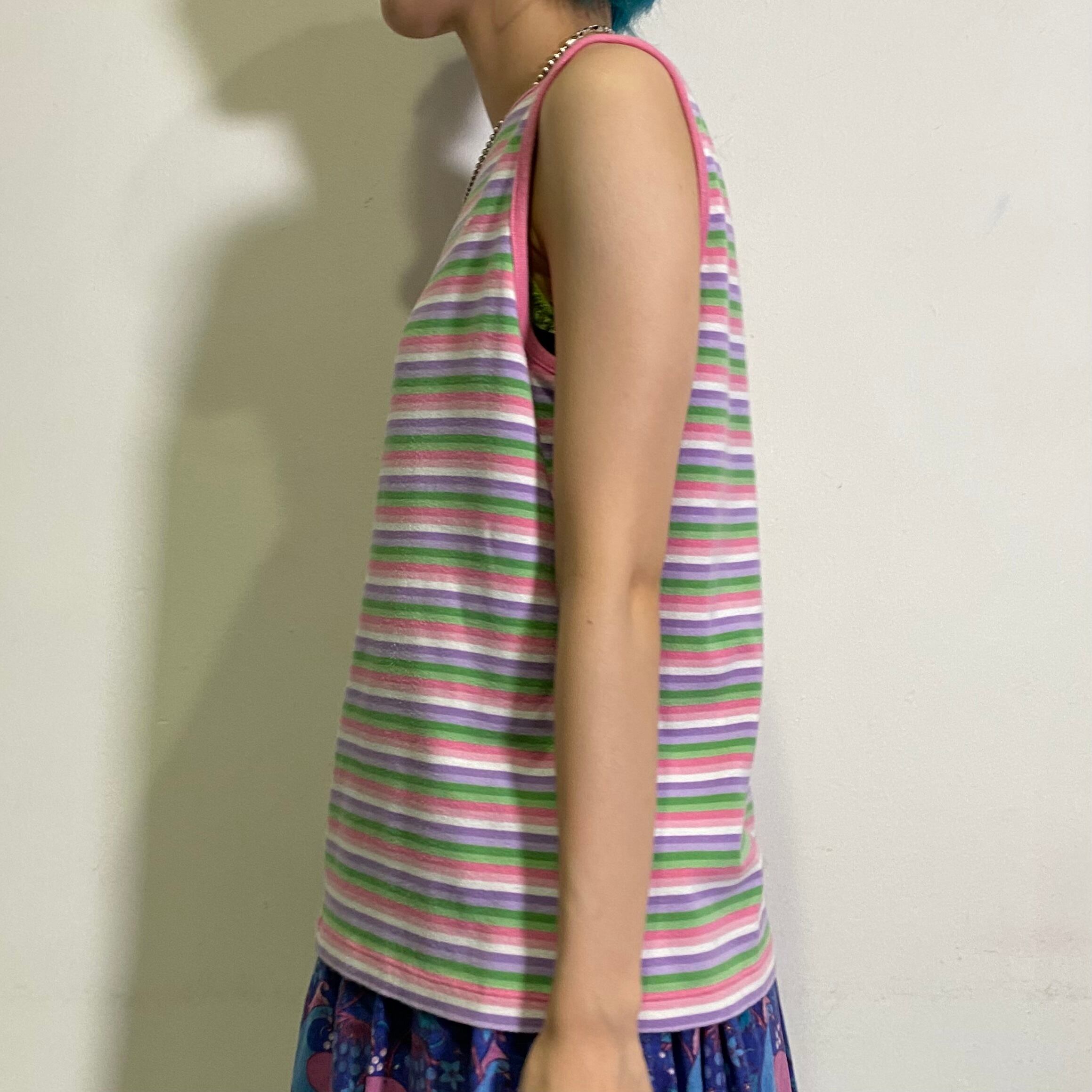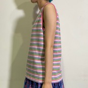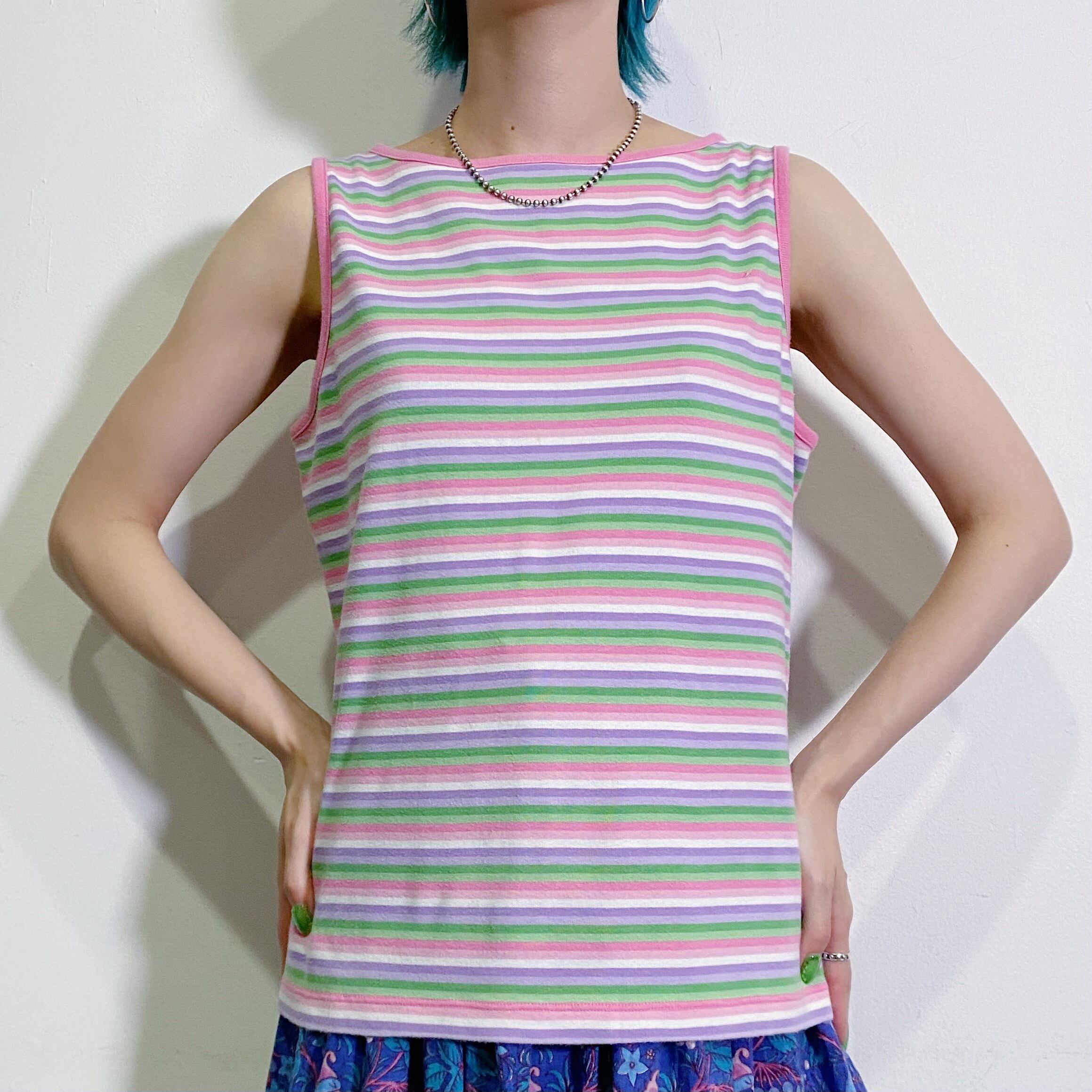 ピンクやグリーンなどのストライプが可愛い、ノースリーブトップスです。