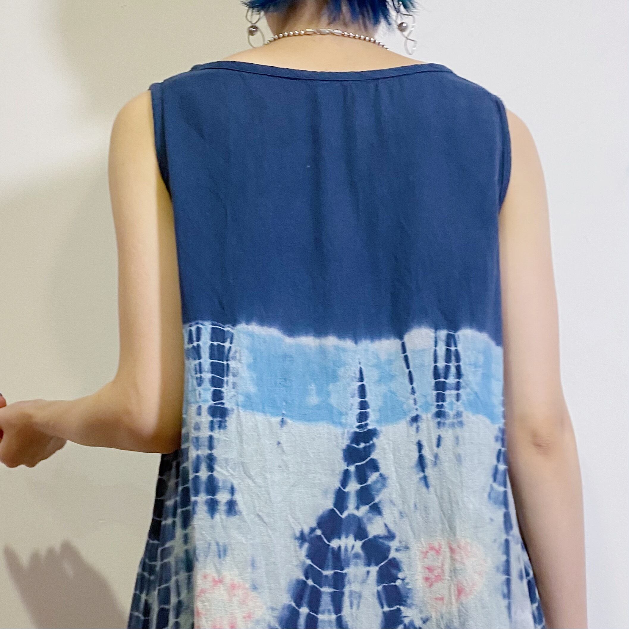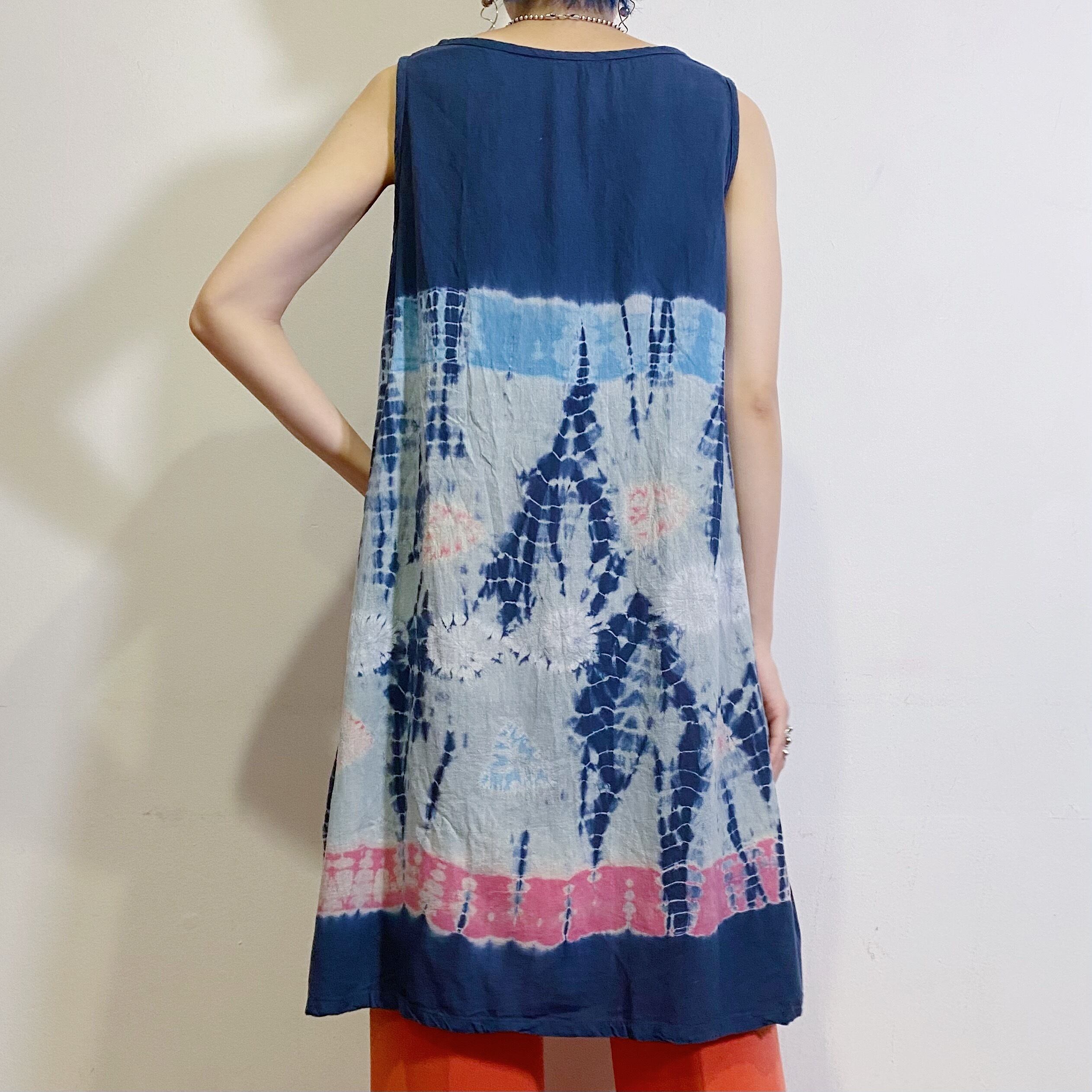 絞り染めのようなタイダイ柄が可愛い、ノースリーブワンピースです。