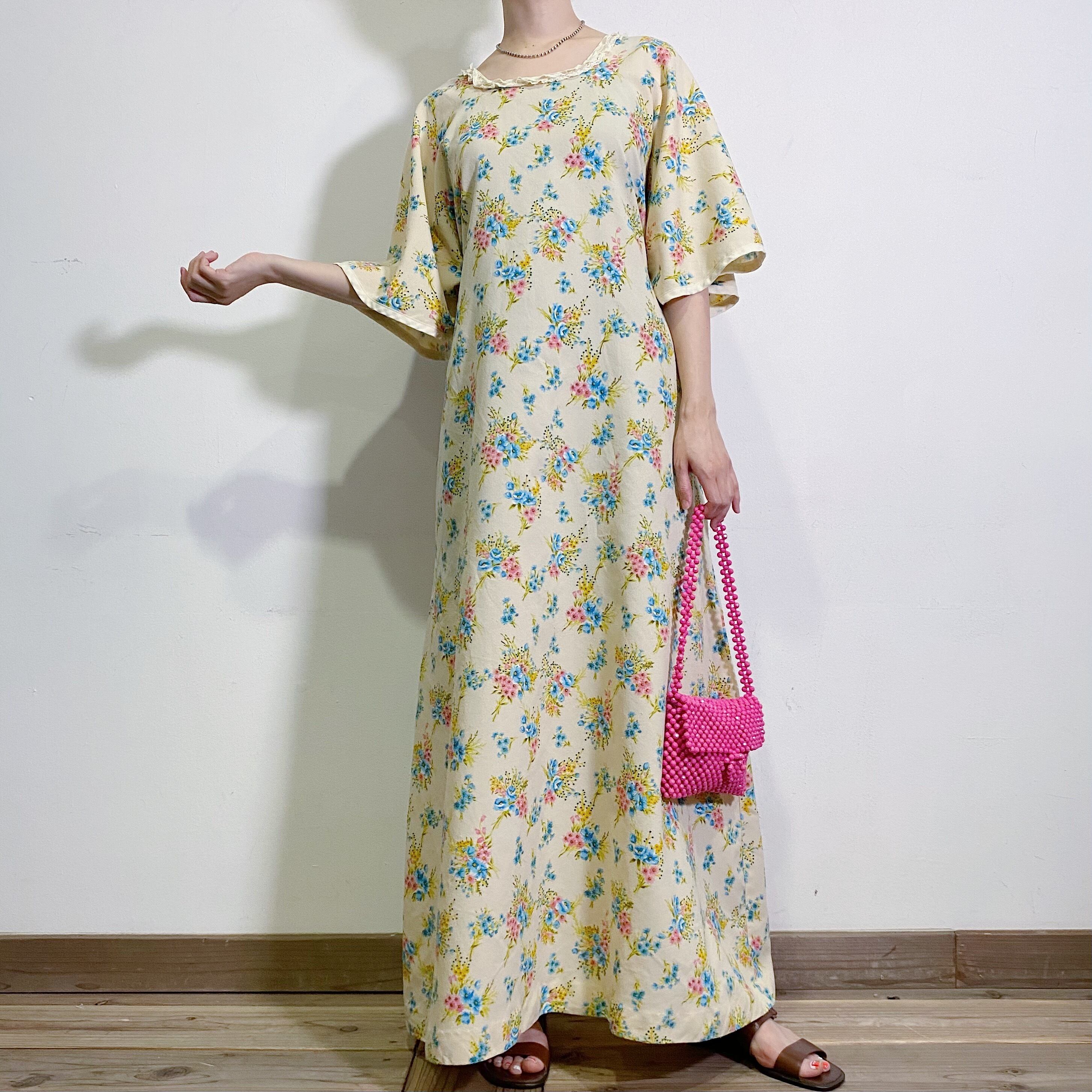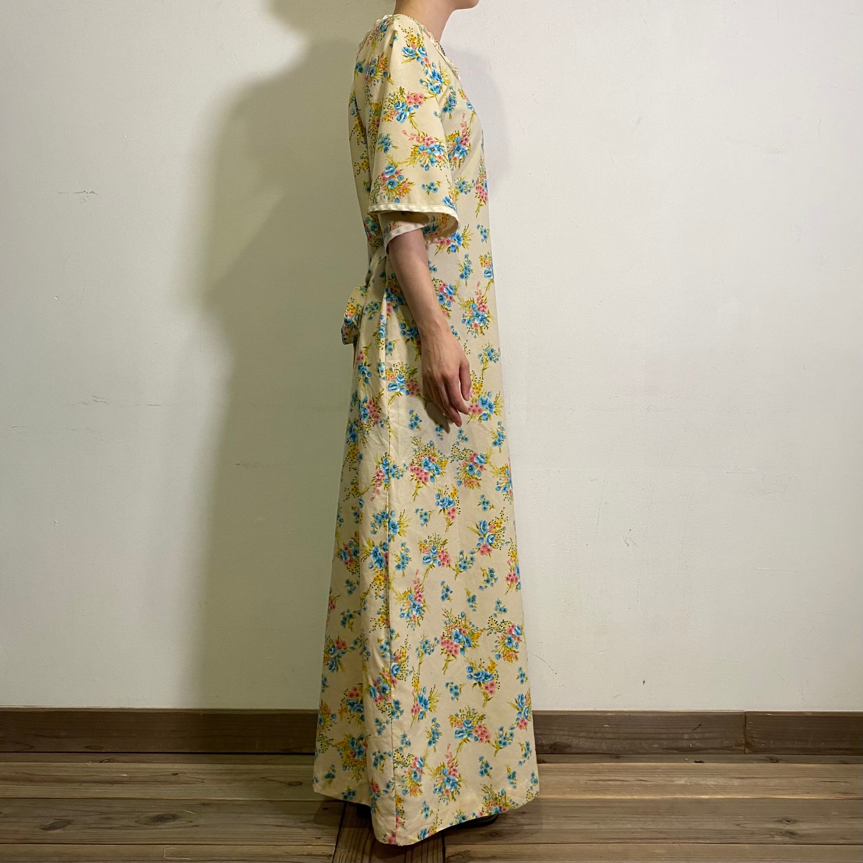 ピンクとサックスブルーのブーケのような花柄が可愛い、70年代のロングワンピースです。