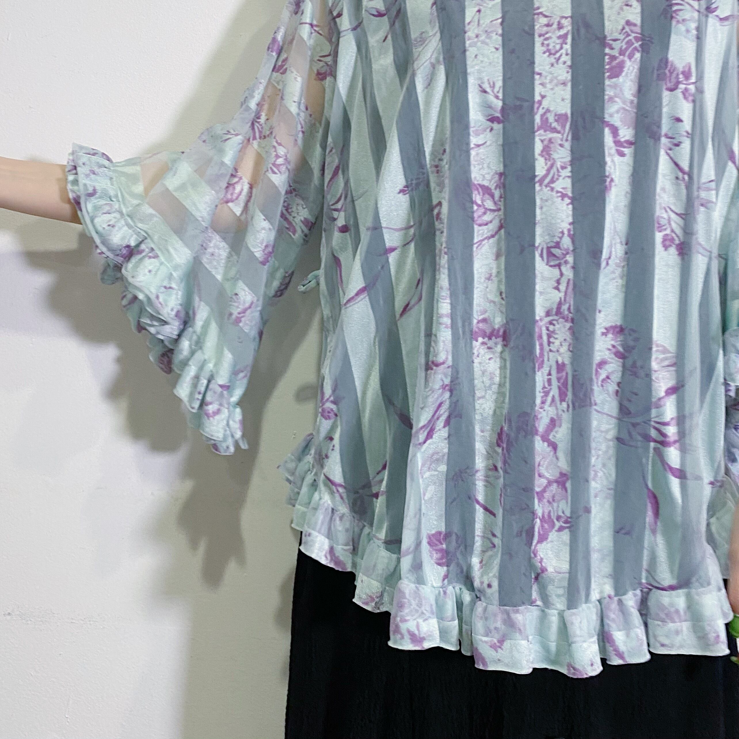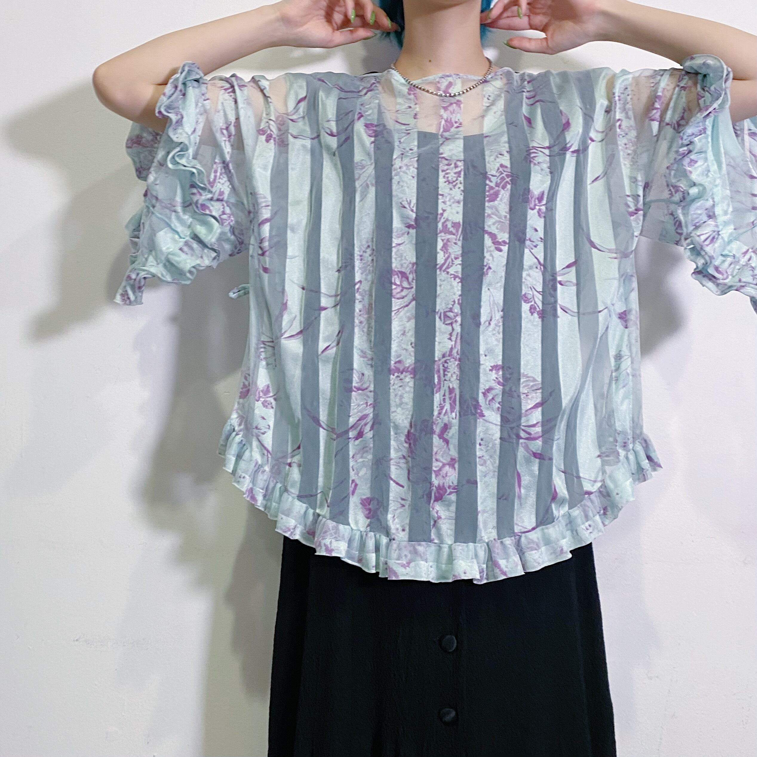 シアーな素材感にフレアスリーブとフリルのデザインがとっても素敵な、70年代のトップスです。