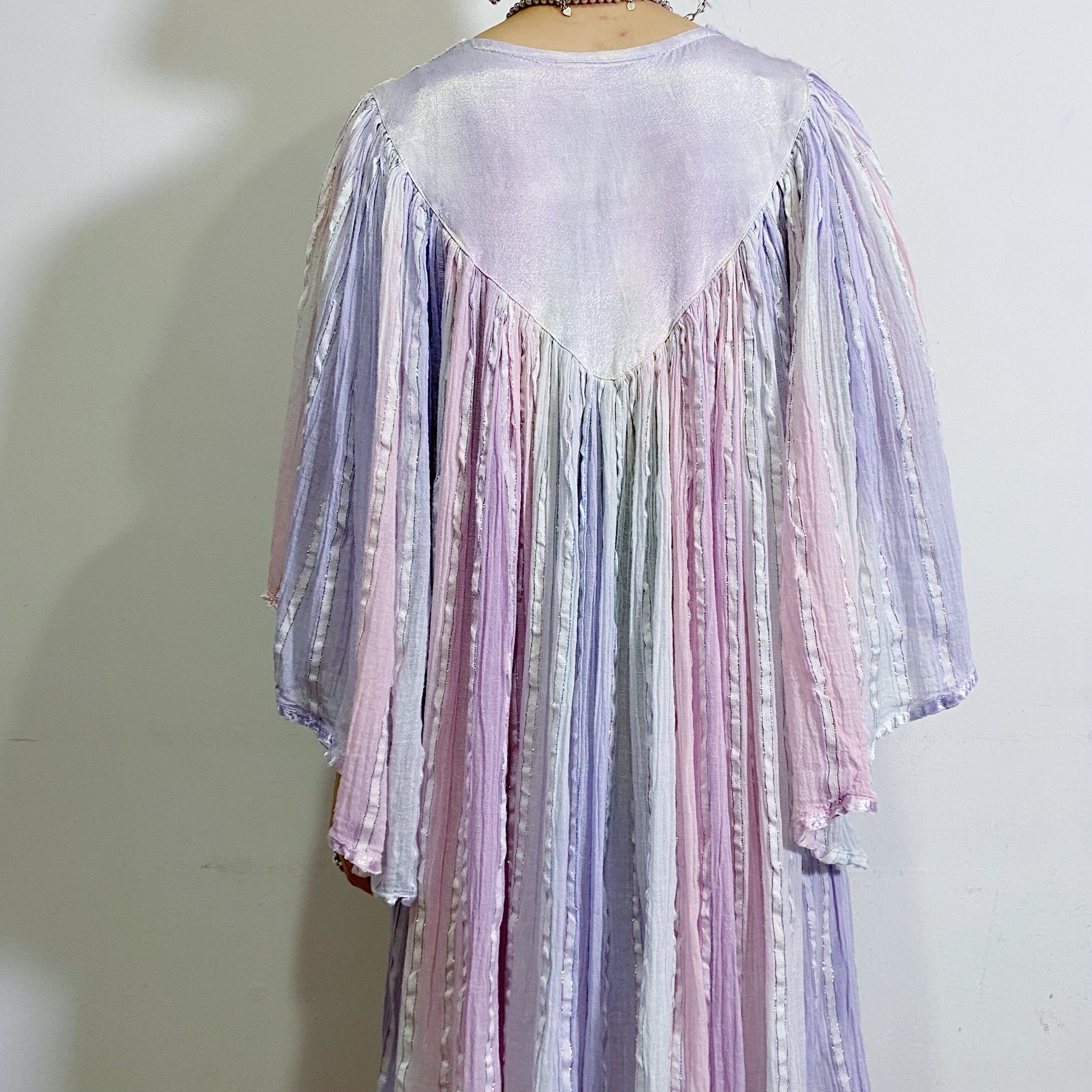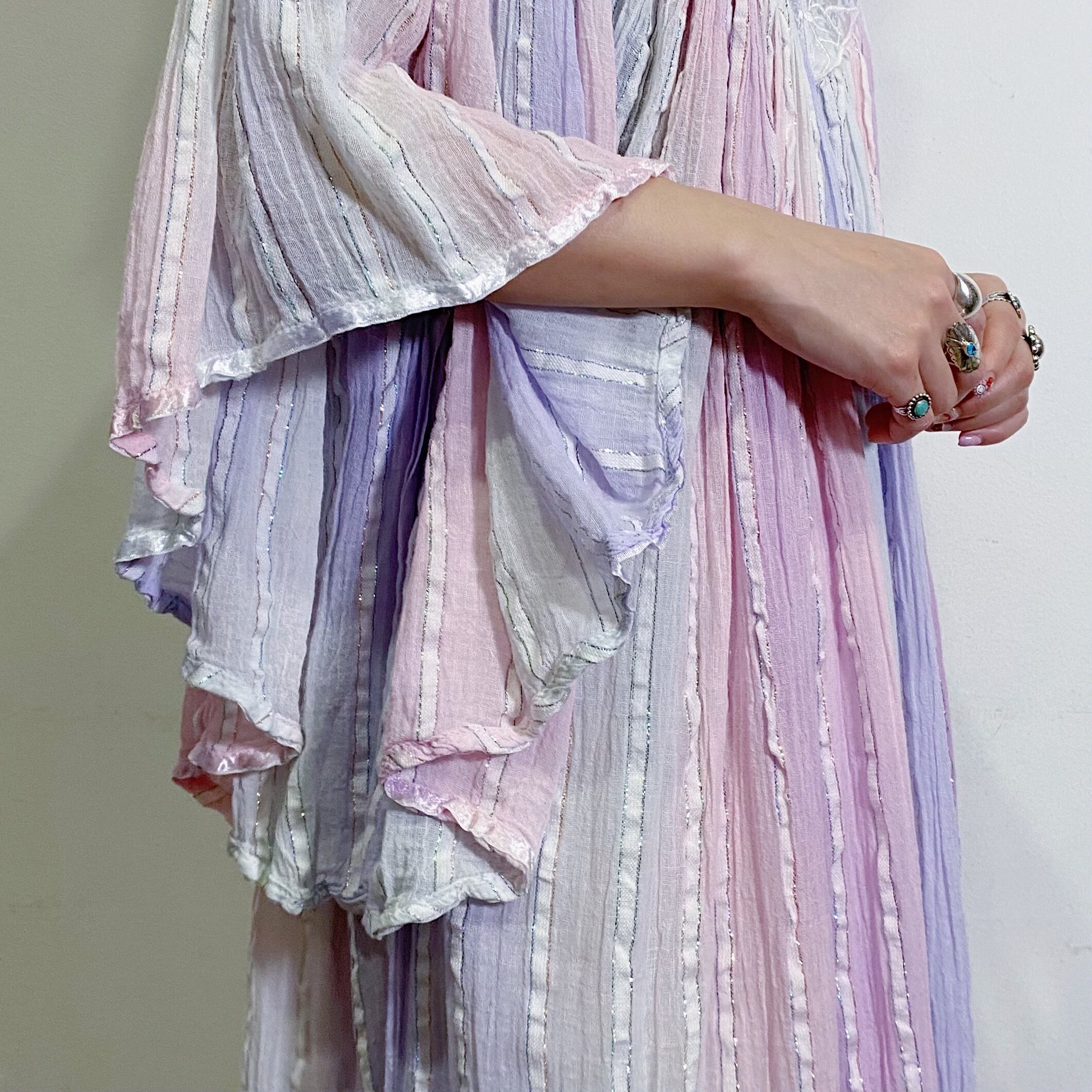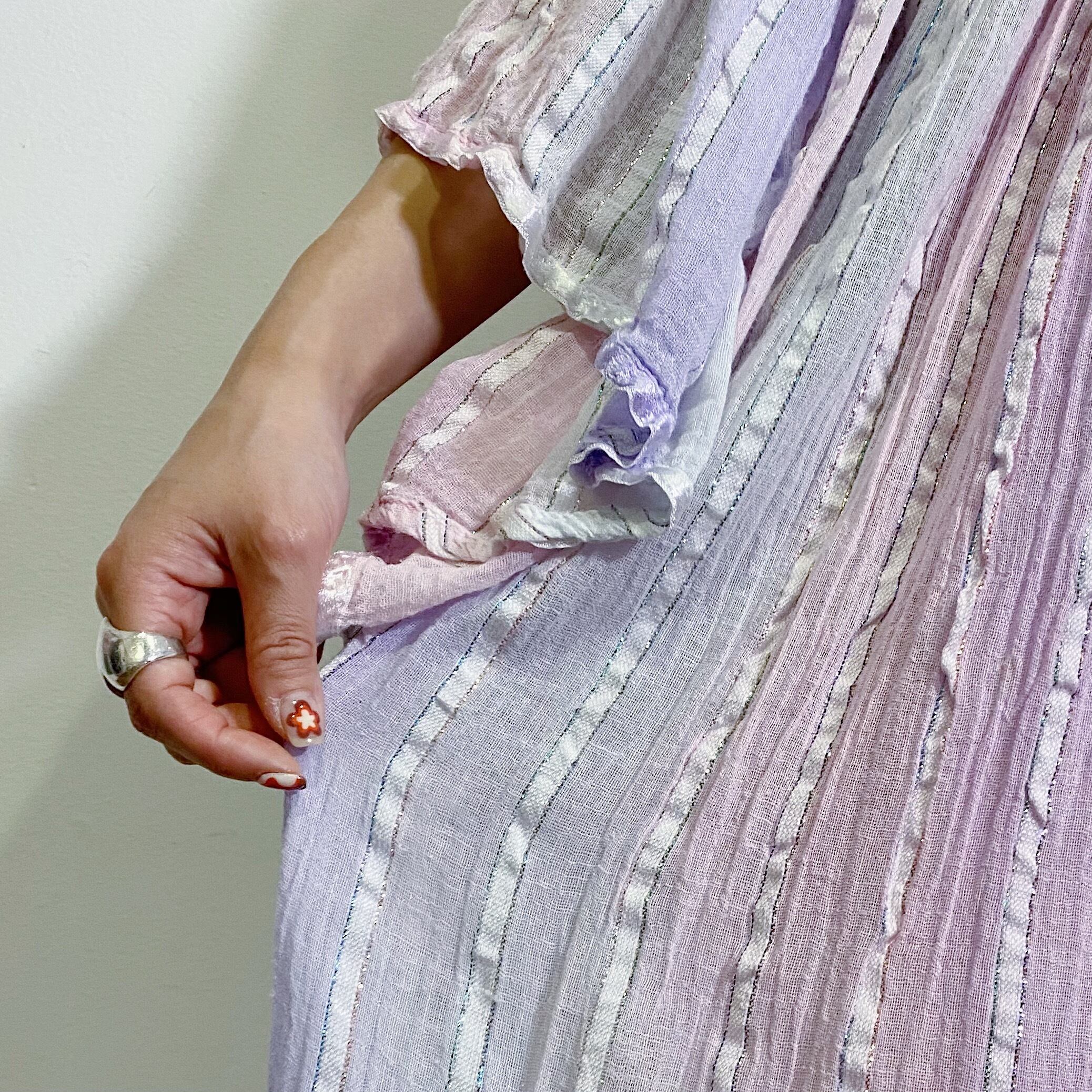 ピンクパープルのパステルカラーにラメ糸が可愛い、ギリシャワンピースです。