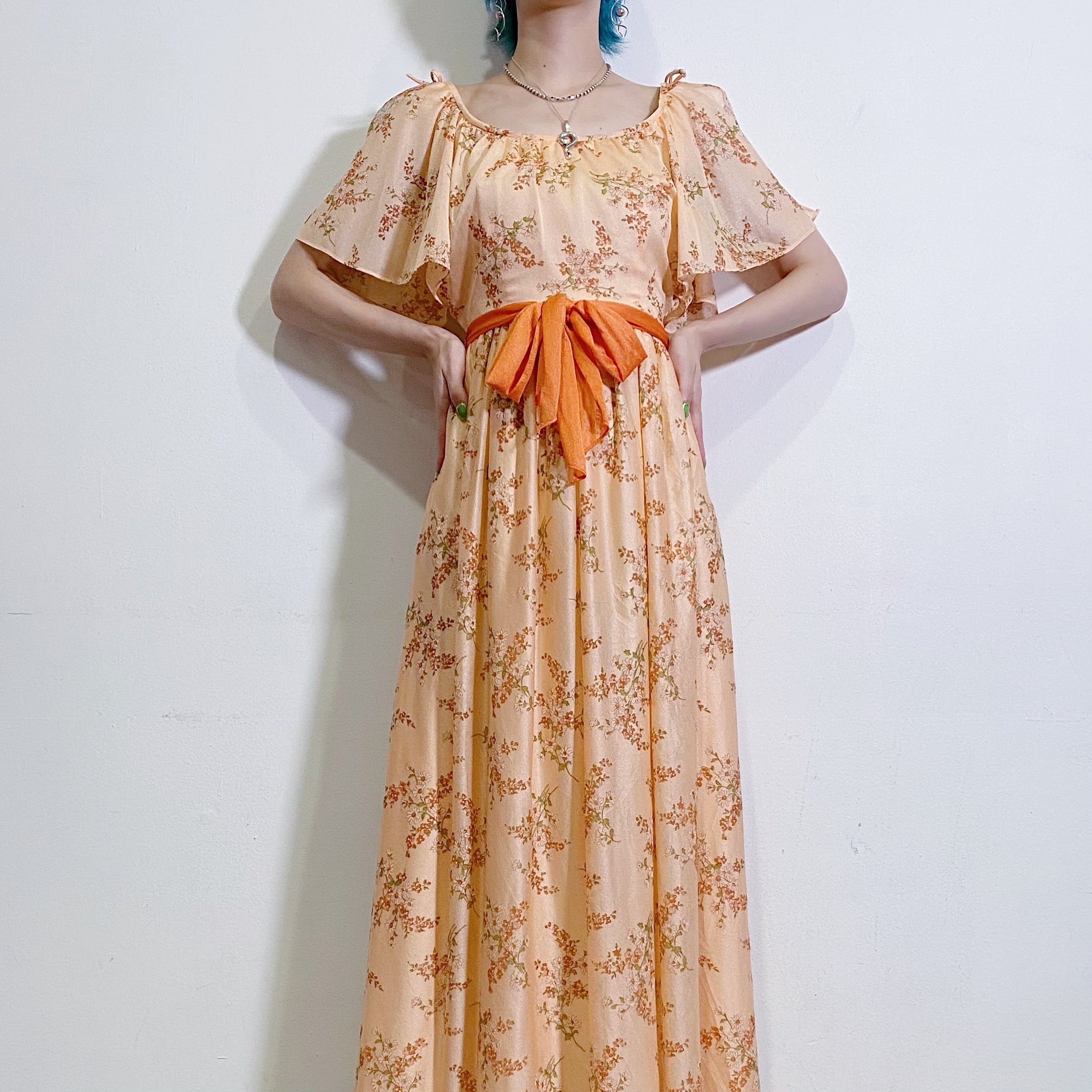 オレンジベースの花柄が可愛い、70年代のワンピースです。