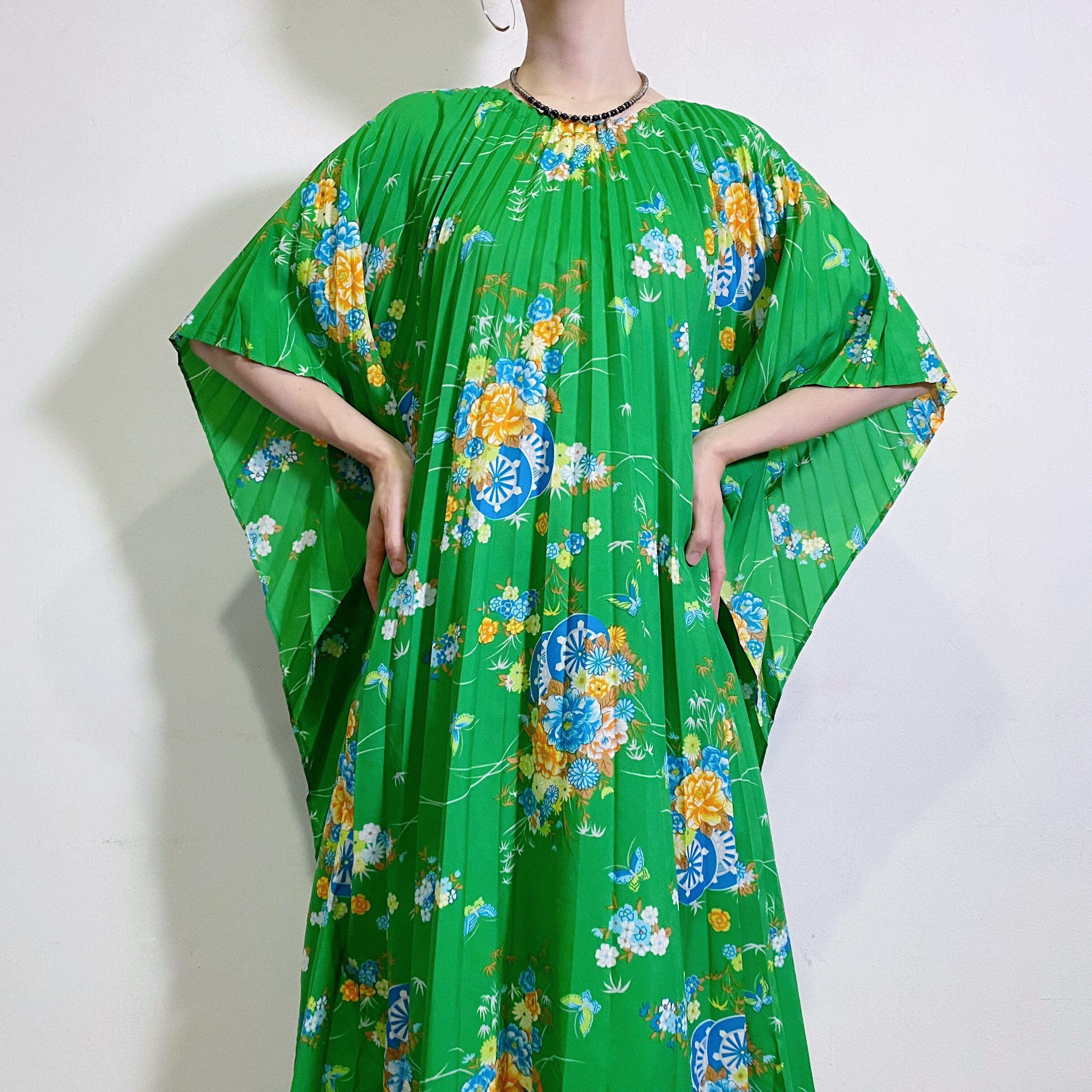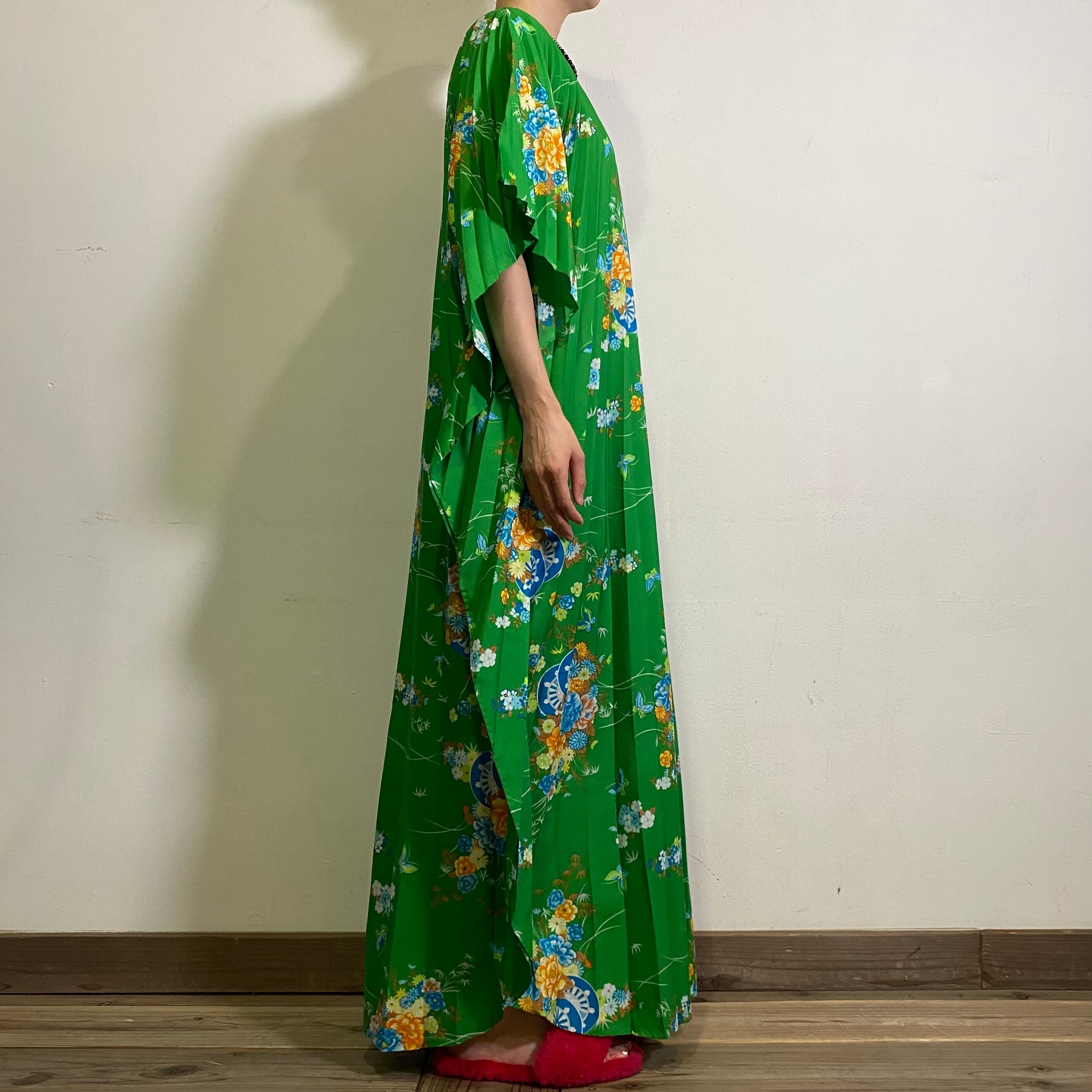 鮮やかなグリーンベースに蝶々とお花が可愛い、70年代のワンピースです。