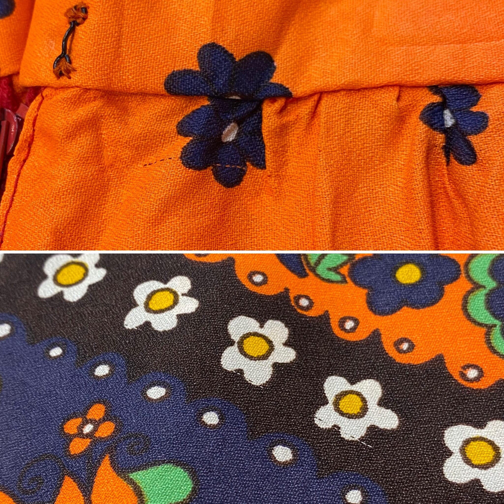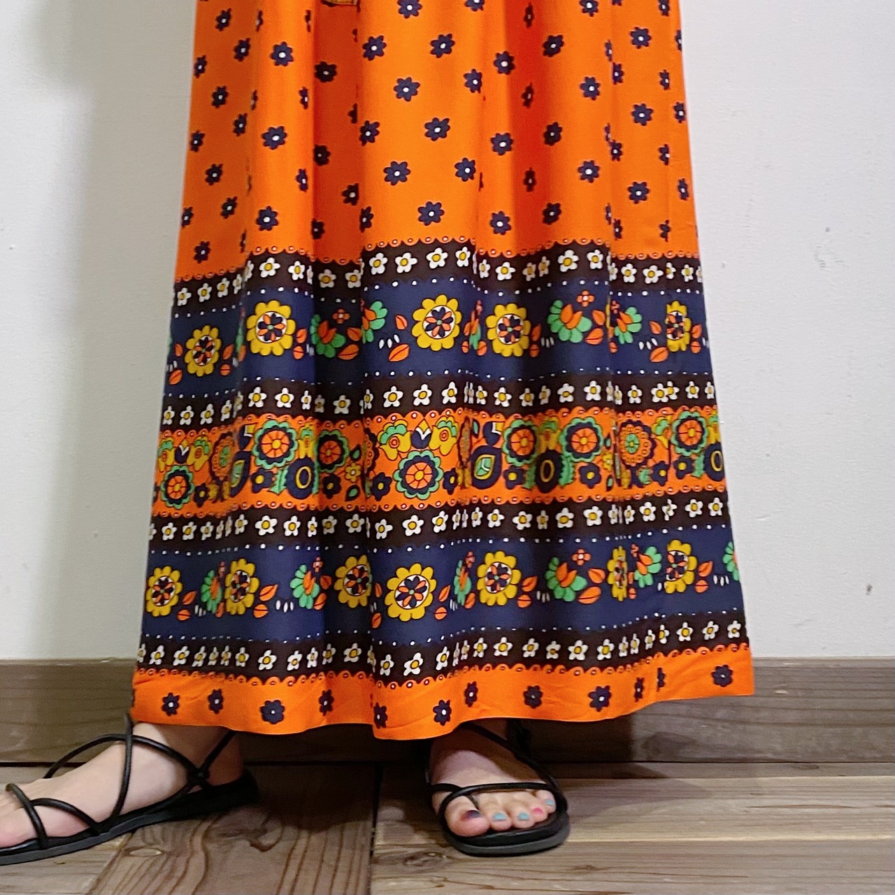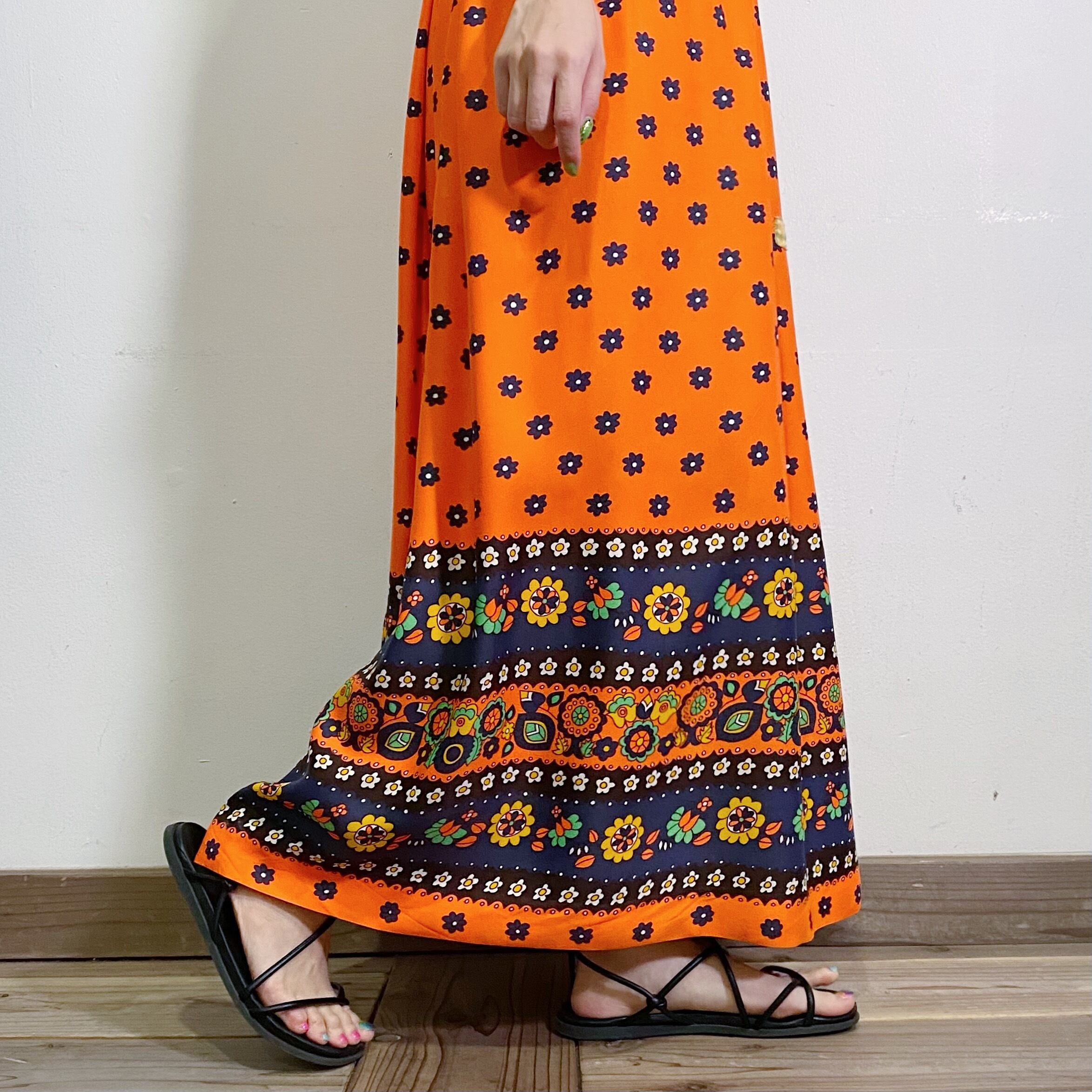 オレンジベースにネイビーの花柄が可愛い、70年代のロングスカートです。