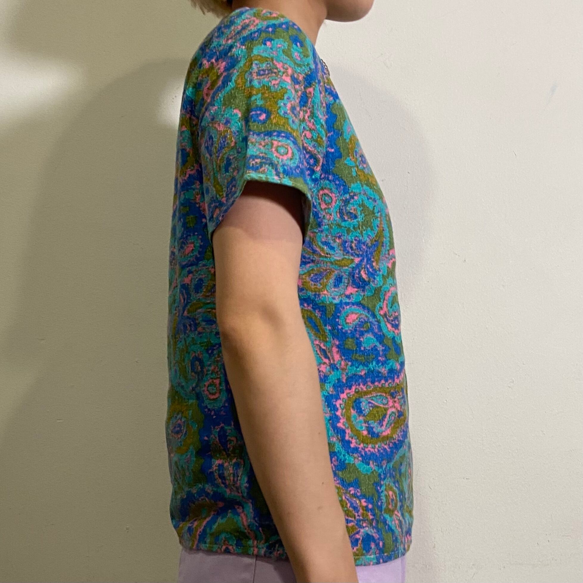 ピンク・グリーン・ブルーのペイズリー柄の色合いがとにかく可愛い、60年代のトップスです。