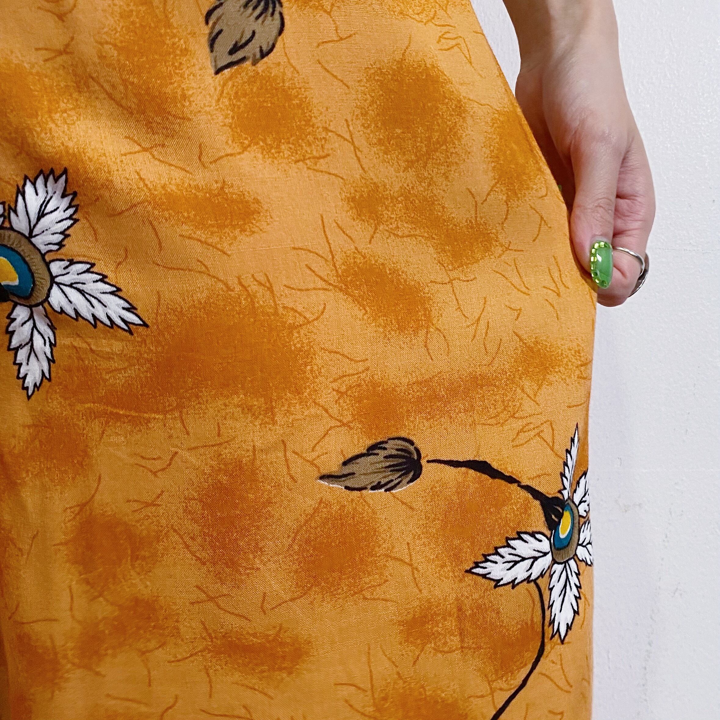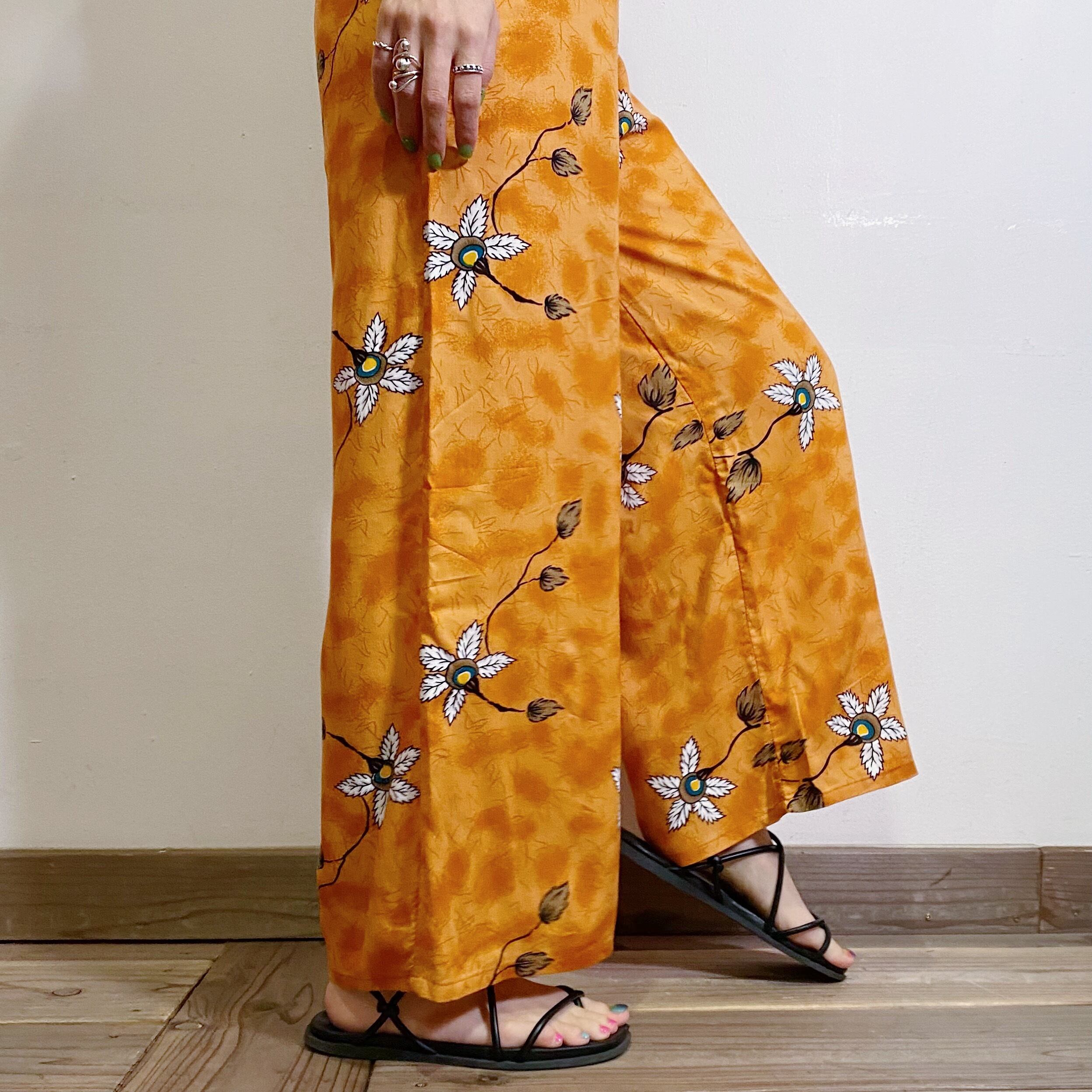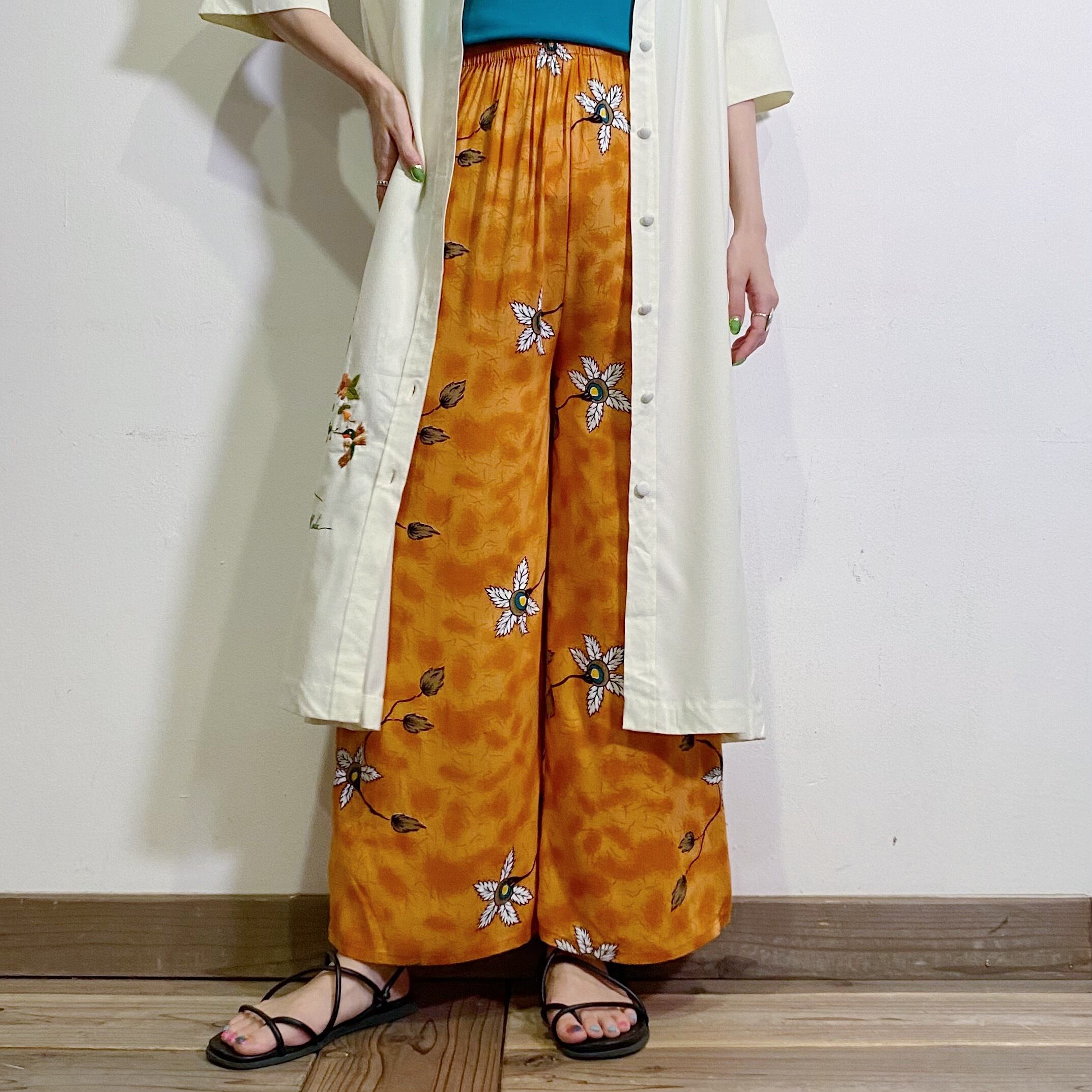 オレンジベースの花柄が可愛い、ワイドパンツです。