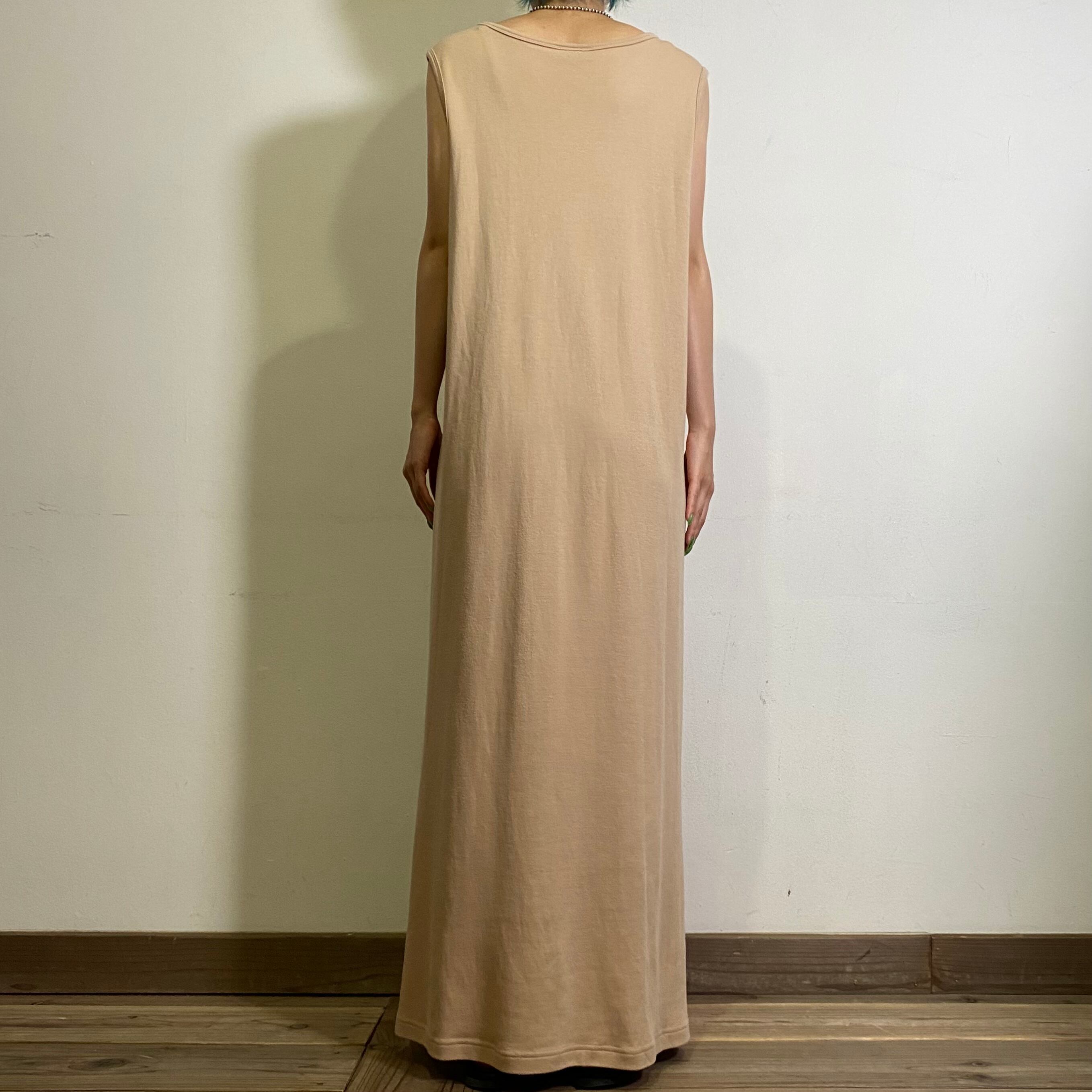 ベージュベースで大変着こなしやすい、ノースリーブワンピースです。