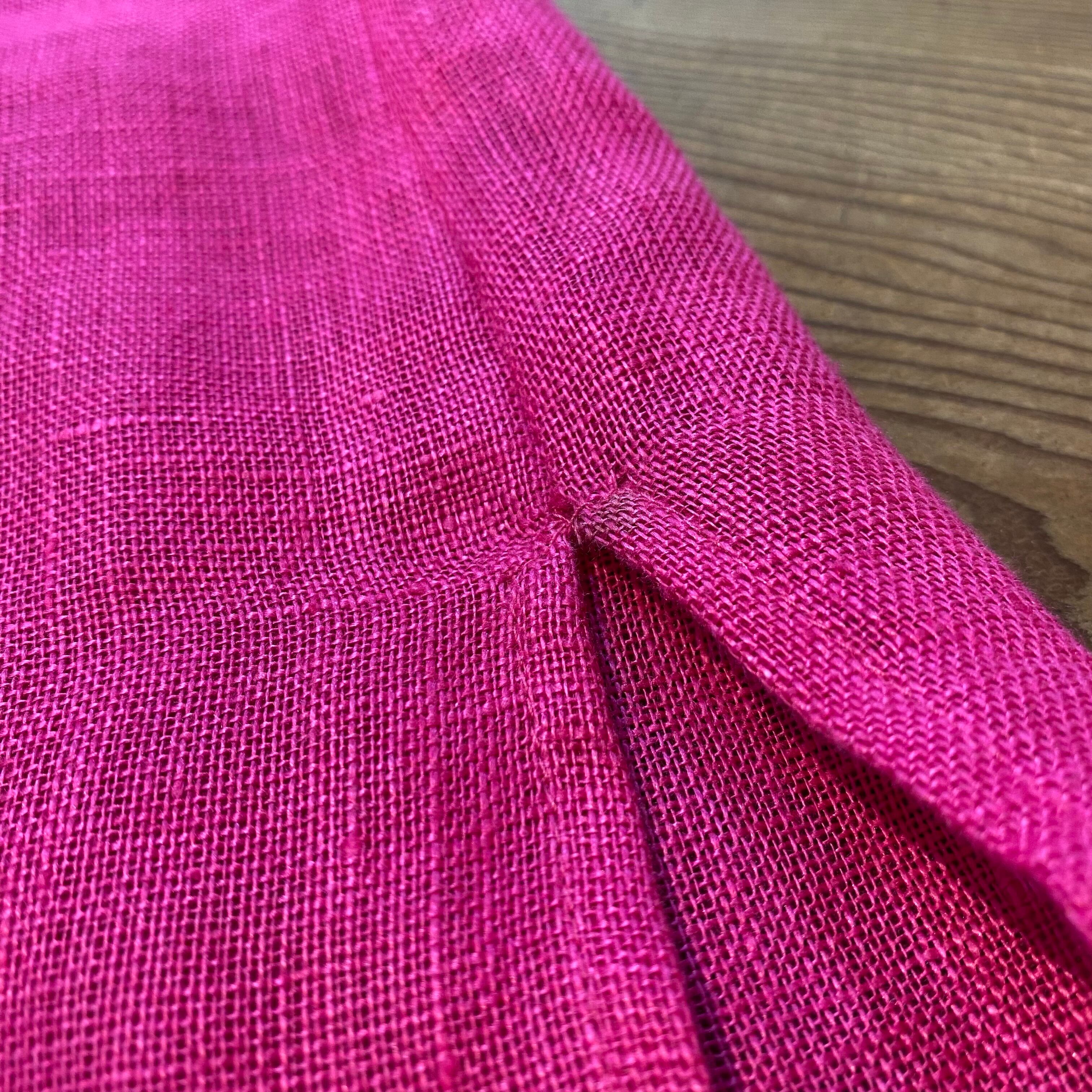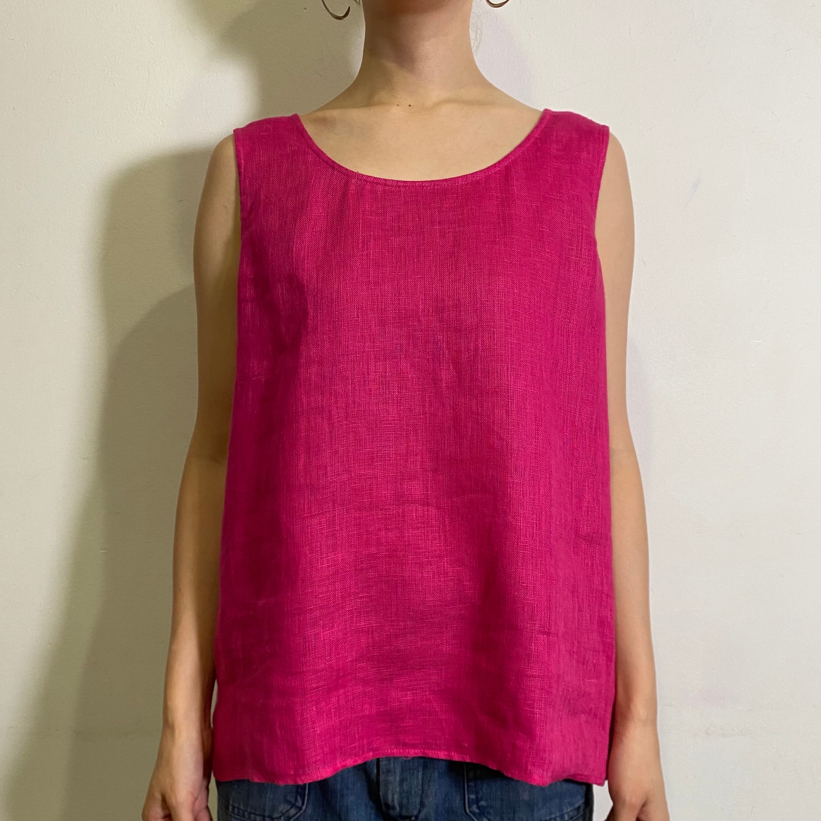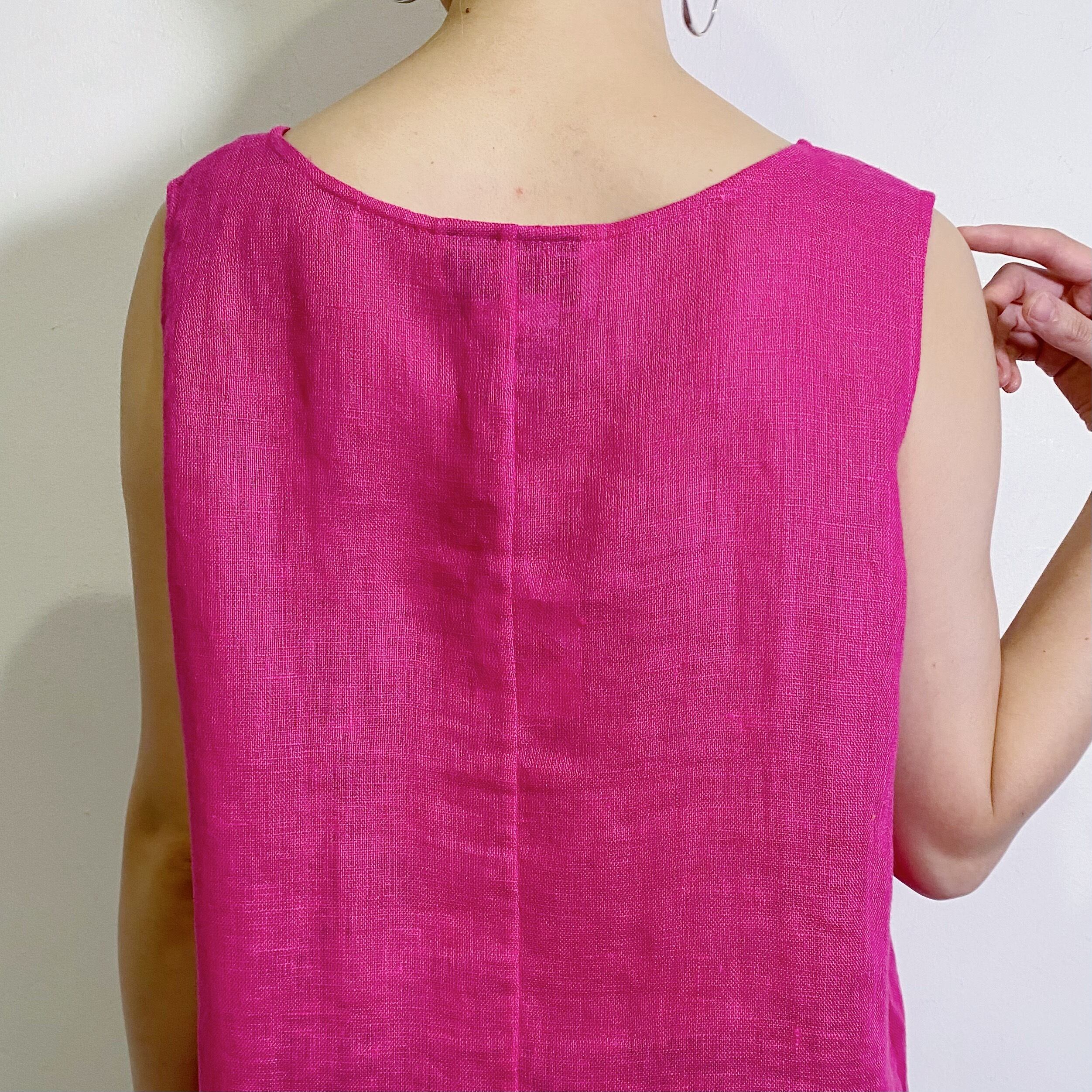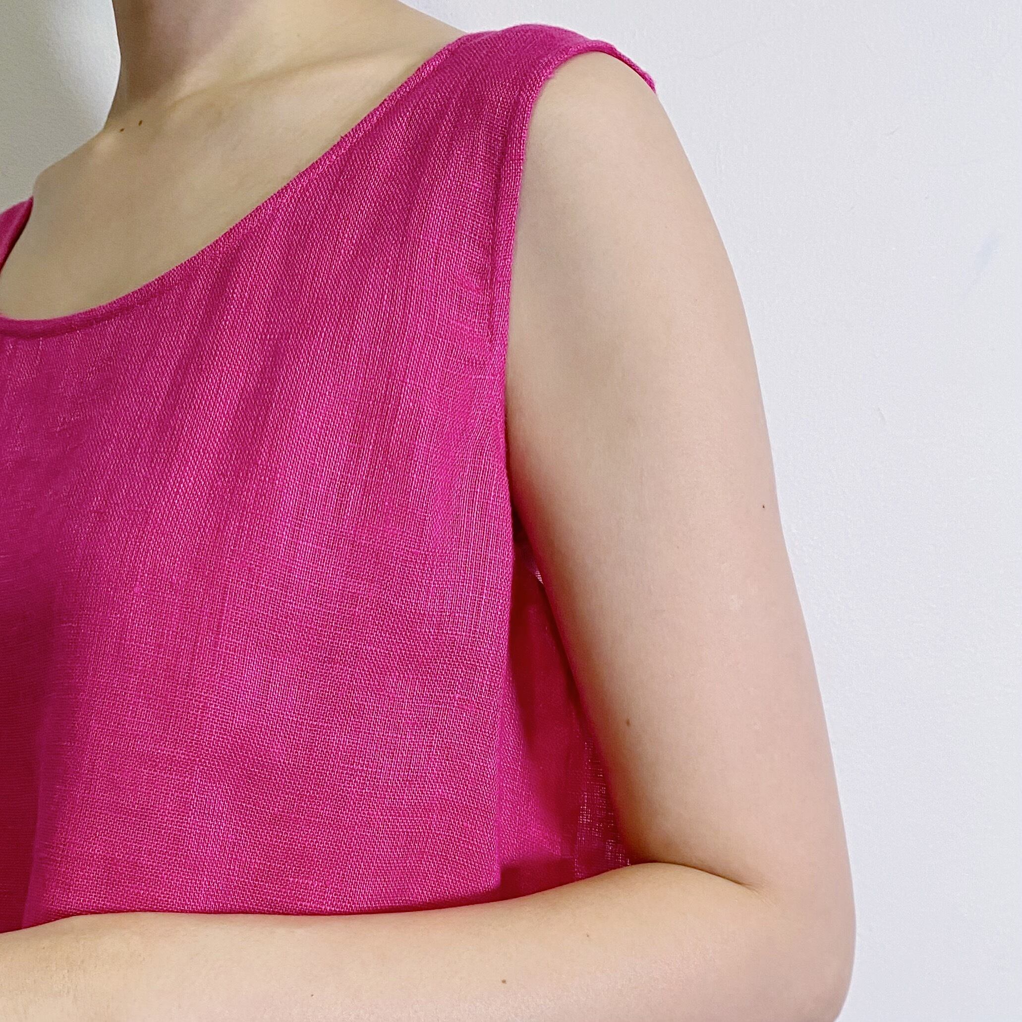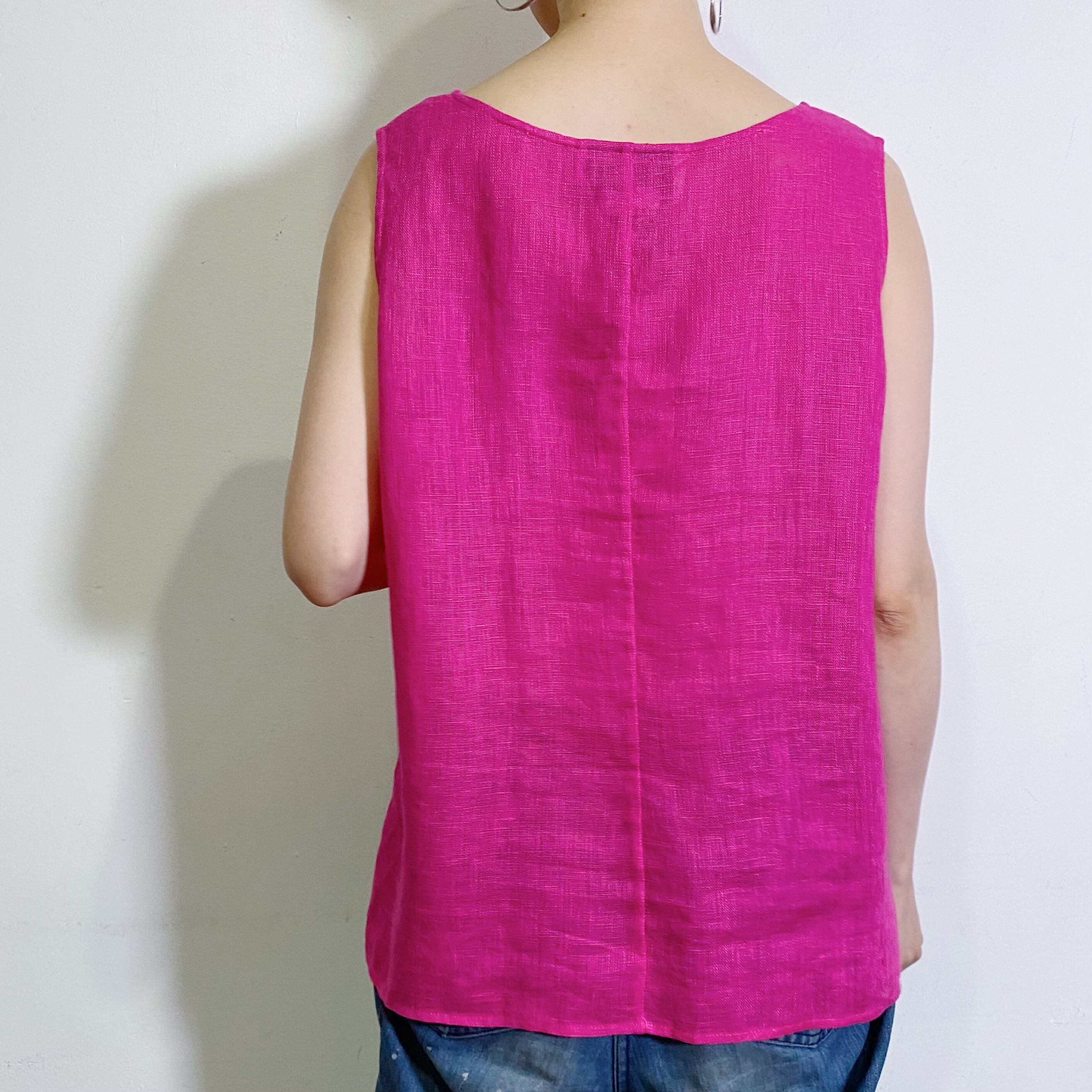 鮮やかなフューシャピンクがパッと目を惹く、ノースリーブトップスです。