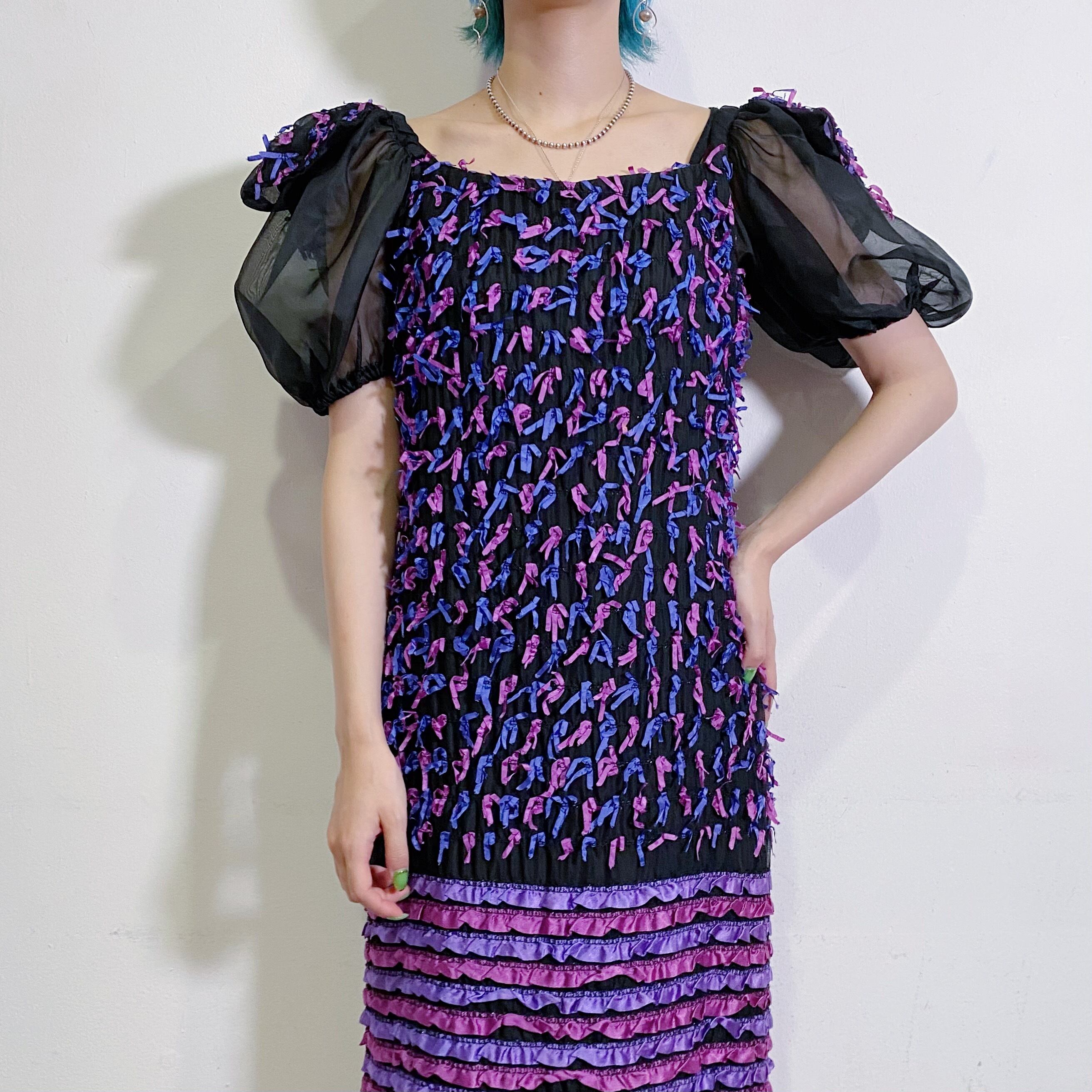 沢山の小さなリボンがびっしり!とつけられた、とっておきに可愛い80年代のドレスです。