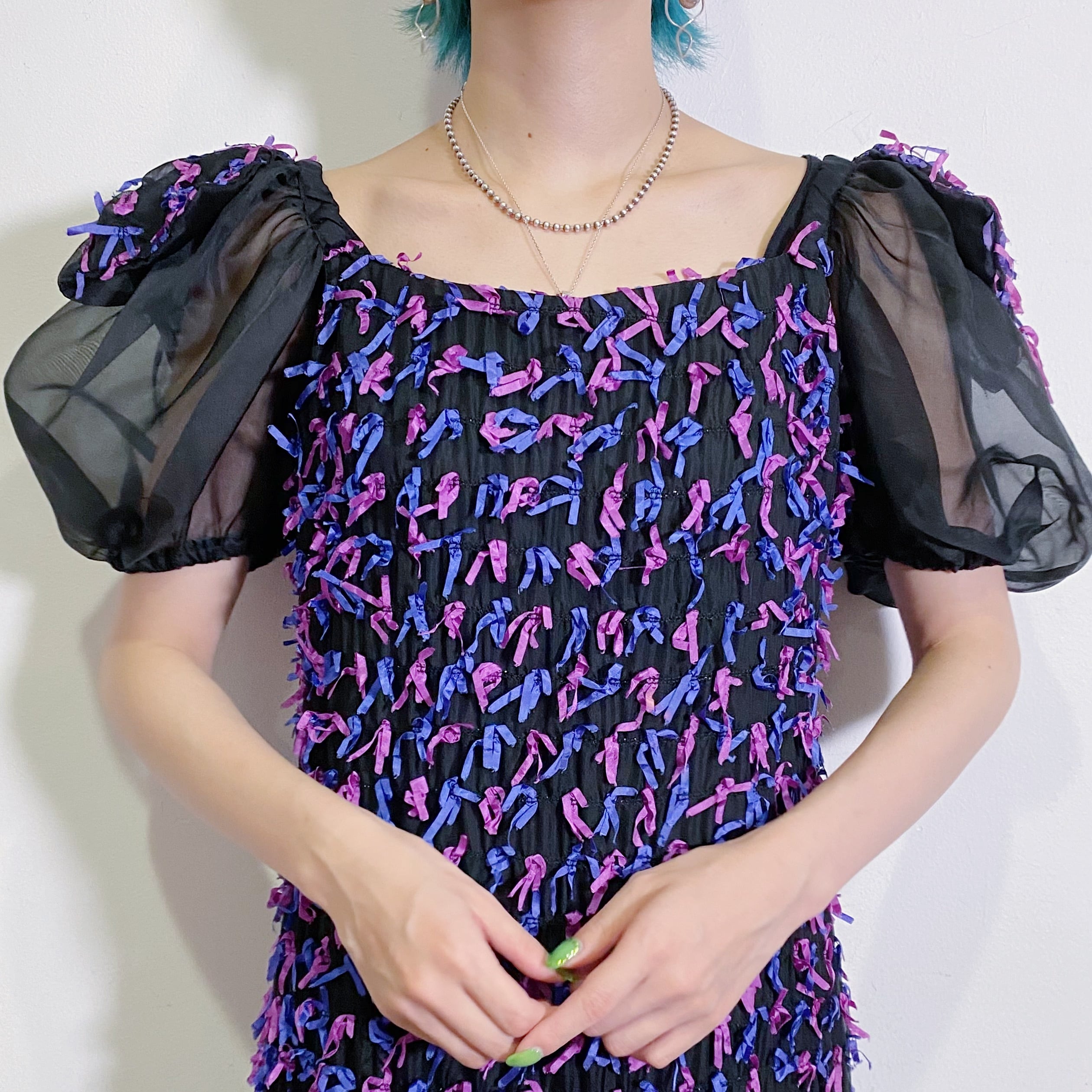 肩には大きなリボンがつけられていてそのリボンにも小さなリボンが縫い付けられていて...80年代の夢がたっぷり詰まったデザインにキュンとします。