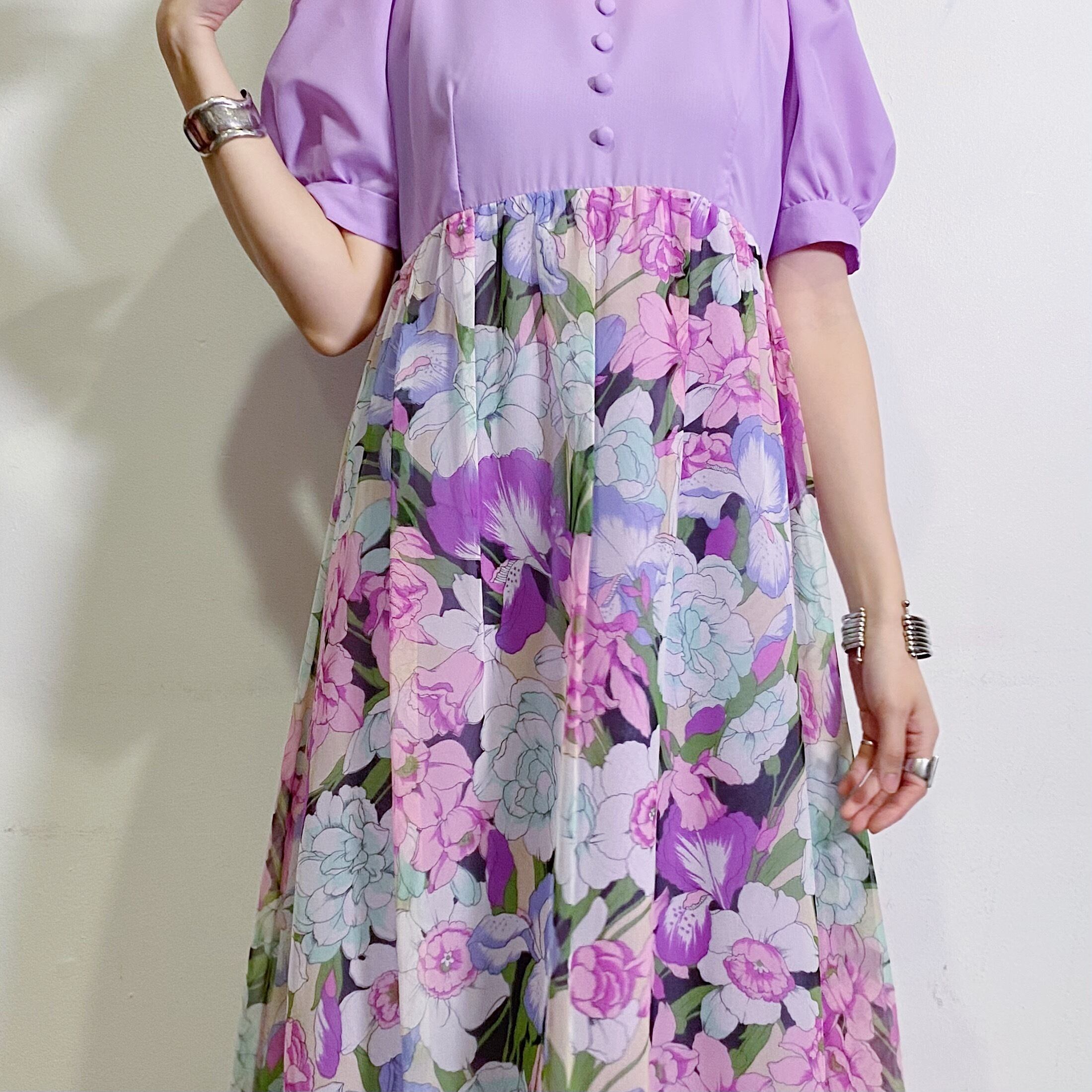 シアー素材に花柄がプリントされたマテリアルが可愛い、70年代のワンピースです。