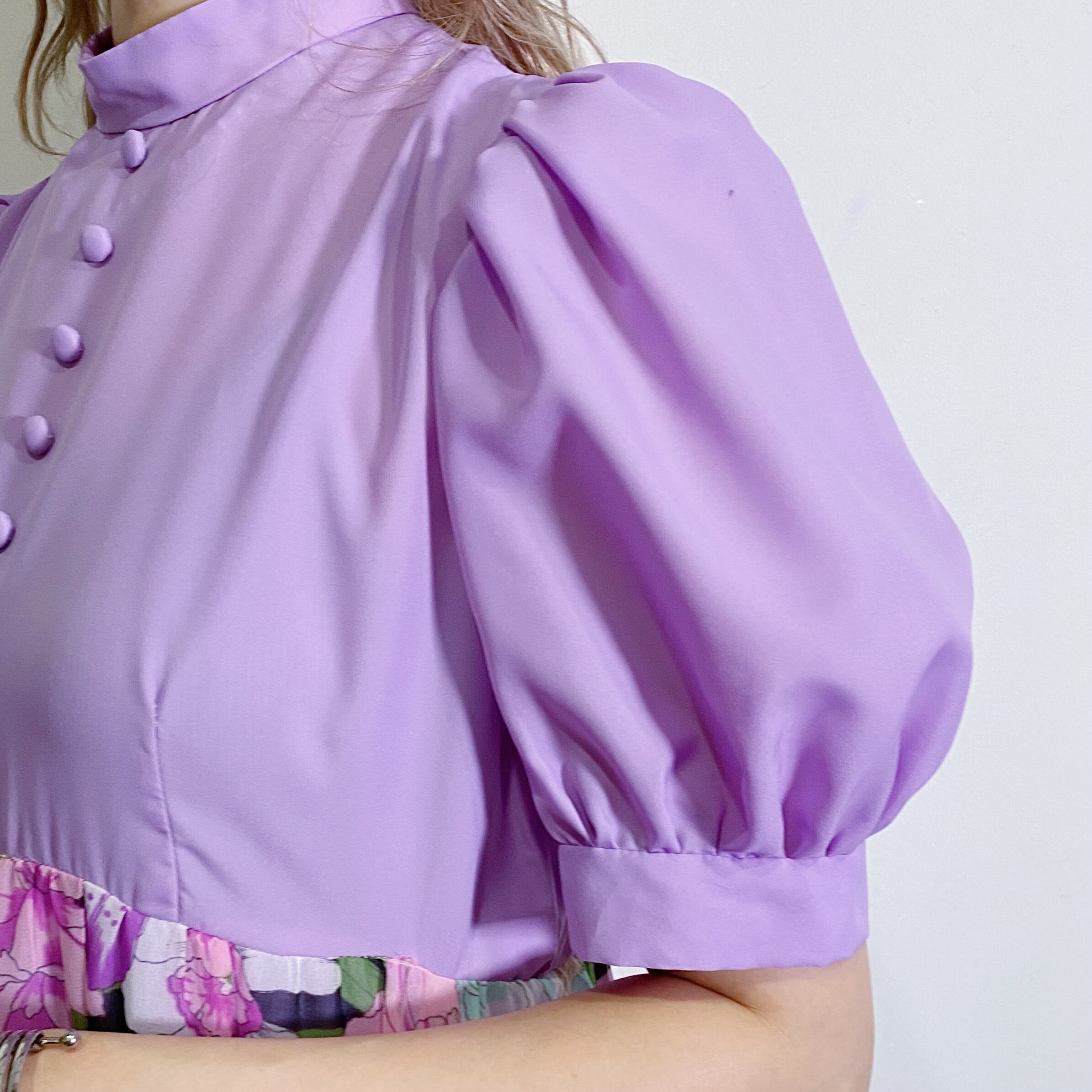 スタンドカラーのふわっと丸いお袖、ウエスト下からゆるやかに広がるラインなどキュートな一枚。