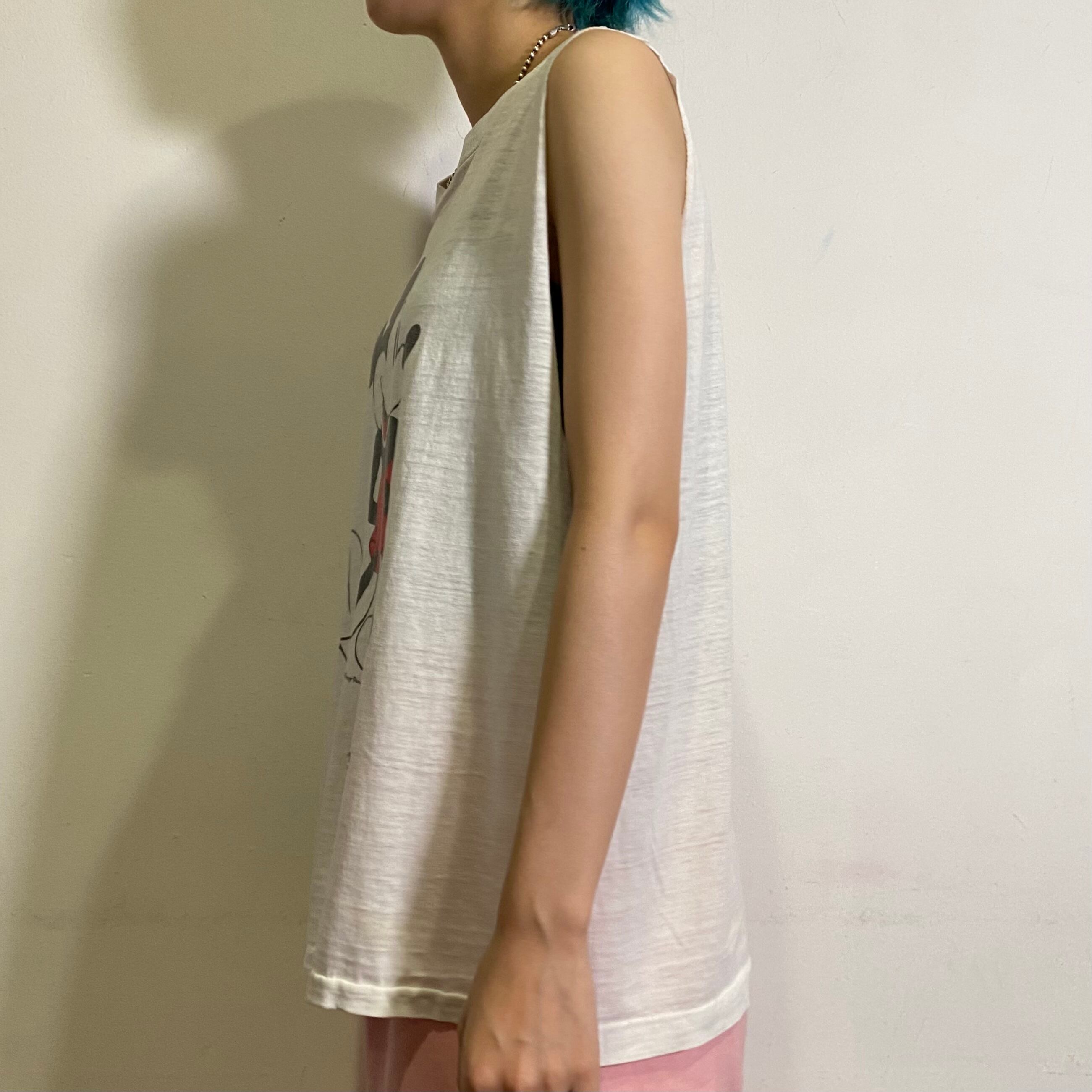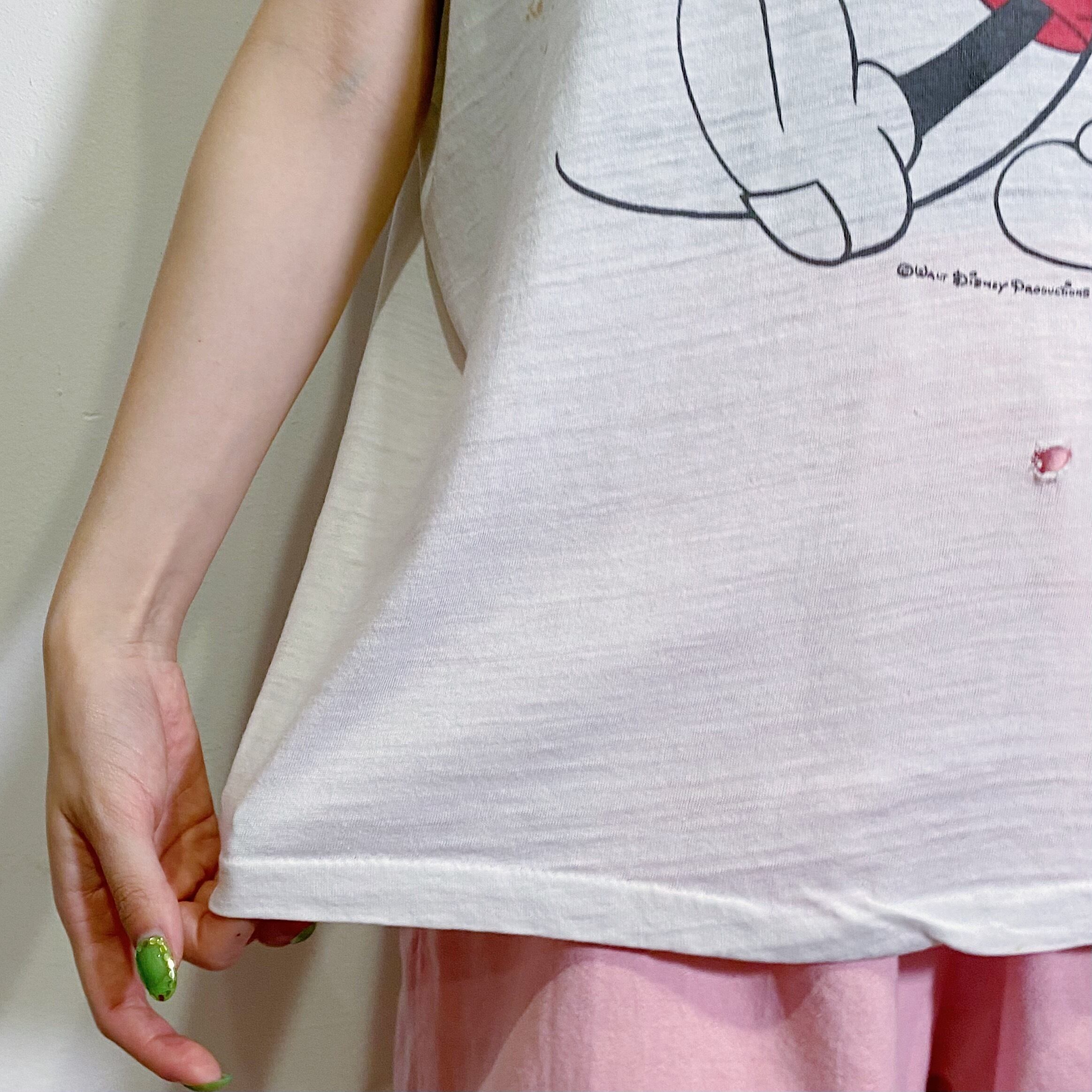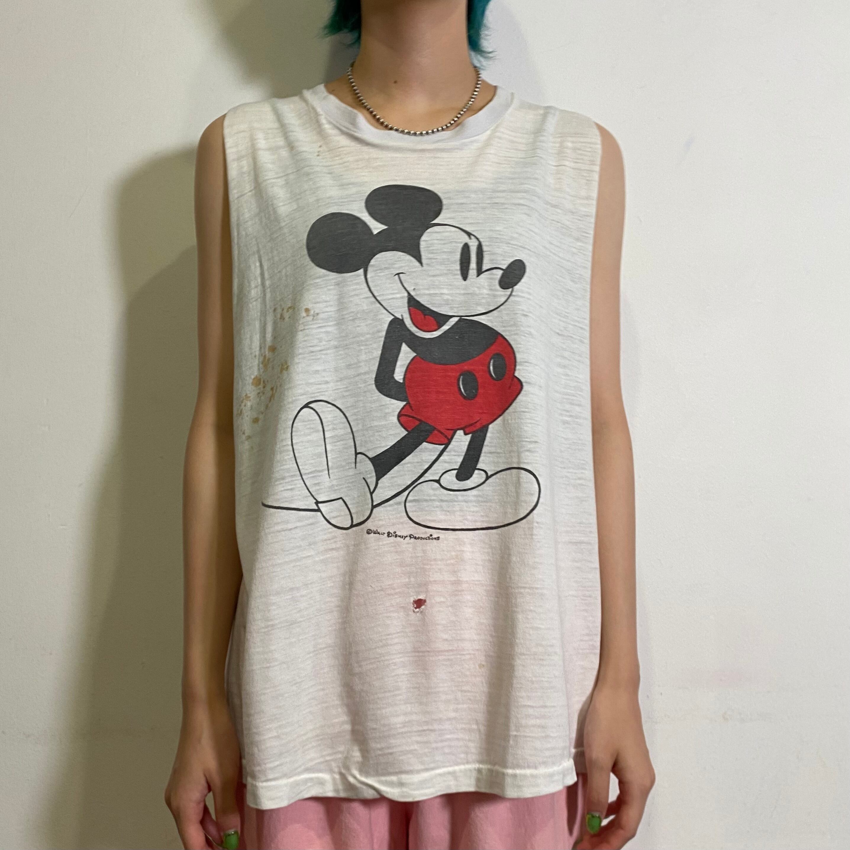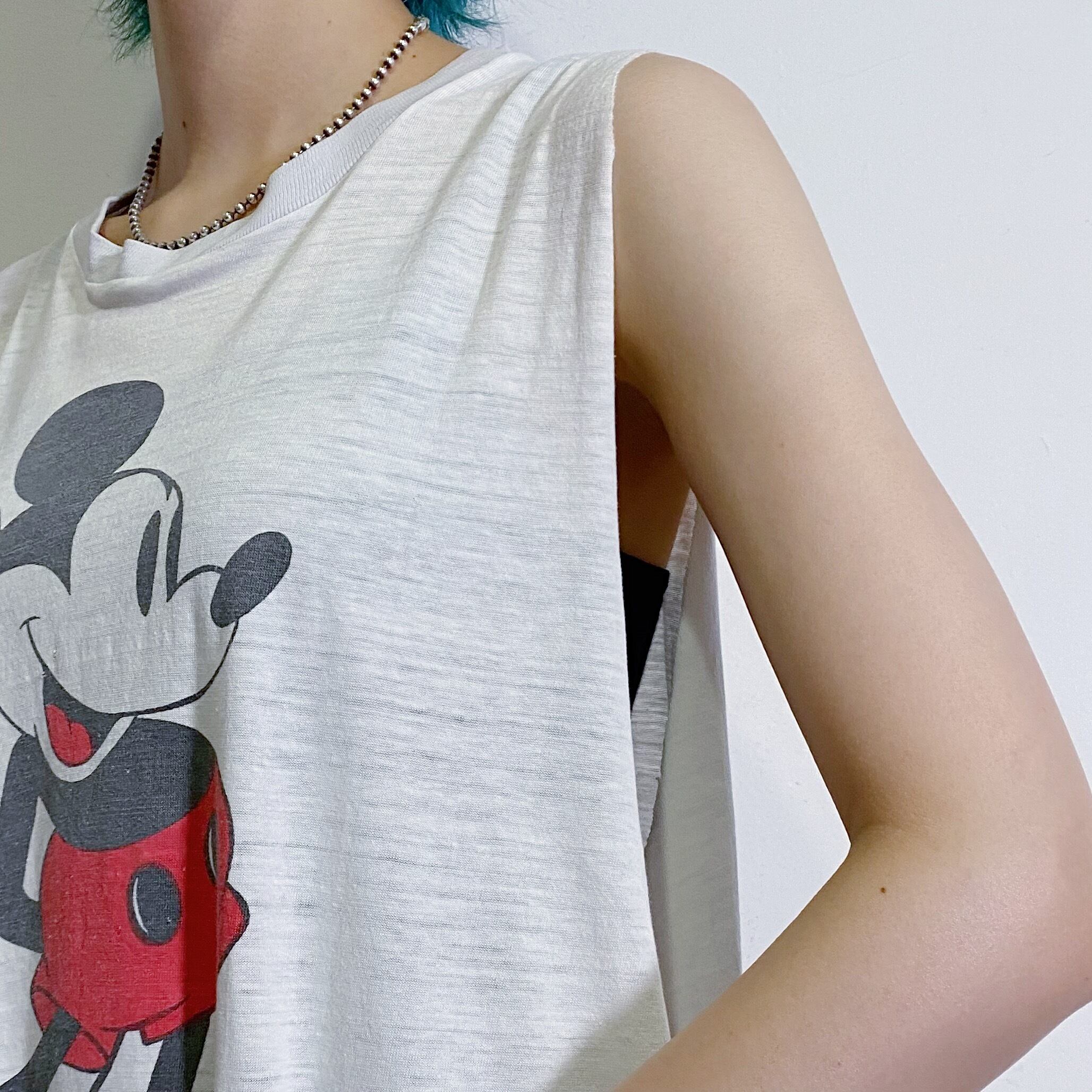 ミッキーのプリントが可愛い、袖が切りっぱなしになっているTシャツです。
