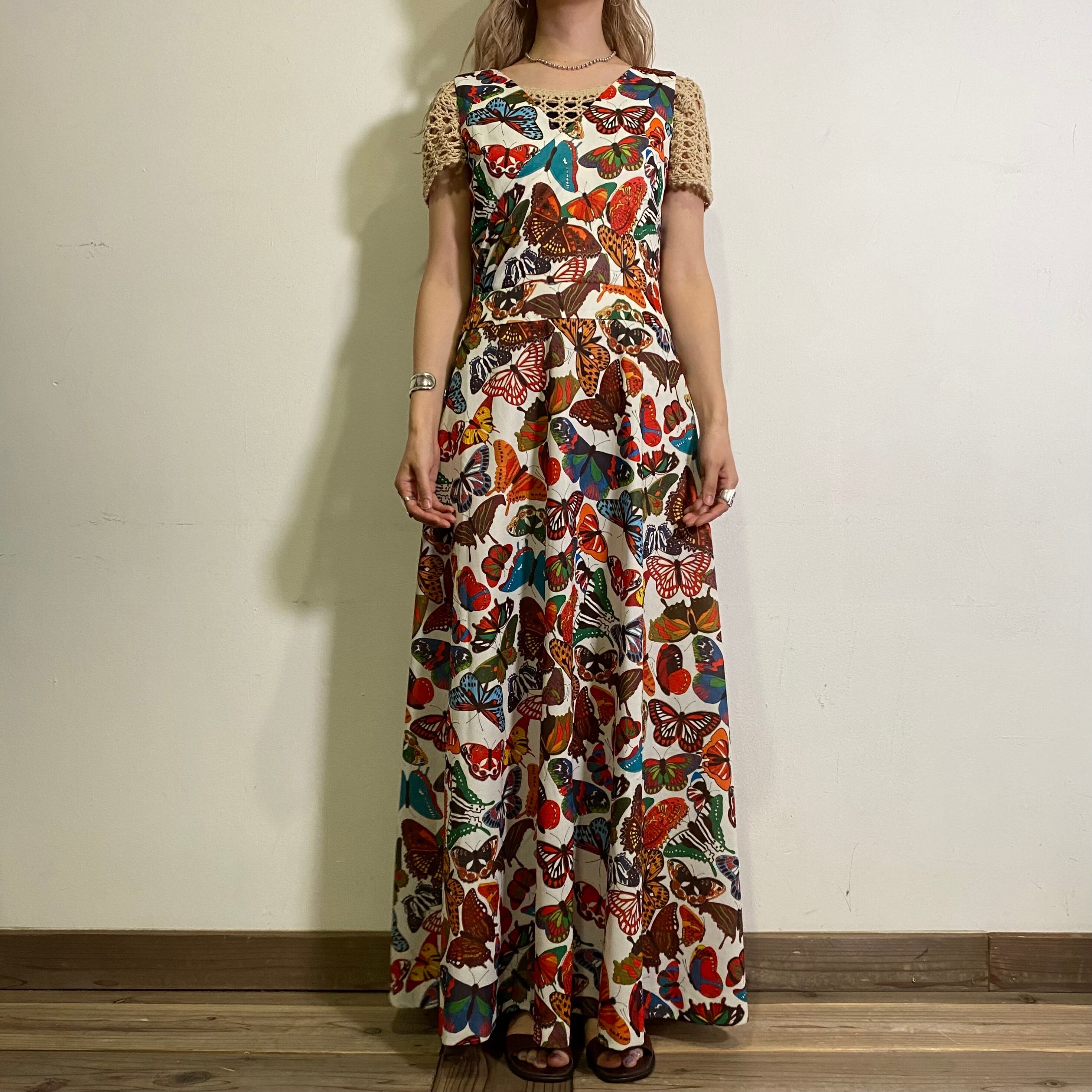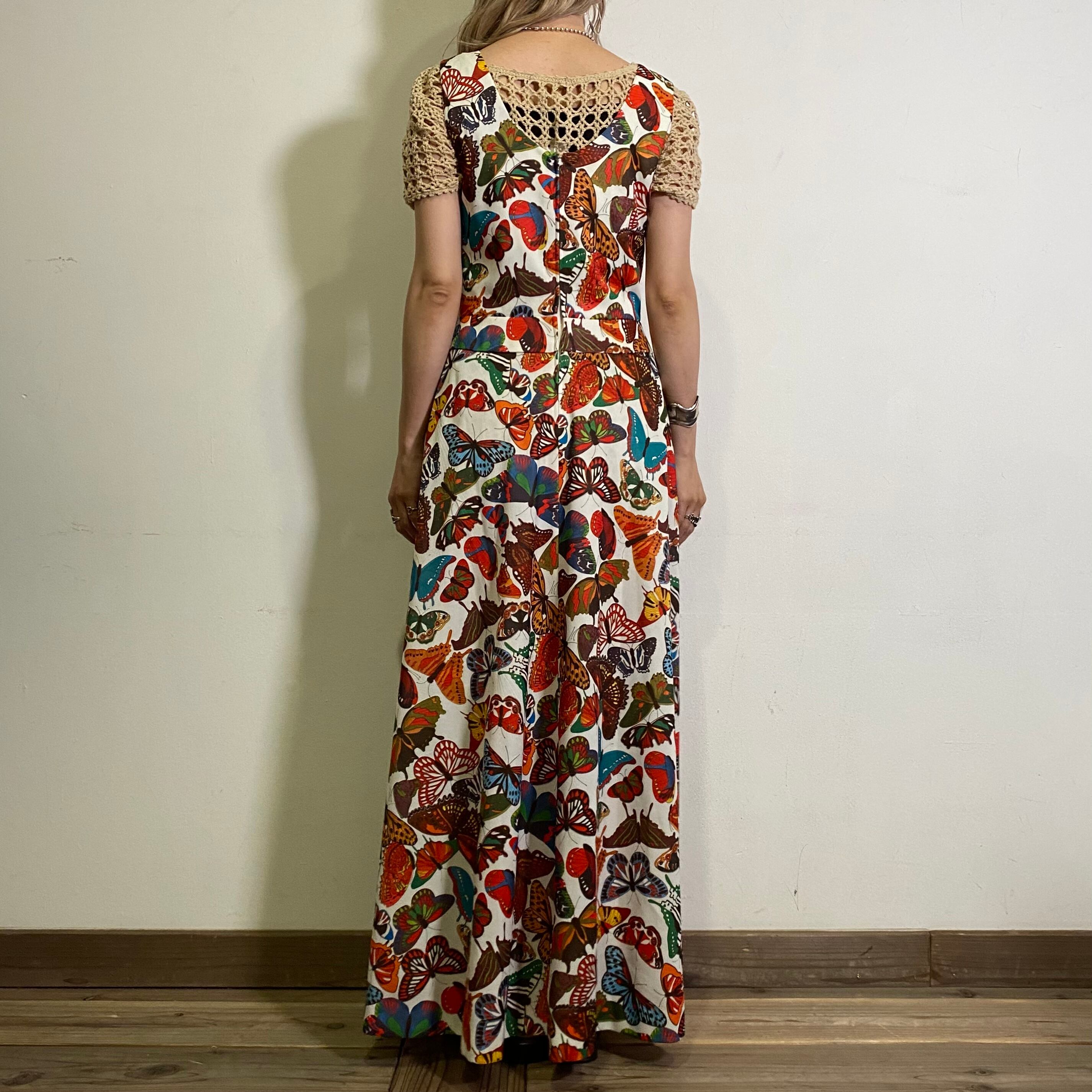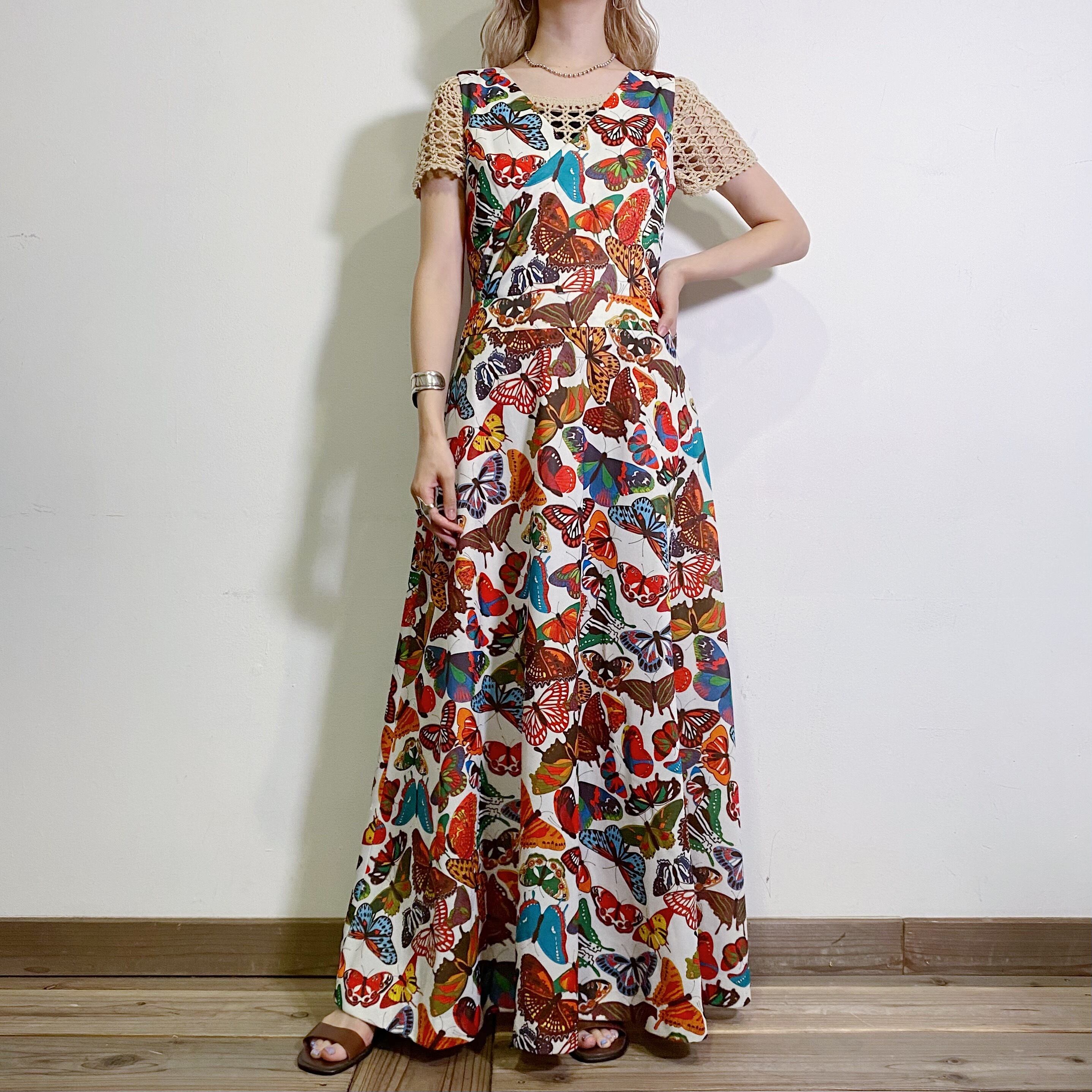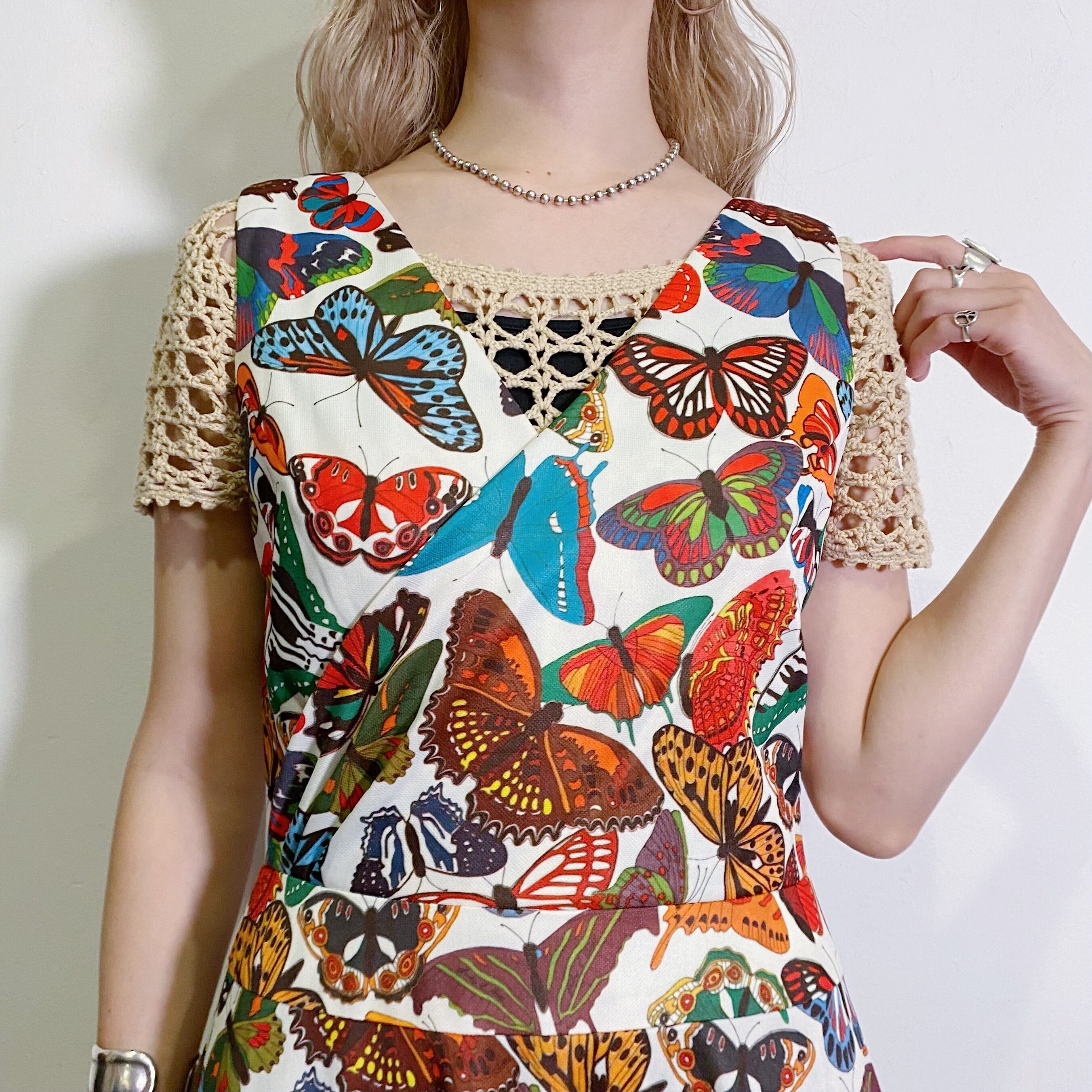 びっしりとプリントされたカラフルな蝶々がとっておきに可愛い、70年代のワンピースです。