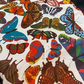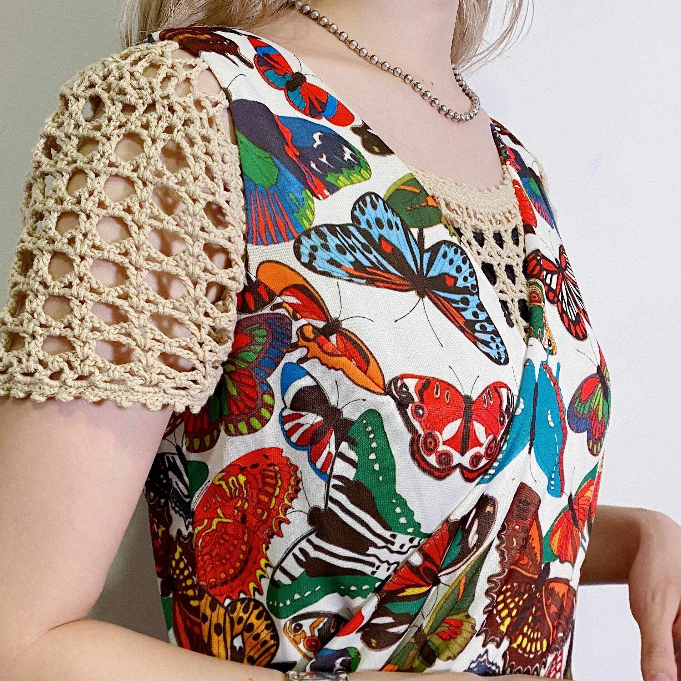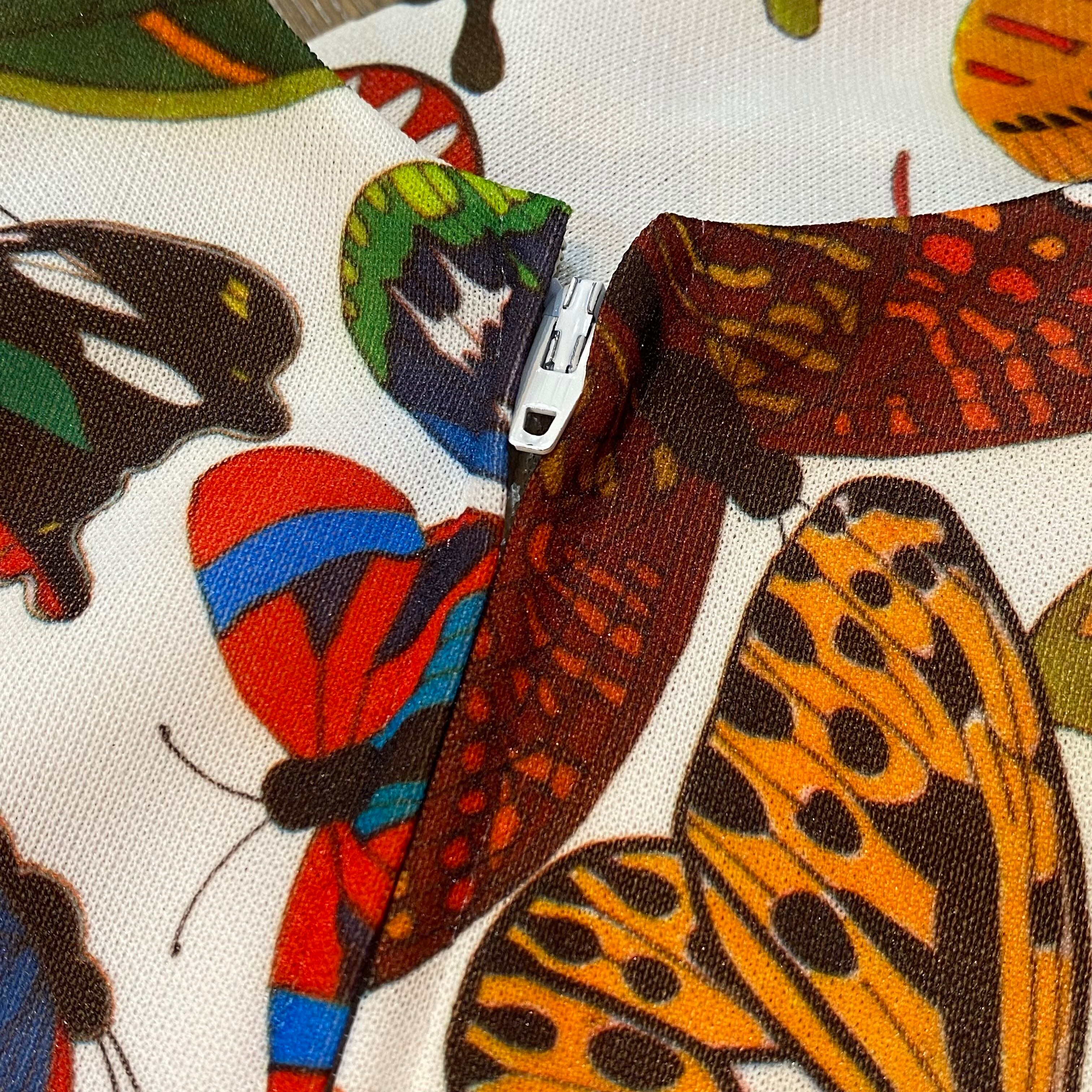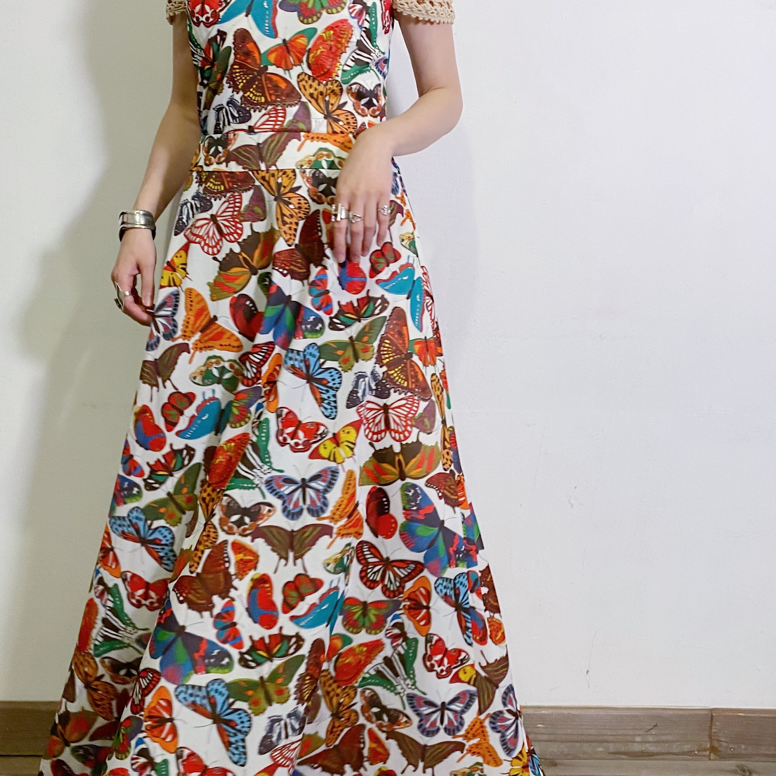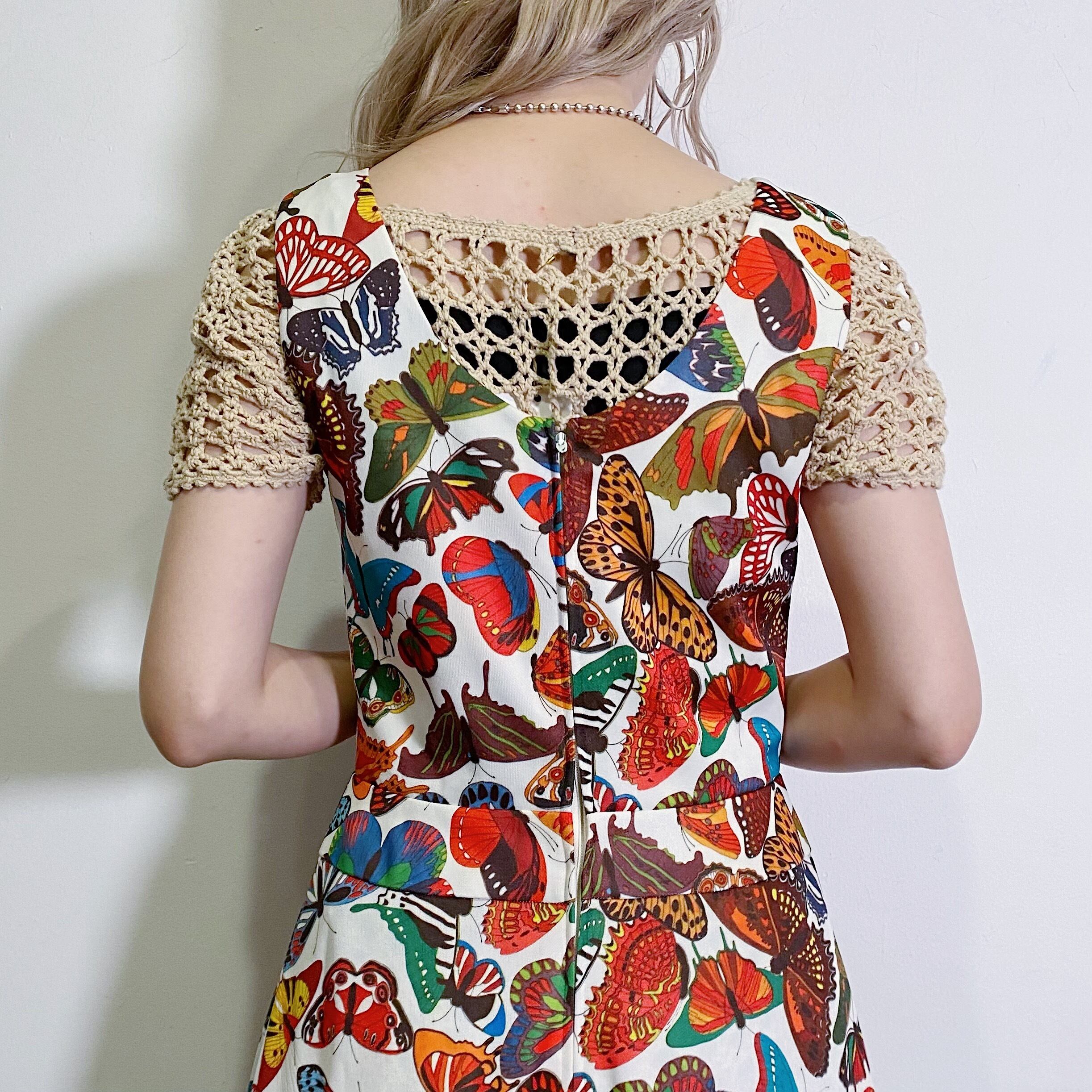 びっしりとプリントされたカラフルな蝶々がとっておきに可愛い、70年代のワンピースです。