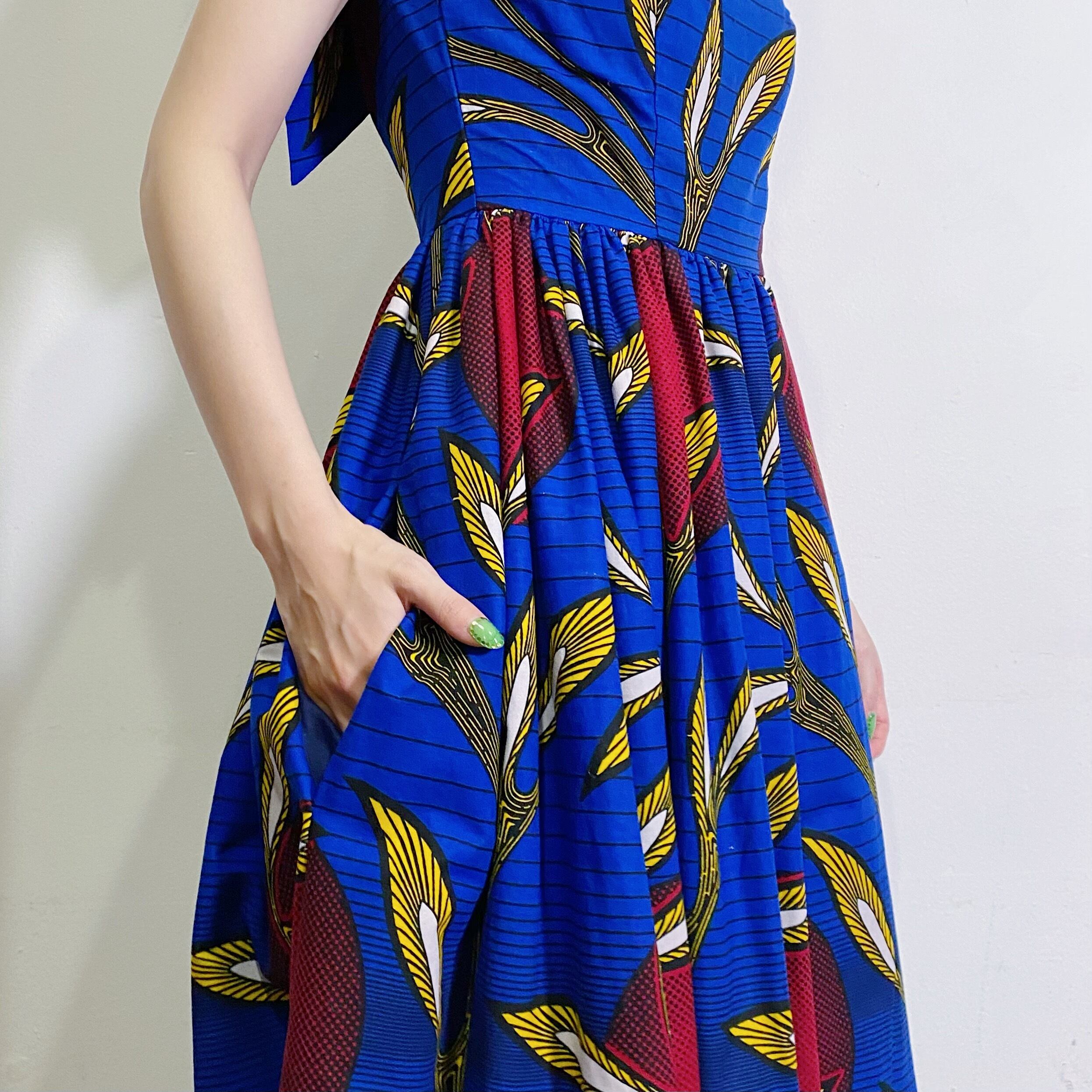 着た時の綺麗なフレアシルエットがとっても魅力な、アフリカンバティックのワンピースです。