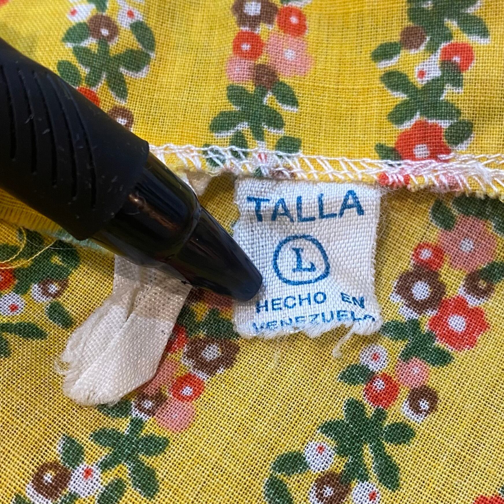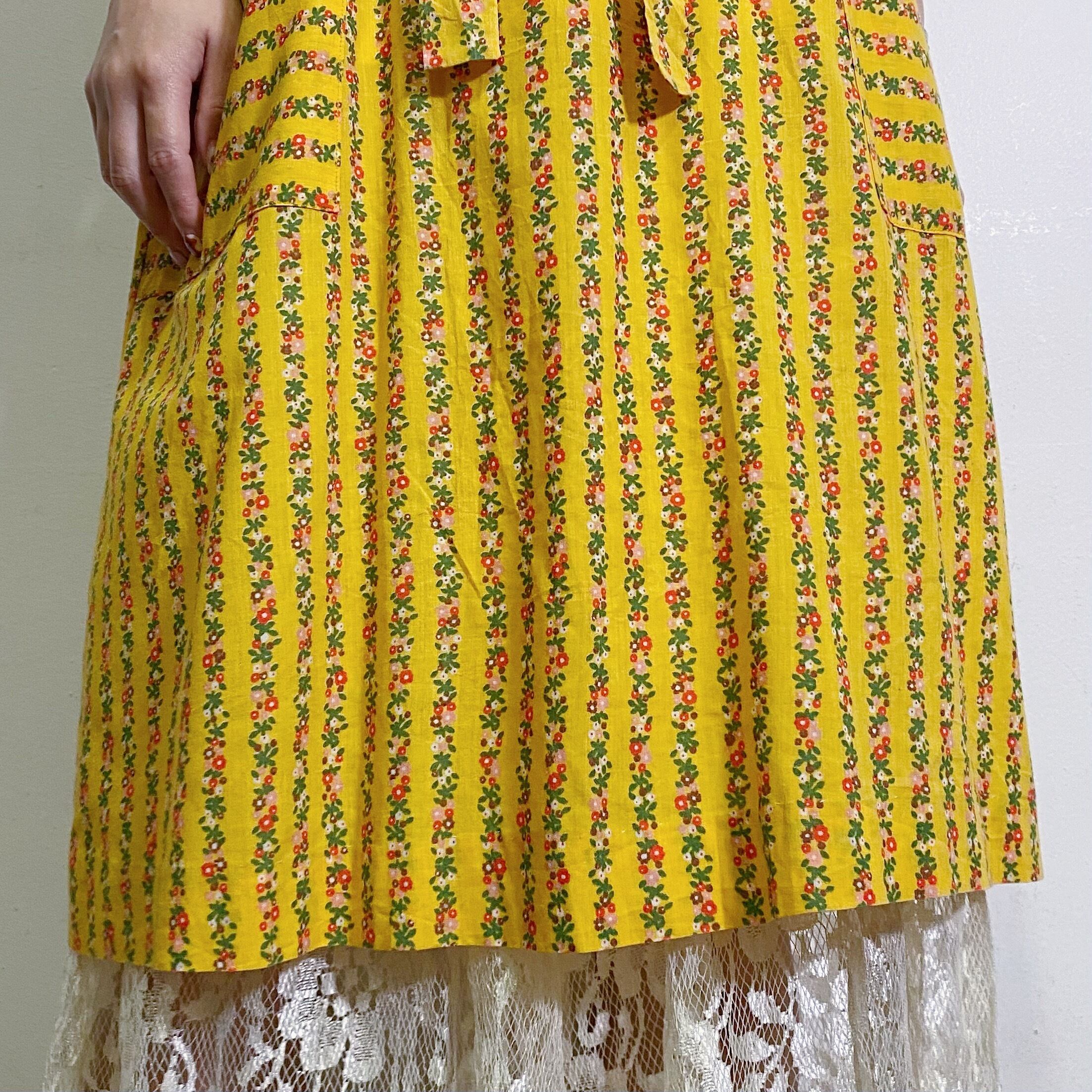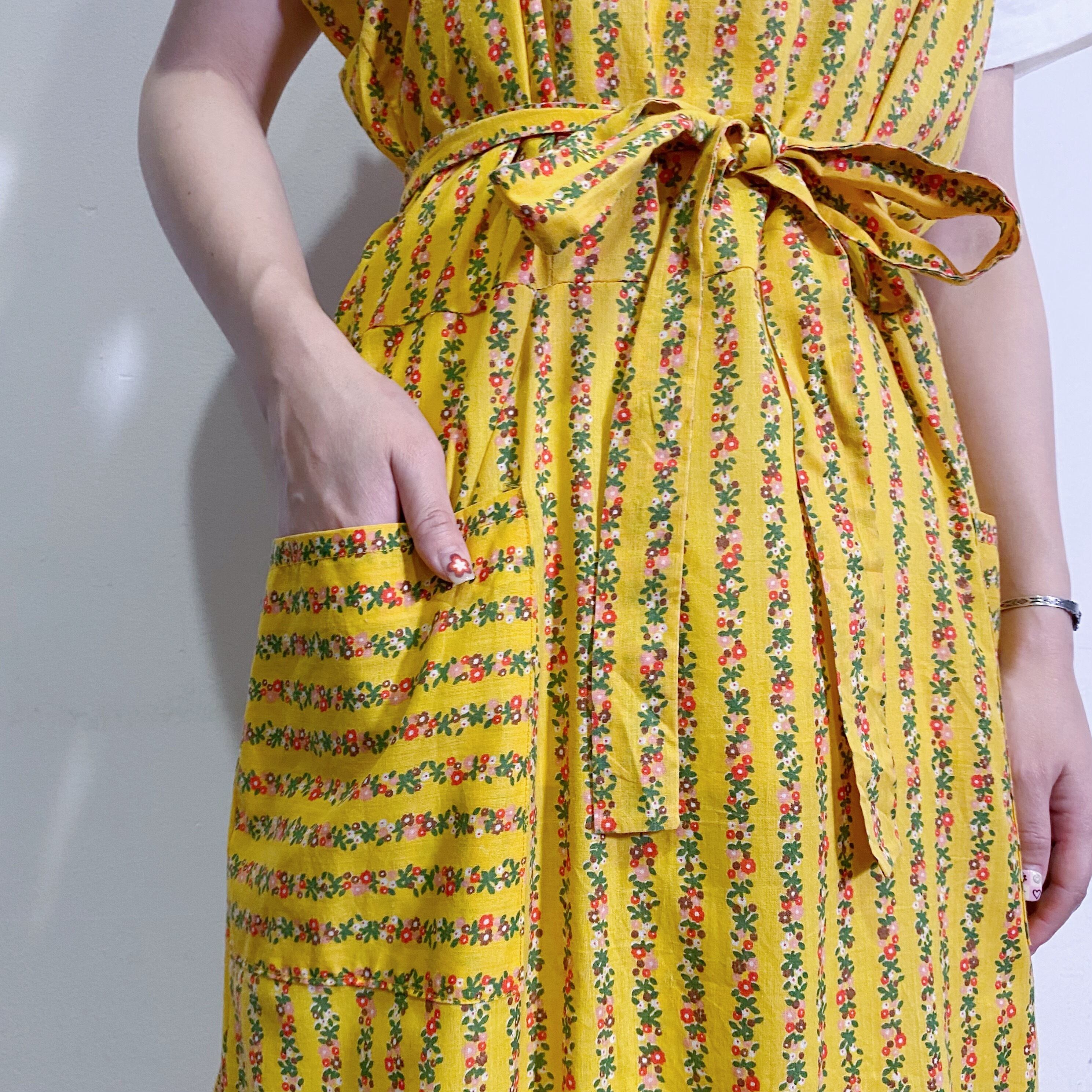 イエローベースの花柄が可愛い、70年代のエプロンワンピースです。