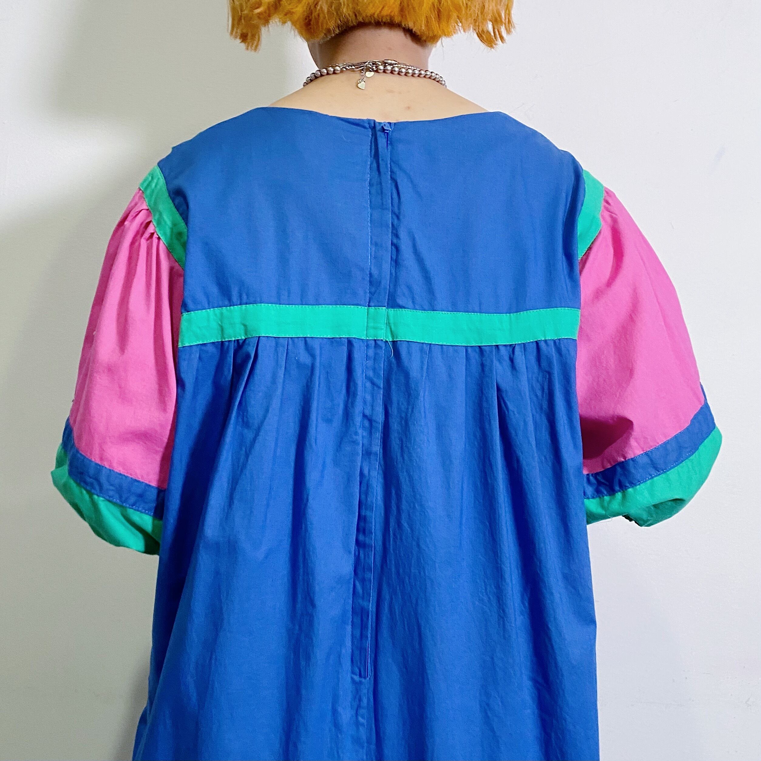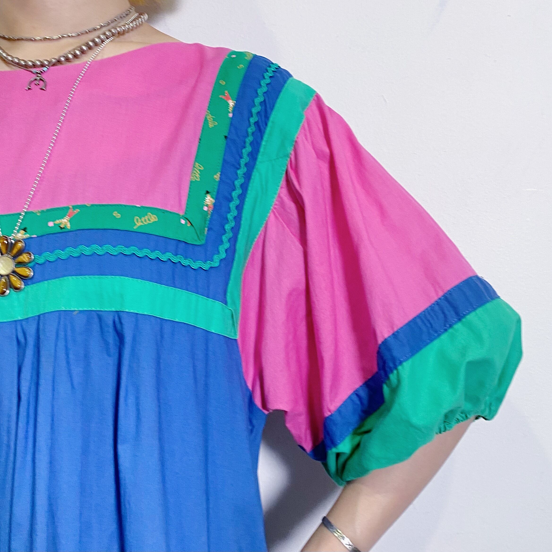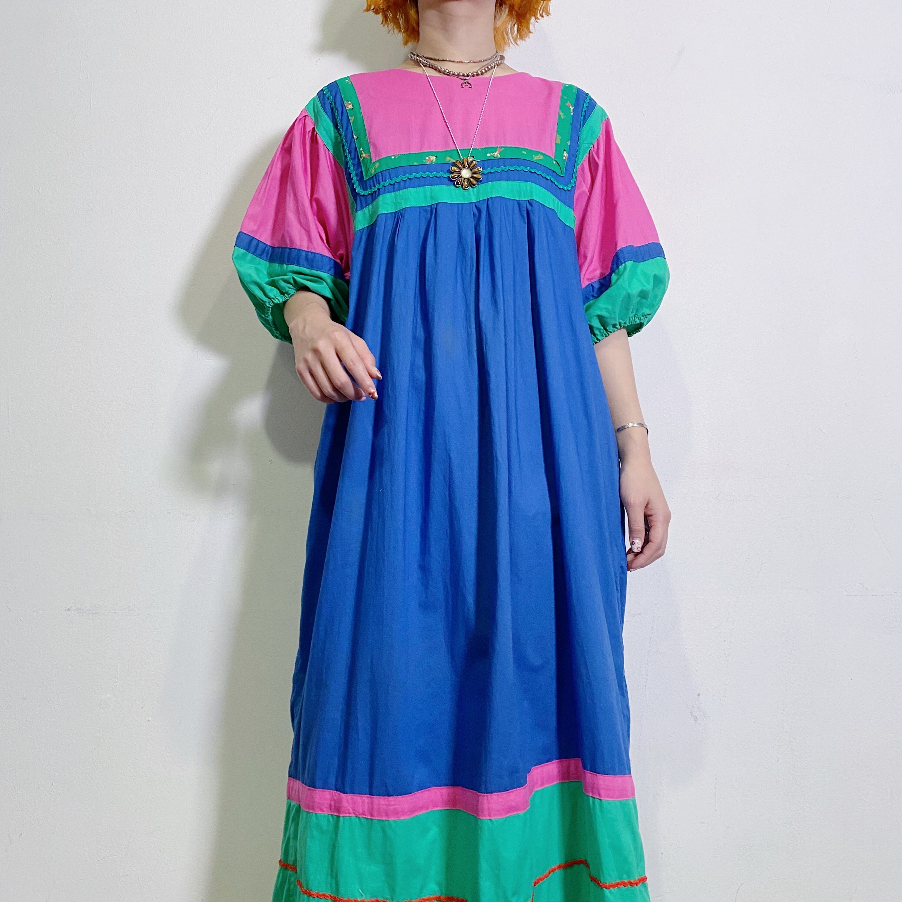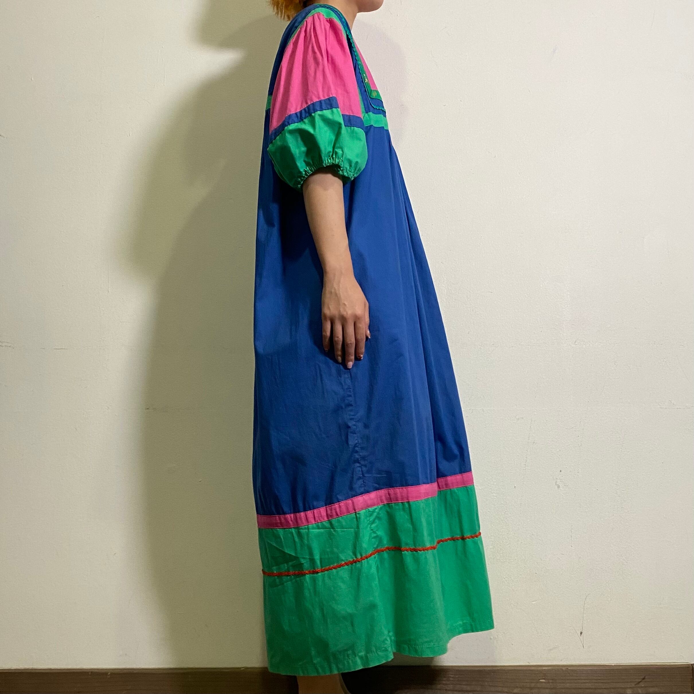 ピンク・グリーン・ブルーの色の組み合わせがとっても可愛い、70年代のロングワンピースです。