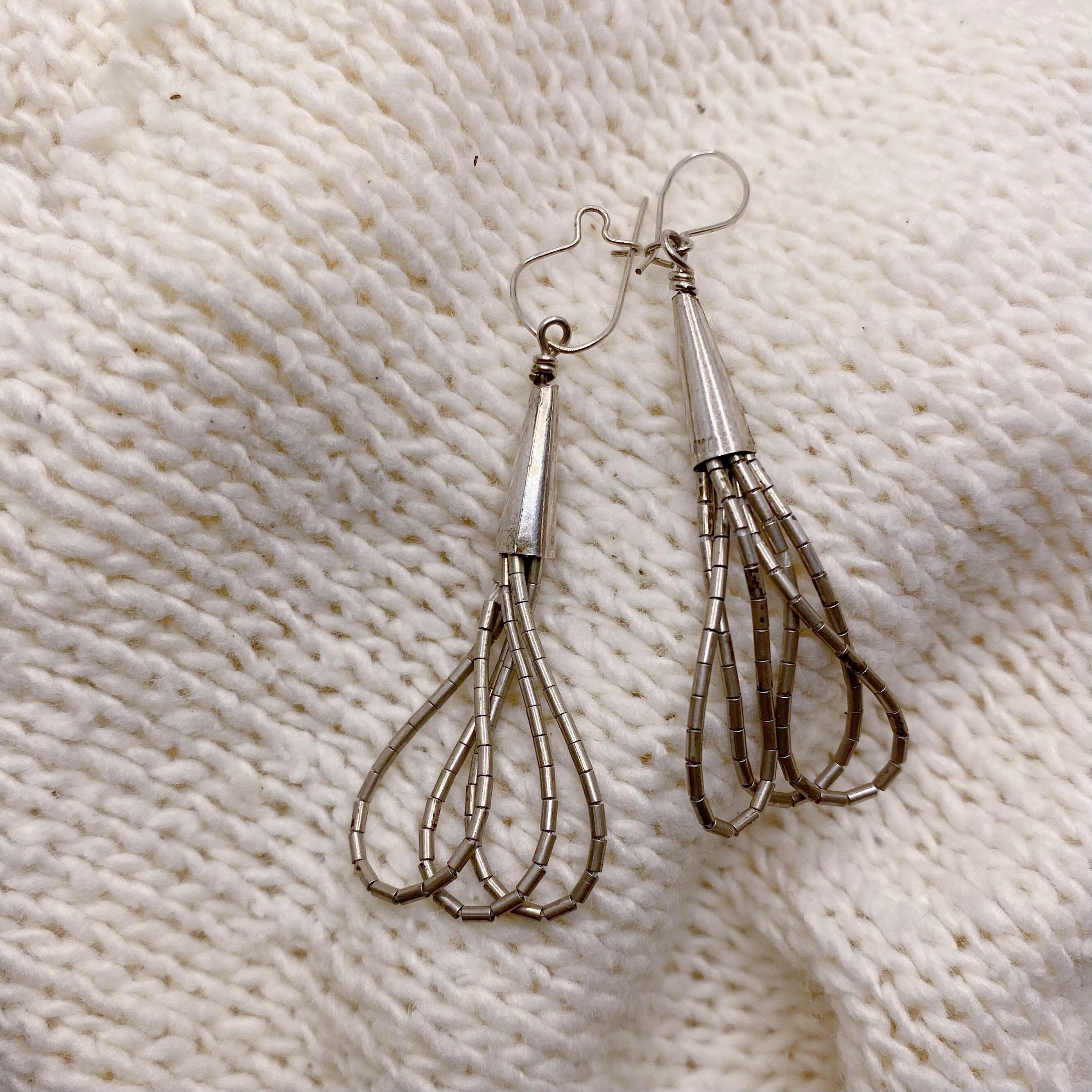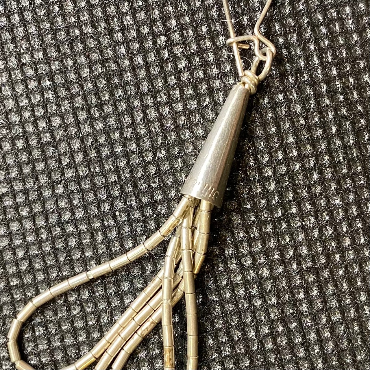 細いシルバーのビーズを紐状につなげデザインされた、一見シンプルながら実は凝ったデザイン。